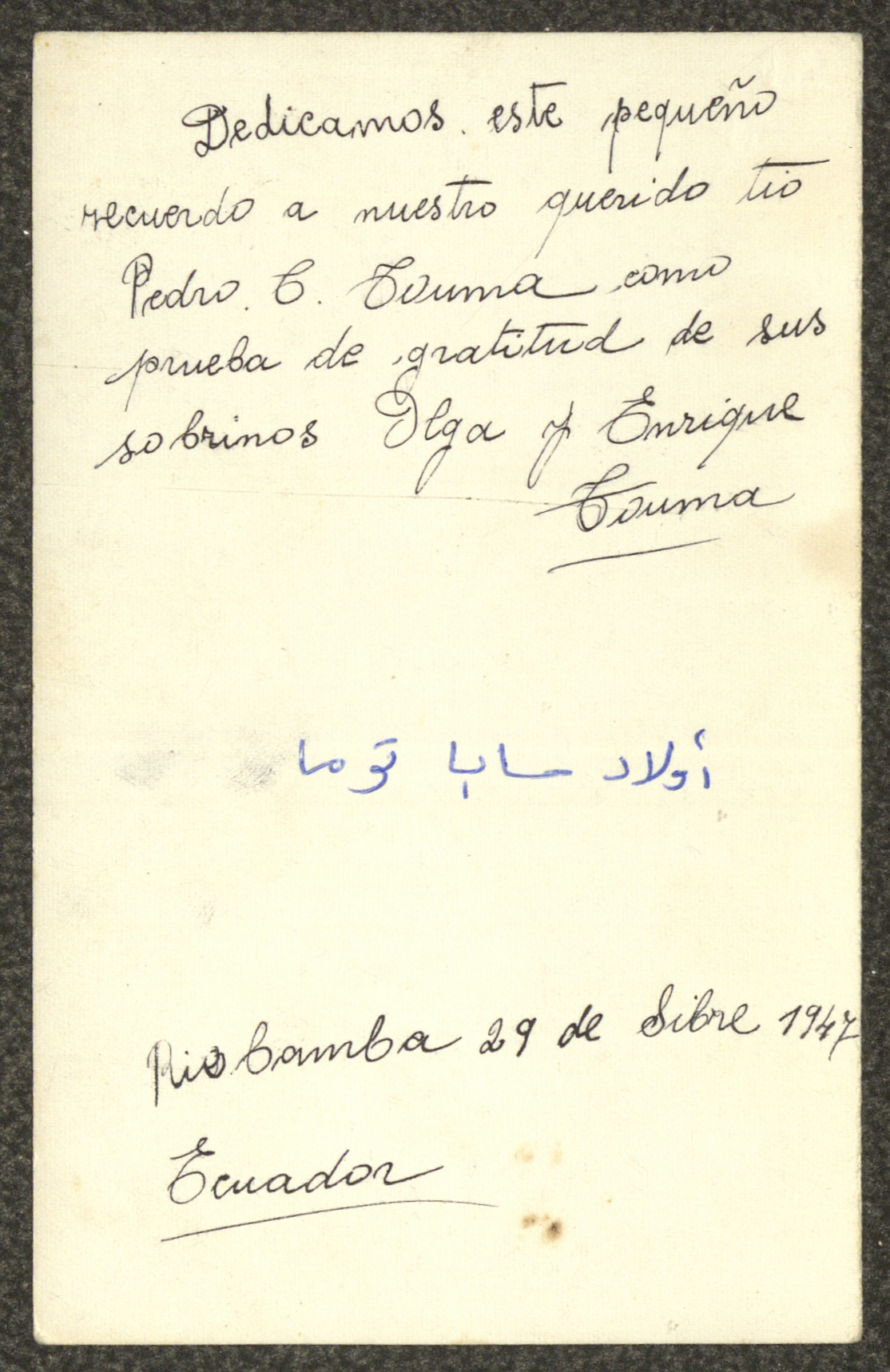Taken in Ecuador on 29 December 1947, this document shows a postcard with a photograph of Olga and Enrique Saba Touma, which was sent with a letter written in Spanish on the back to family and relatives in Beit Jala.