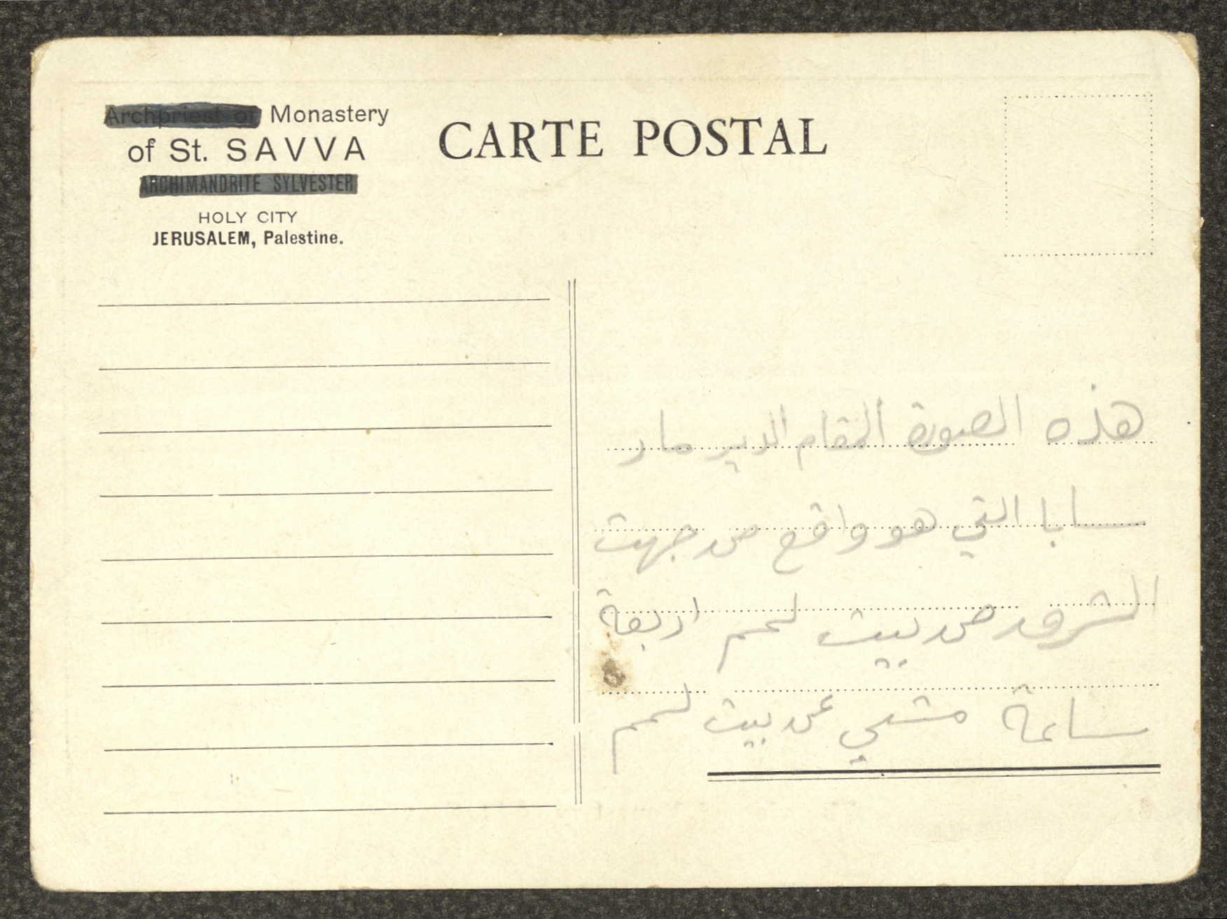 بطاقة بريدية تحمل صورة لدير مار سابا، في بلدة العبيدية شرقي مدينة بيت لحم. كُتب خلف البطاقة شرح للمدة الزمنية التي يبعدها الدير عن بيت لحم، إذا ما أراد الشخص التوجه لها سيرًا على الأقدام، يُذكر أنها التُقطت في أربعينيات القرن العشرين.