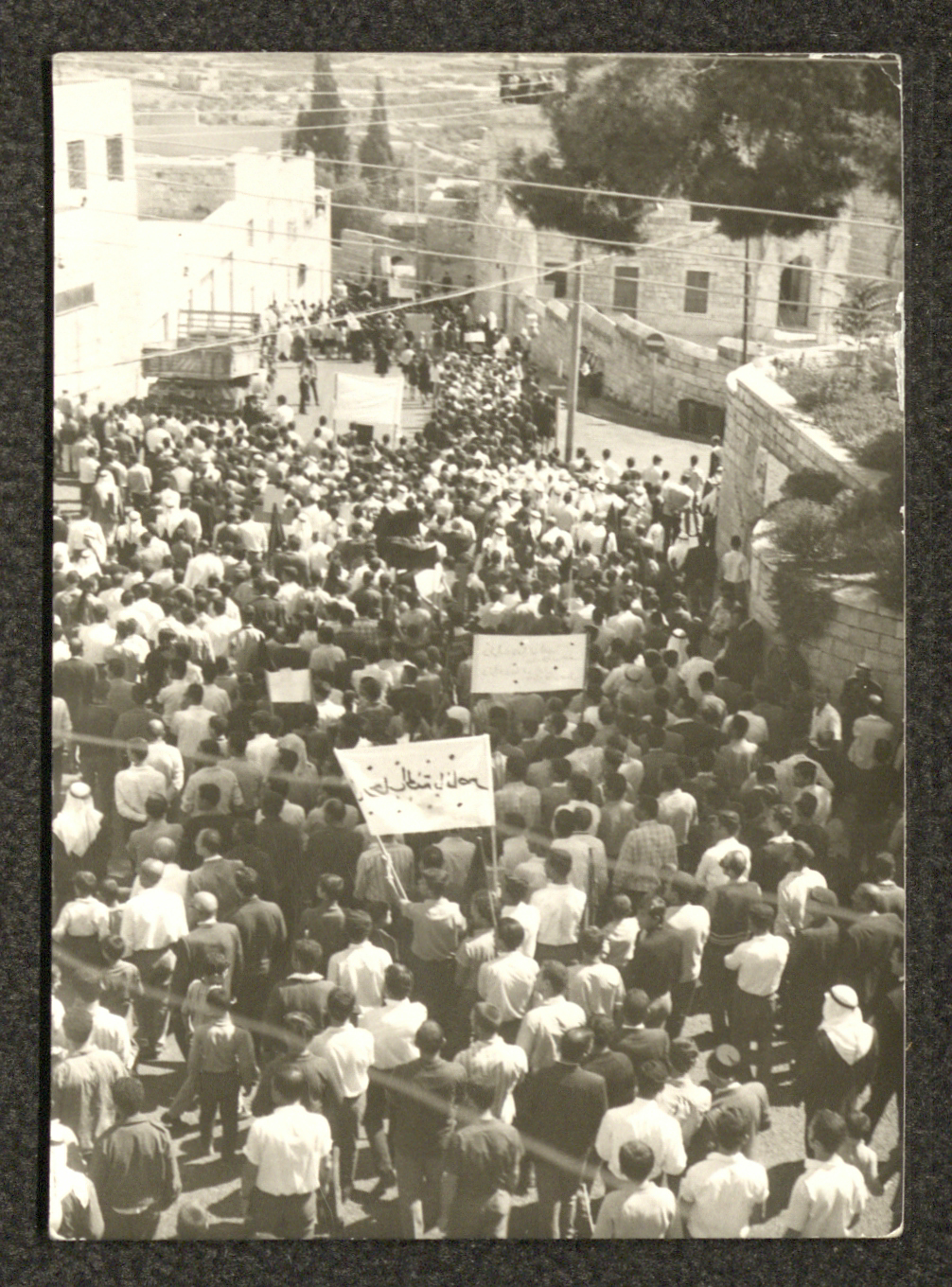 Taken in late September 1970, this photograph shows several of the residents in Beit Jala participating in the symbolic funeral of the Egyptian President Gamal Abdel Nasser in Beit Jala, as the participants appear to be lifting posters and photographs of Abdel Nasser.