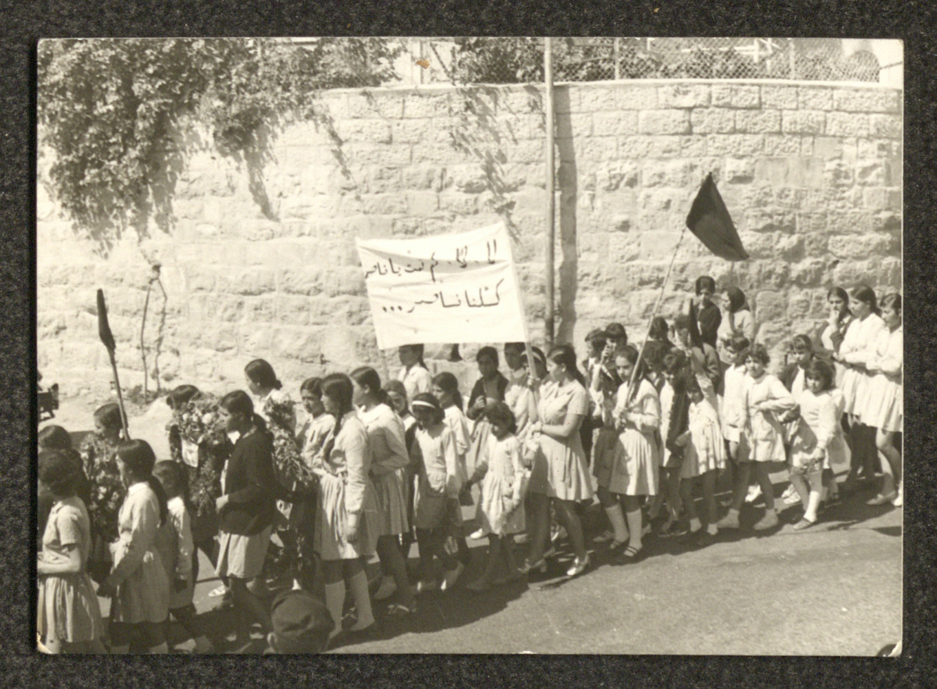 Taken in late September 1970, this photograph shows several Beit Jala school students participating in the symbolic funeral of the Egyptian President Gamal Abdel Nasser in Beit Jala, as they appear to be lifting posters and black flags.