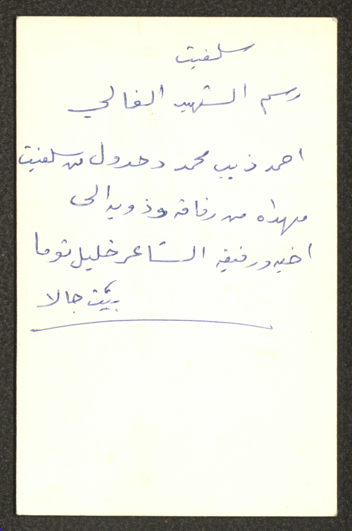Taken at a studio during the 1970s, this portrait shows shaheed Ahmad Dahdoul, on the back, the shaheed's family wrote a message to Khalil Touma.
