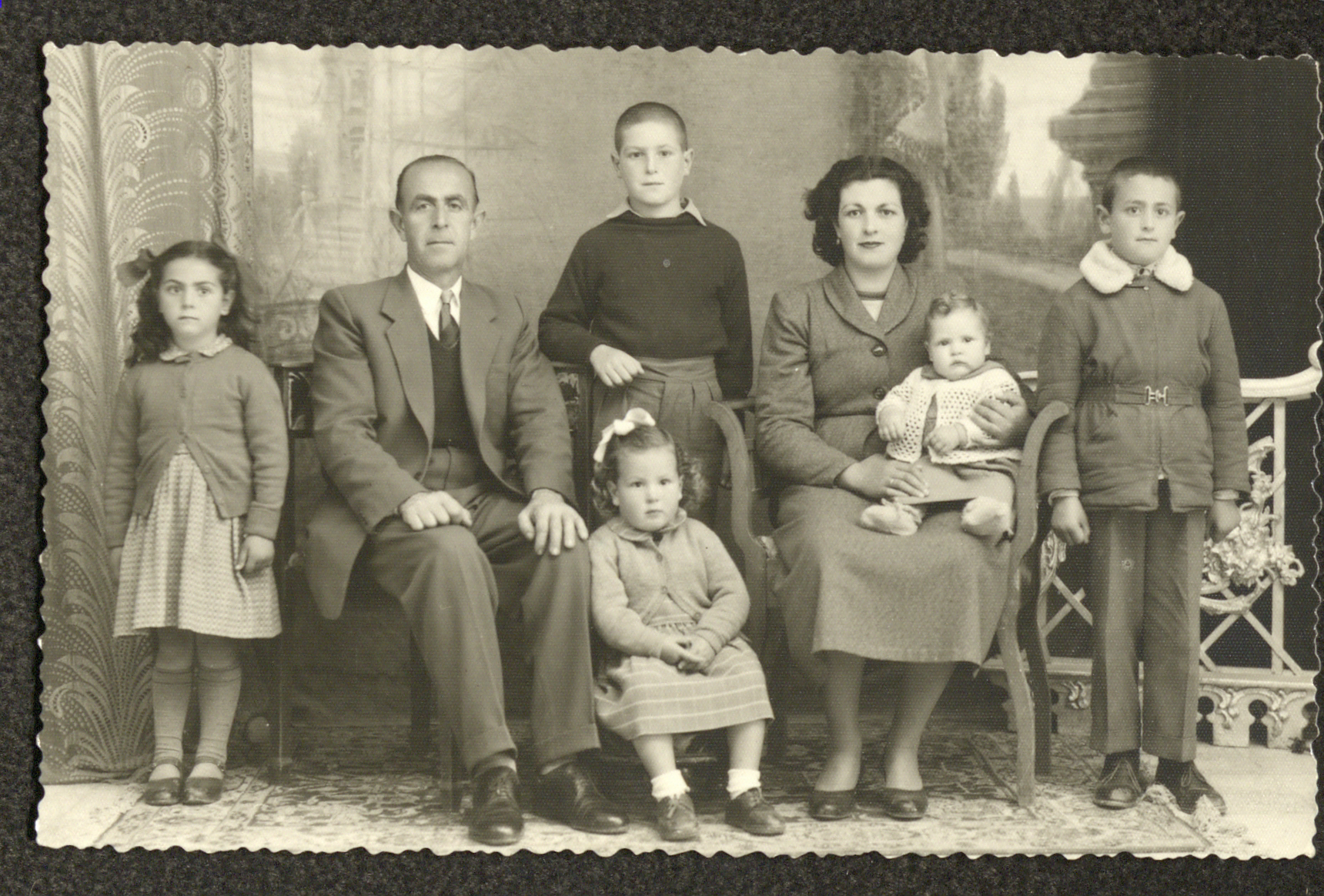 Taken at Studio Shamieh in Bethlehem in 1956, this photograph shows Olga Ilyas al-Masu, her husband Jeries Khalil Touma and their children, Ilyas, Lucy, Camillia, Carlos and Marcel.
