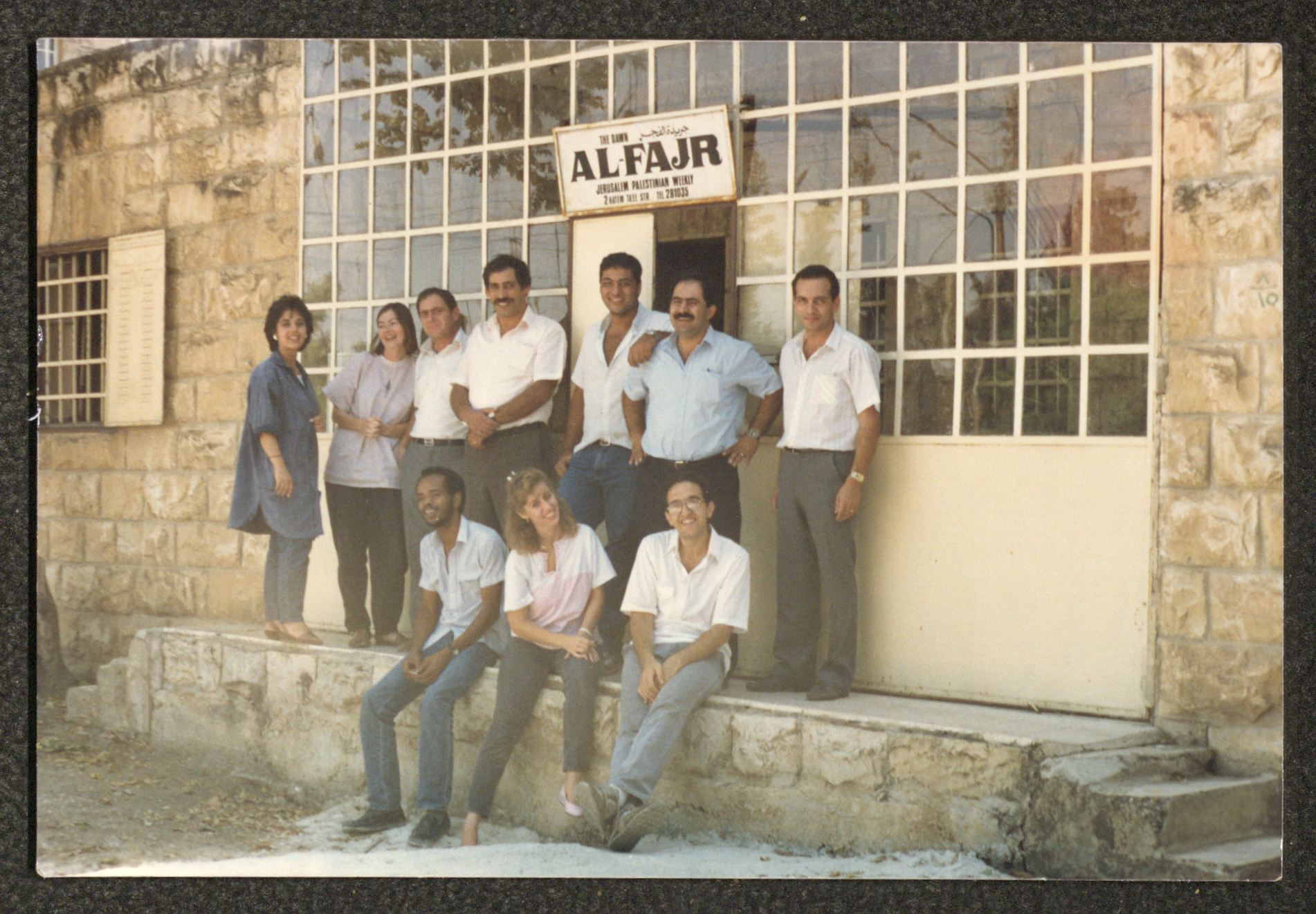 This photograph shows Khalil Touma and a group of people in front of the English al-Fajr Newspaper building in Jerusalem, which was issued weekly. It was mentioned that Touma was the editor-in-chief of the English version of the Newspaper.