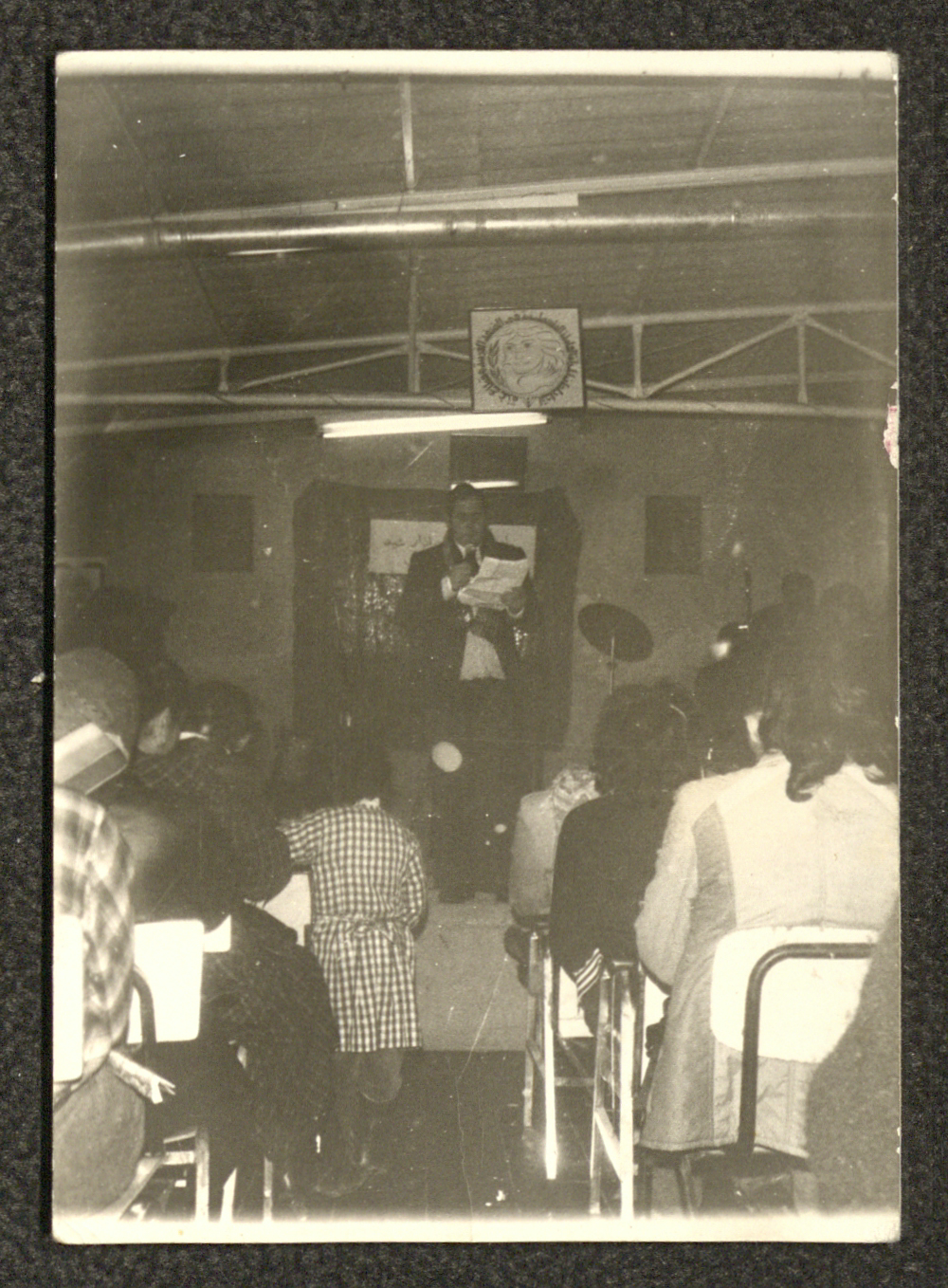 This photograph shows Khalil Touma reciting poetry at a celebration held by the Working Women Society on Women's Day, 8 March 1983.
