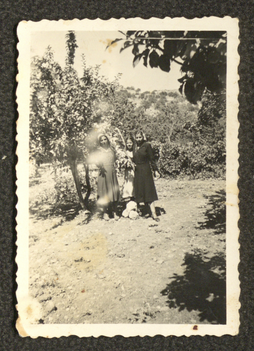 Taken during the 1930s, this photograph shows Onsura, Ne'ma and Milada Saliba Touma in the family orchard in the town of Beit Jala.
