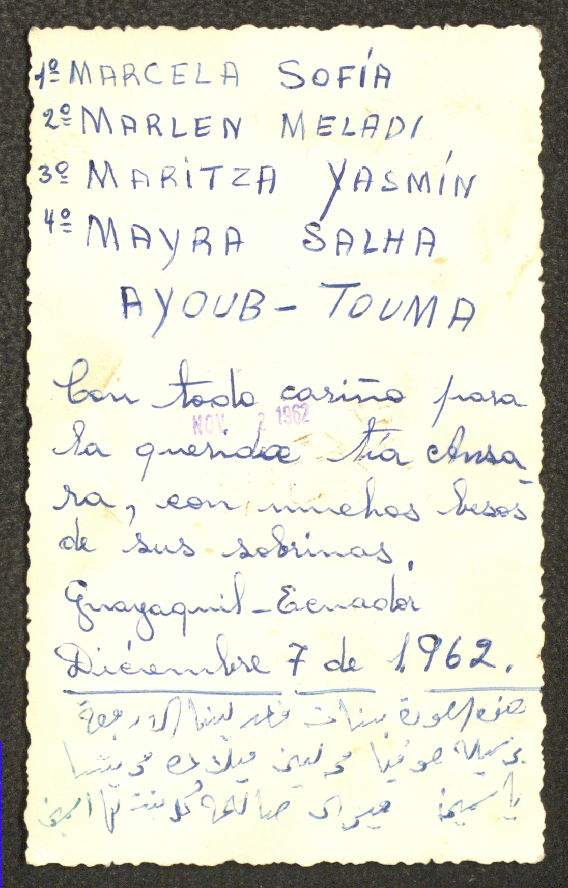 Taken at a studio in 1962, this photograph shows four girls related to the Touma Family abroad.