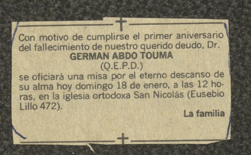 Printed in Spanish, this document shows the announcement of Dr. Abdo Touma's first-year commemoration ceremony on Sunday 18 January at 12:00 PM at the Saint Nicholas Orthodox Church (Eusebio - Lillo).