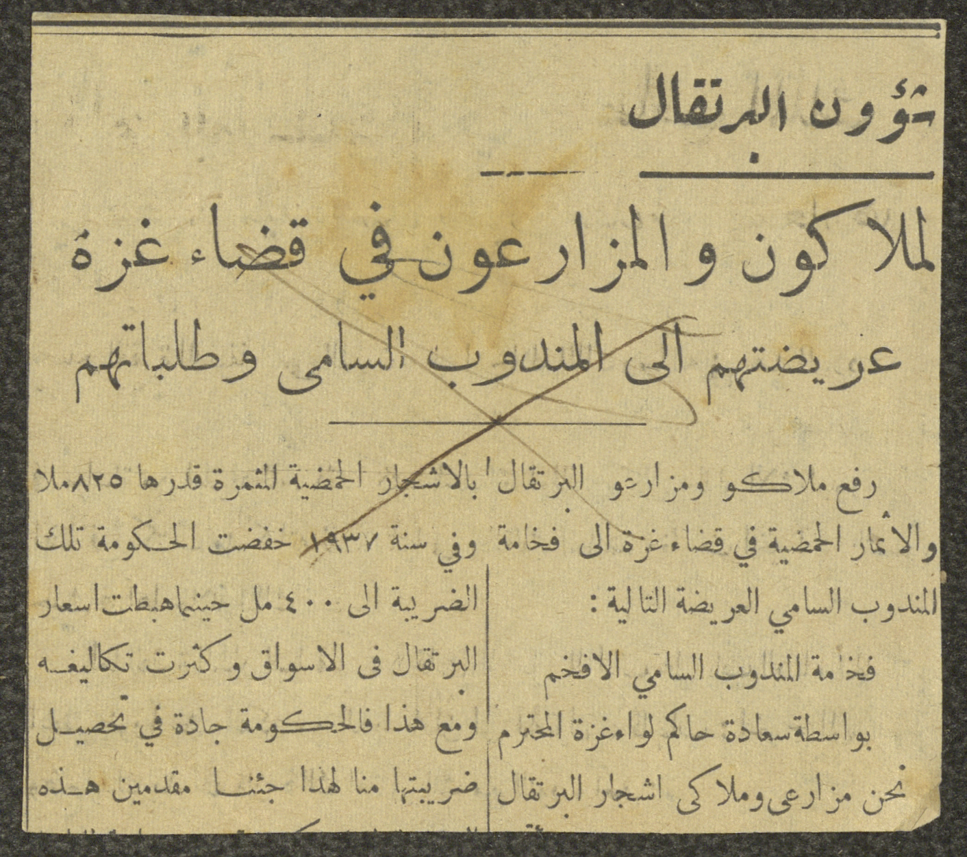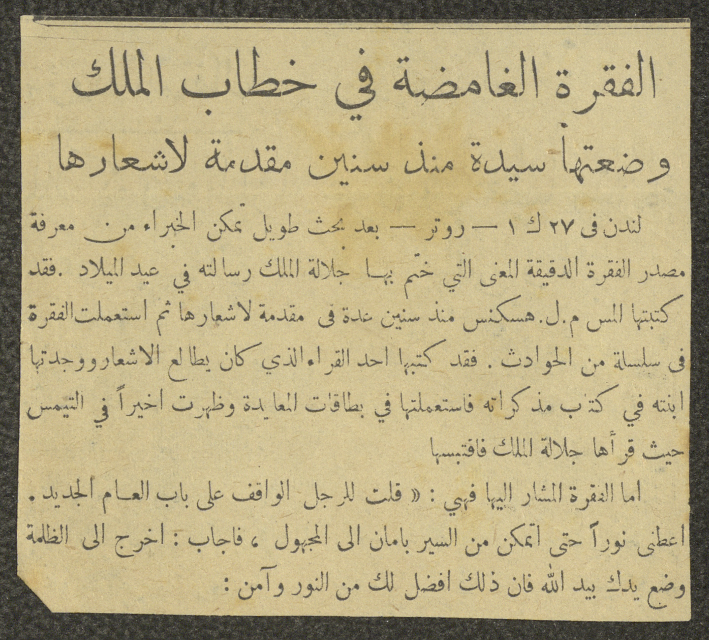 Issued in the early 1940s, this document shows a newspaper clipping issued in Palestine showing a news piece titled "the Mysterious Part of King George's 6th Speech" on welcoming the new year. The back face of the clipping shows another piece of news on the orange farmers in Gaza.