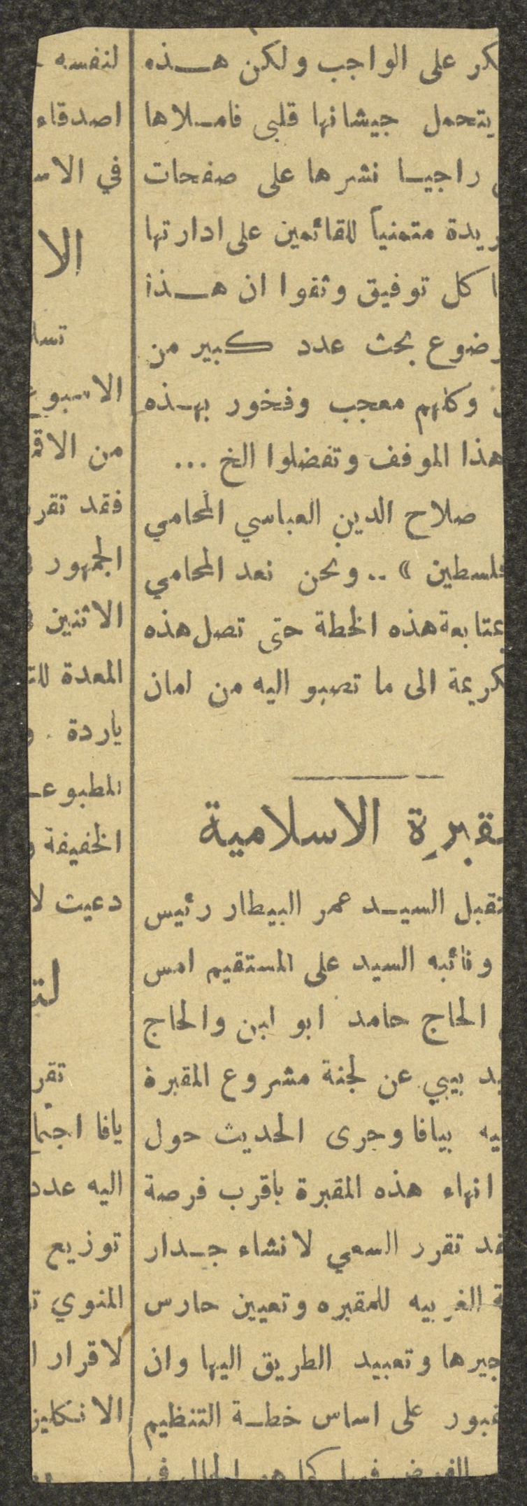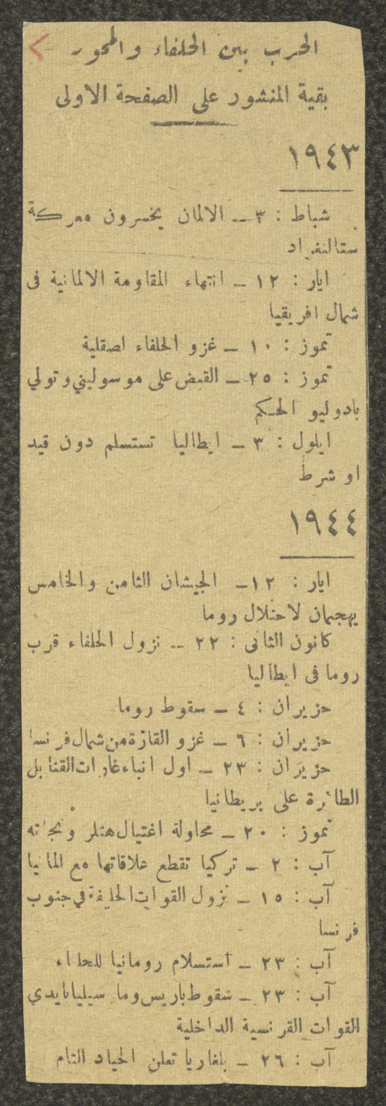 قصاصة من عدد من صحيفة نشرت في فلسطين بتاريخ 3 أيلول 1944 احتوت على تابع لملخص لأهم أحداث الحرب العالمية الثانية التي وقعت ما بين عام 1939 وحتى 1945.