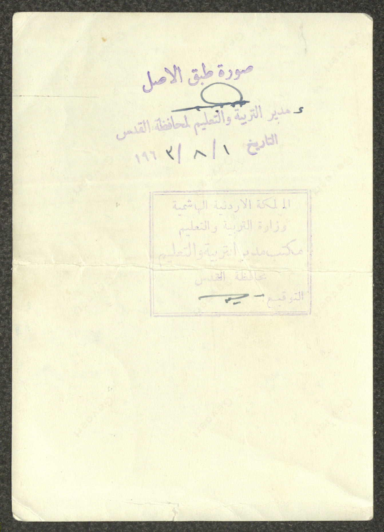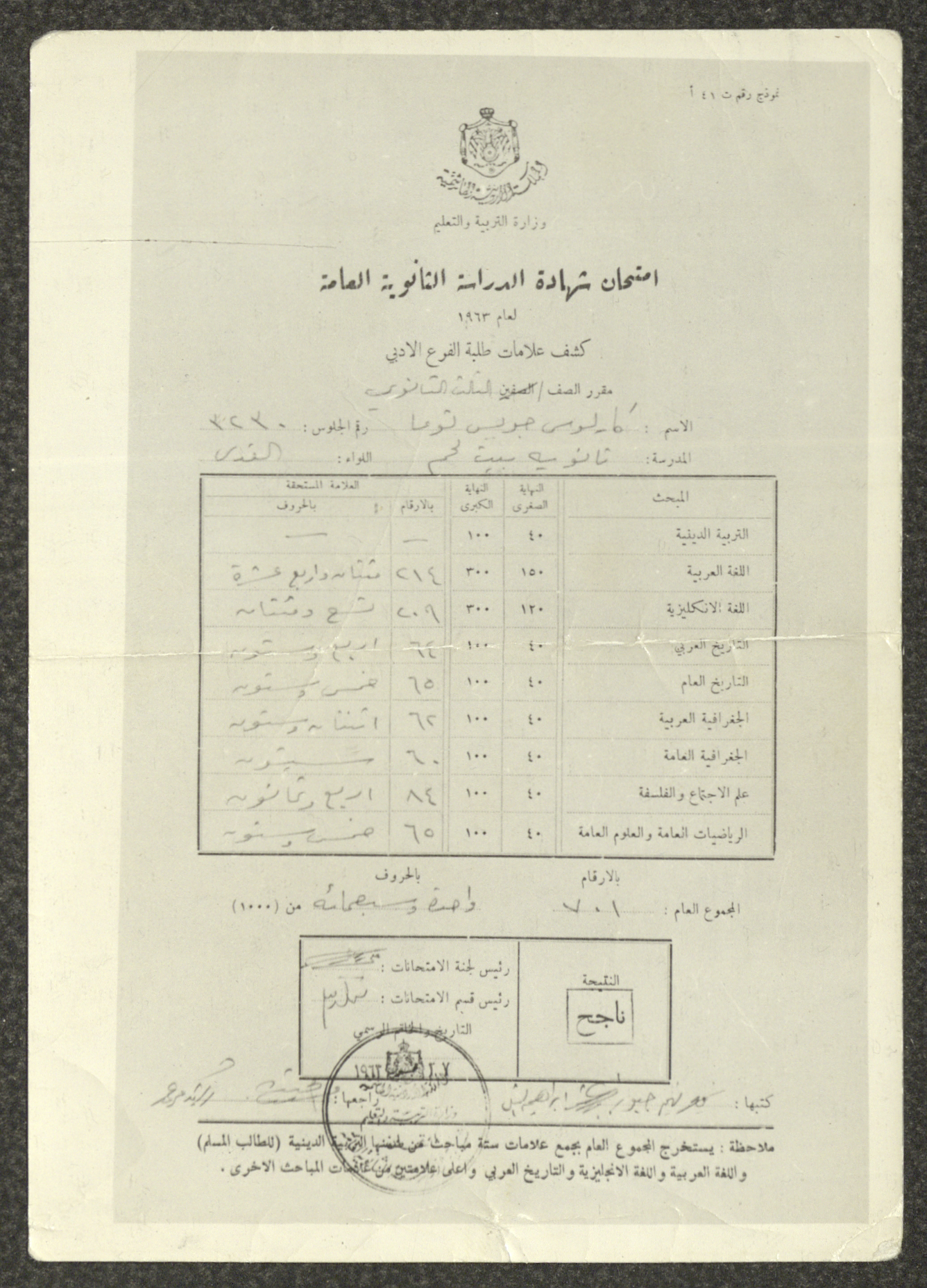 Issued by Bethlehem's Secondary School on 1 August 1963, this document shows a photocopy of Carlos Touma's school transcript, back when he was a high-school student of the literary stream. It is worth mentioning that Carlos Touma is the official name of Khalil Touma.