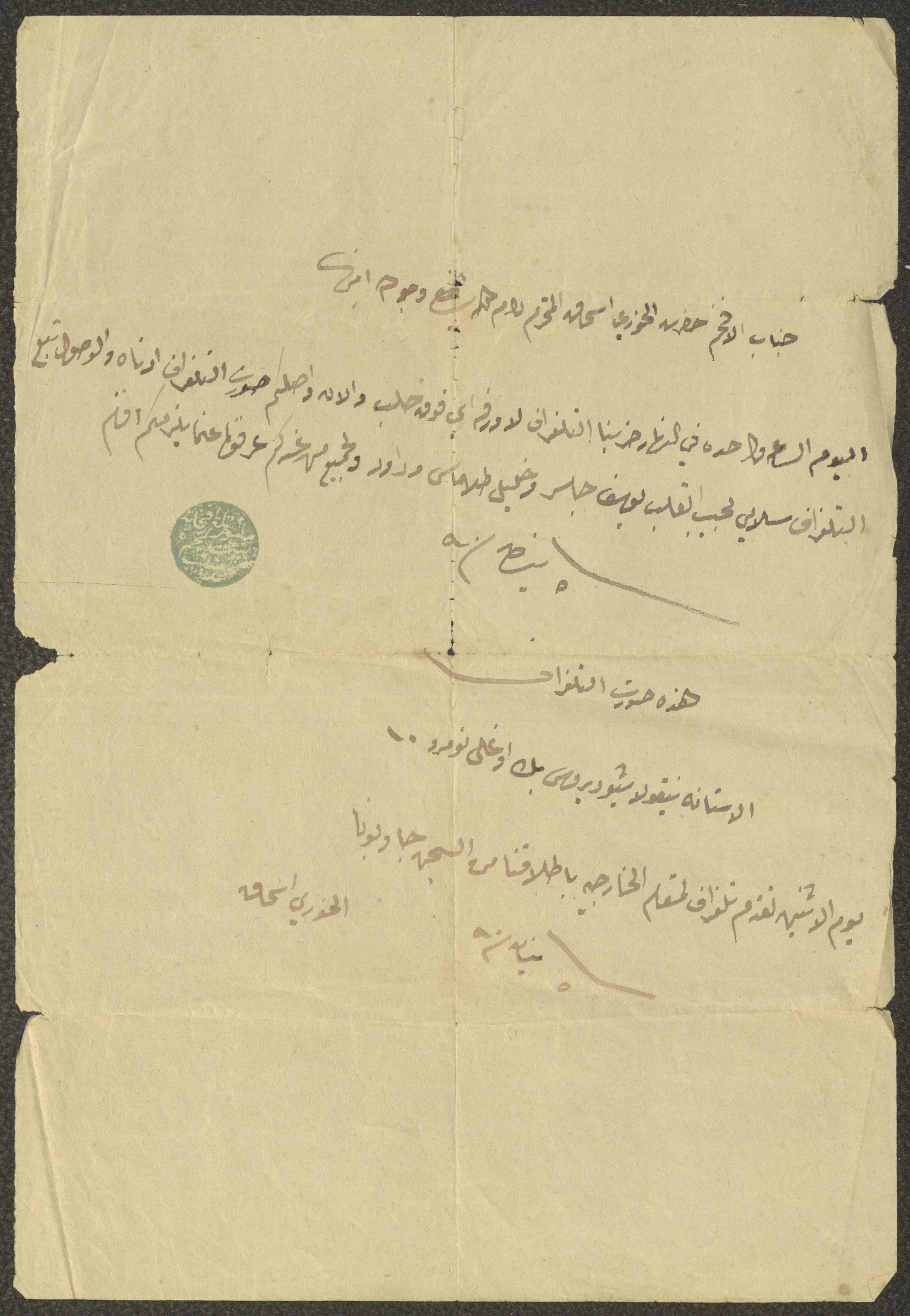 Sent on 5 April 1890, this document shows a telegram from Pastor Ishaq Touma when he was held captive in Istanbul, sending his greetings to Yousif Jasser, Khalil Talamas and his relatives in Beit Jala.