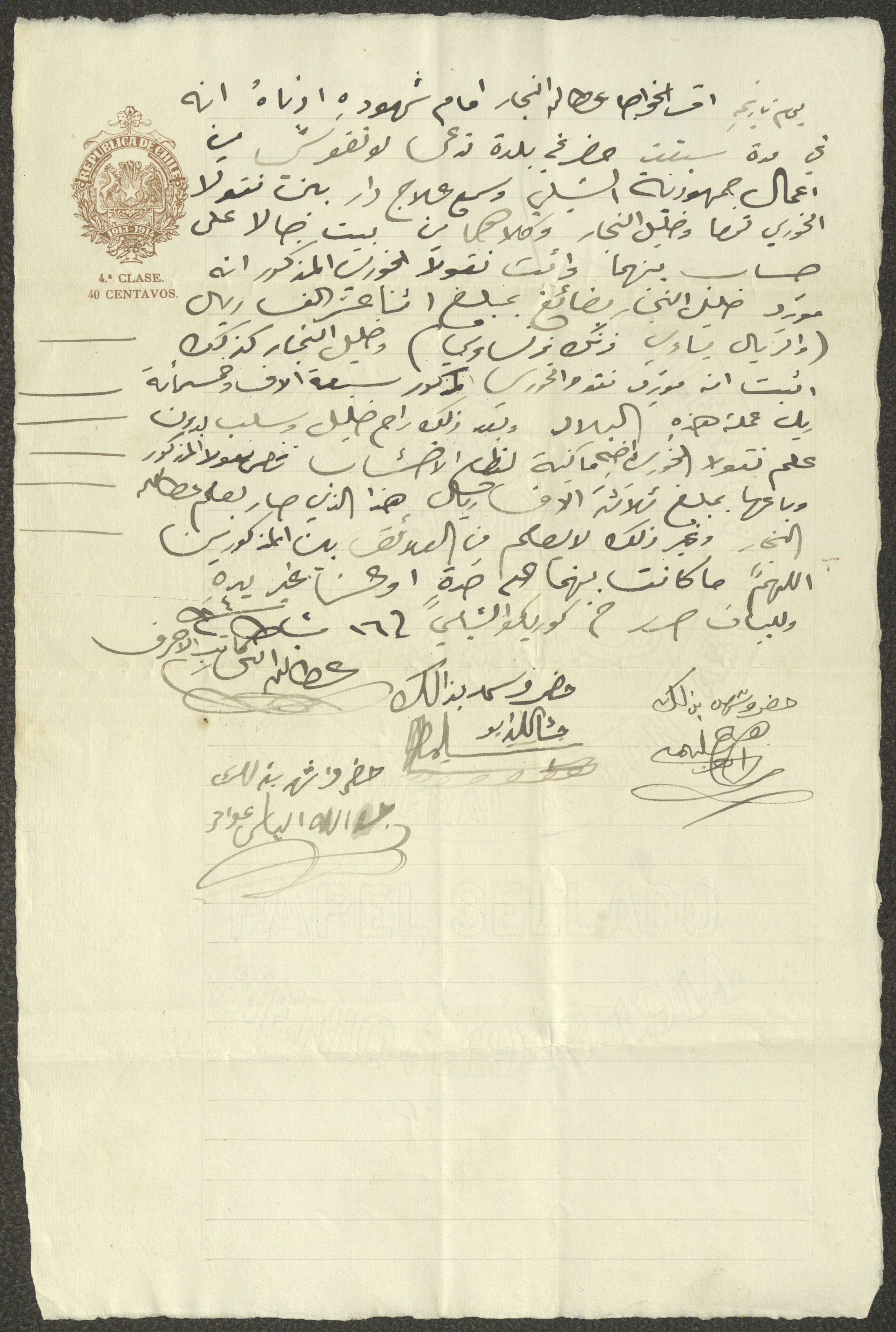 Issued on 16 February 1914, this archival item documents a conflict resolution between two people from Beit Jala residing in Chile, confirming that Nicola Touma sold products for Khalil Annajar before their dispute over the price of the products, and clarifying that Attallah Annajar is the main witness on the selling process between both parties. The document is signed by Attallah Annajar and three other witnesses.