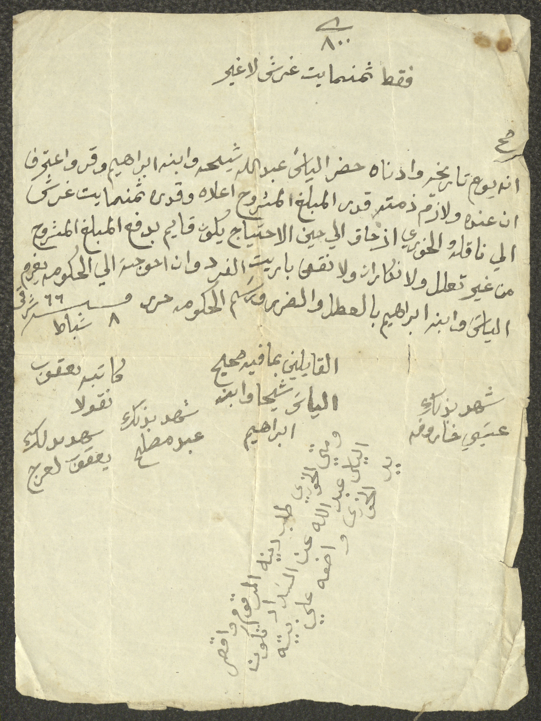 Issued on 8 February 1866 by Yacoub Nicola, this document shows a recognition of debt by Elias Abdallah Shiha and his son Ibrahim to Pastor Ishaq Touma, showing that the mentioned parties herein borrowed an amount of money worth 800 pennies from Pastor Ishaq and pledged to pay it back once the borrower is in need of which and if the loaner doesn't proceed to the payment he is to plunged by repair, damage and governmental fees. This recognition was witnessed by 3 people and was signed by Elias Shiha and his son Ibrahim Shiha, moreover, the footer of which confirmed that if Shiha couldn't pay, then, the Pastor is authorized to take the house of Elias.