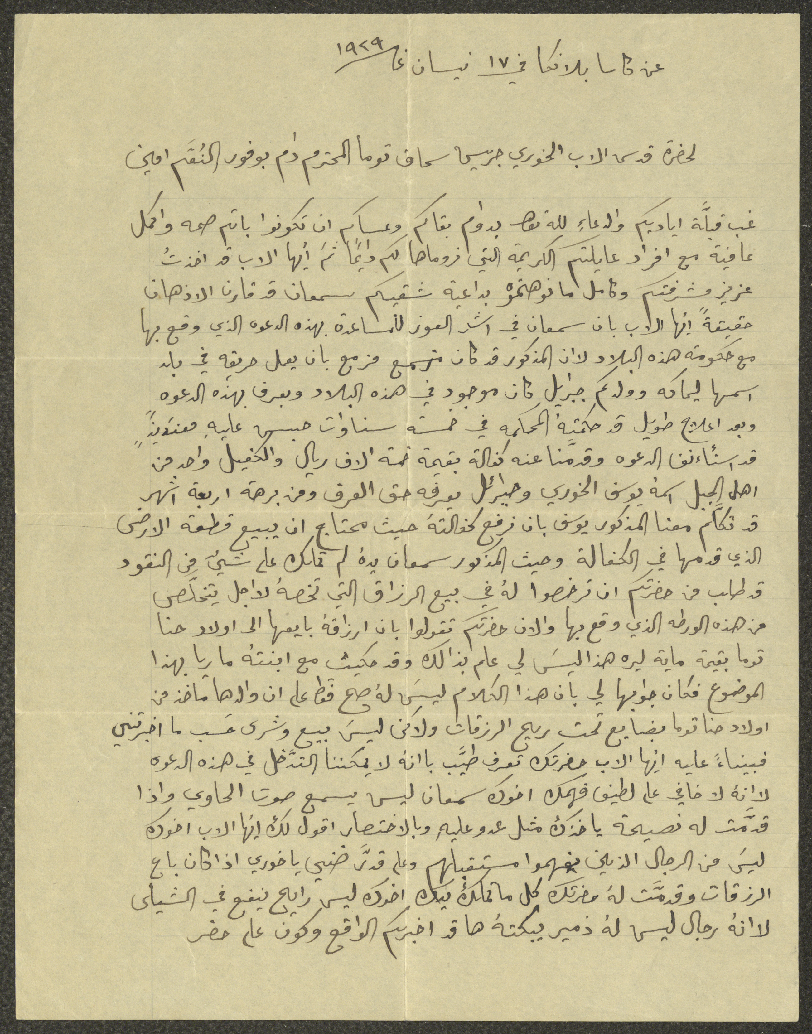 Sent on 17 April 1929, this document shows a letter sent from Morocco's capital (Casablanca) to Pastor Ishaq Jeries Touma. The sender mentions that the pastor's brother had caused a fire in a town called Limakah, got severe burnings and was in need of treatment, and then was sentenced to 5 years in prison. The sender explains to the pastor that his brother doesn't like to work, so he asks him to send some money to pay his brother's bail.
