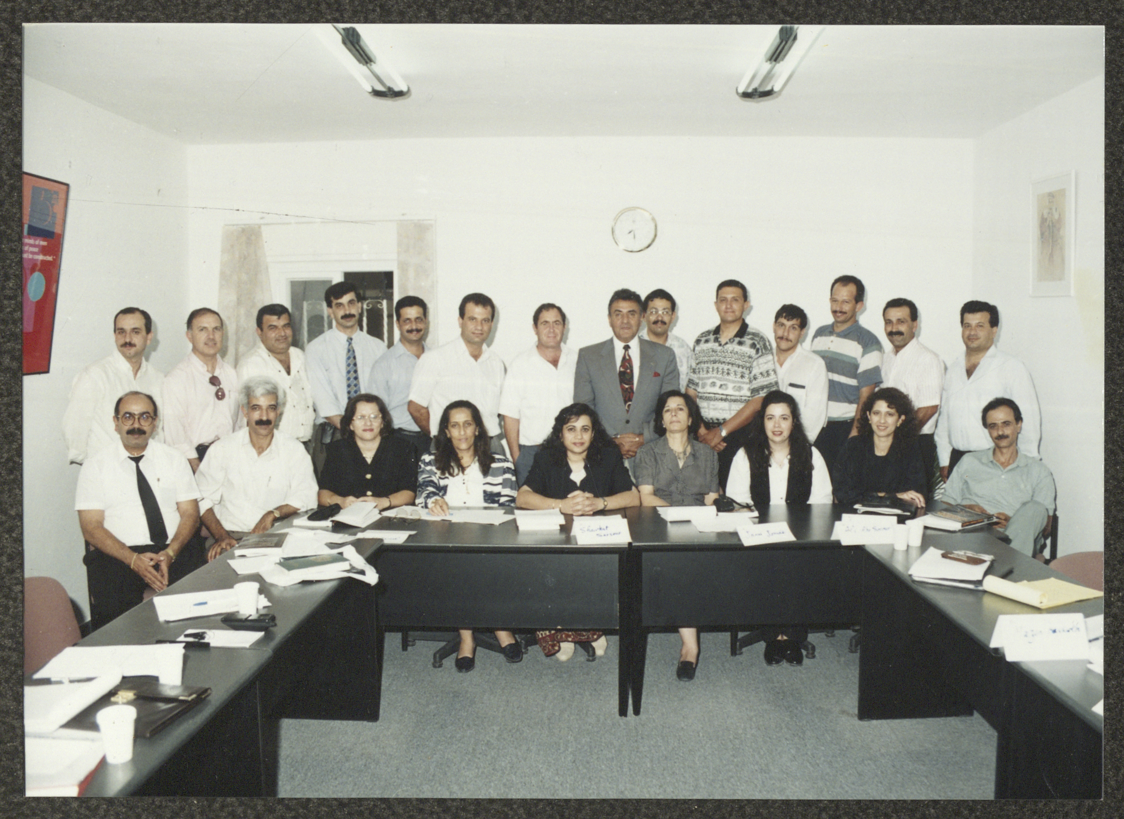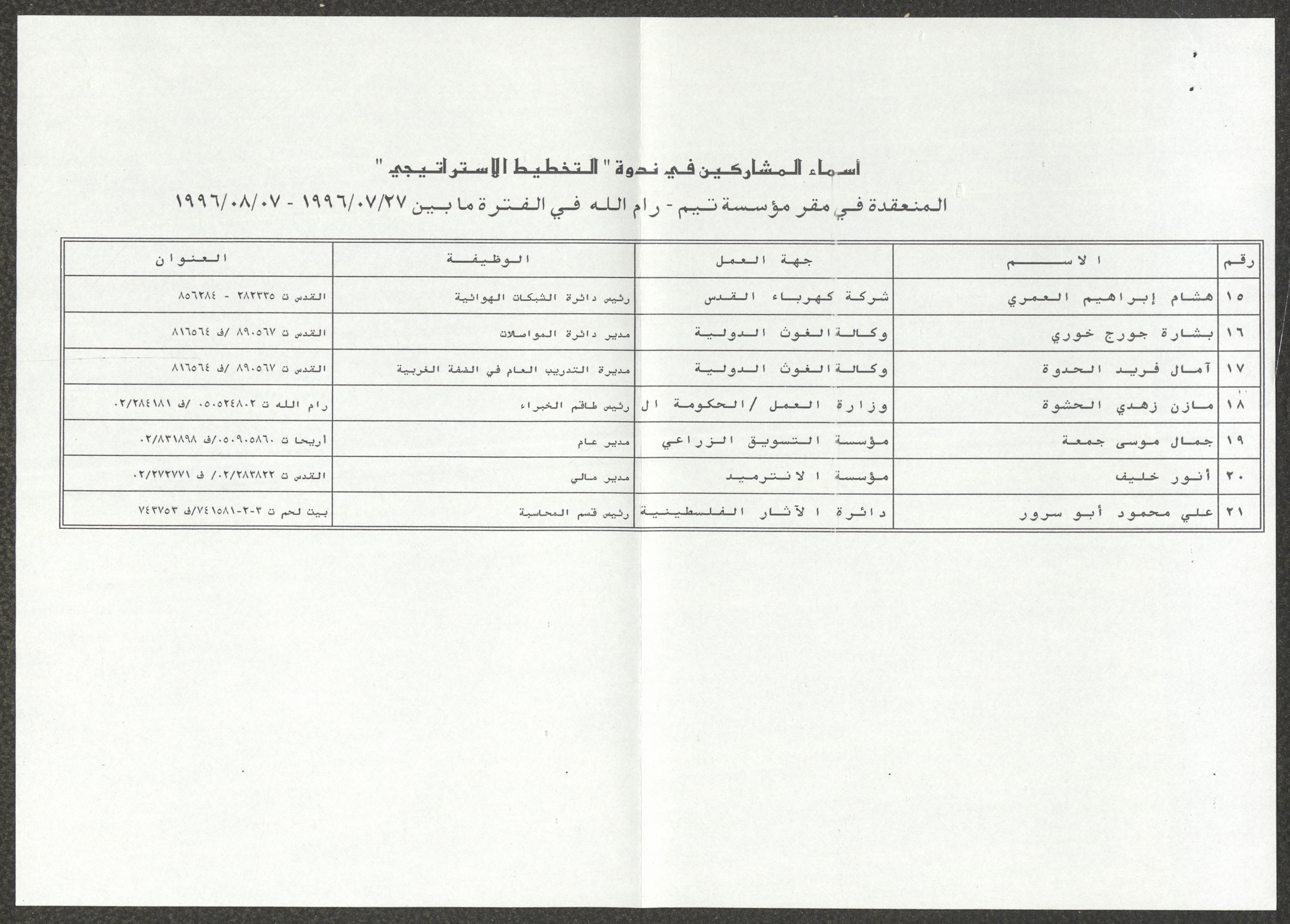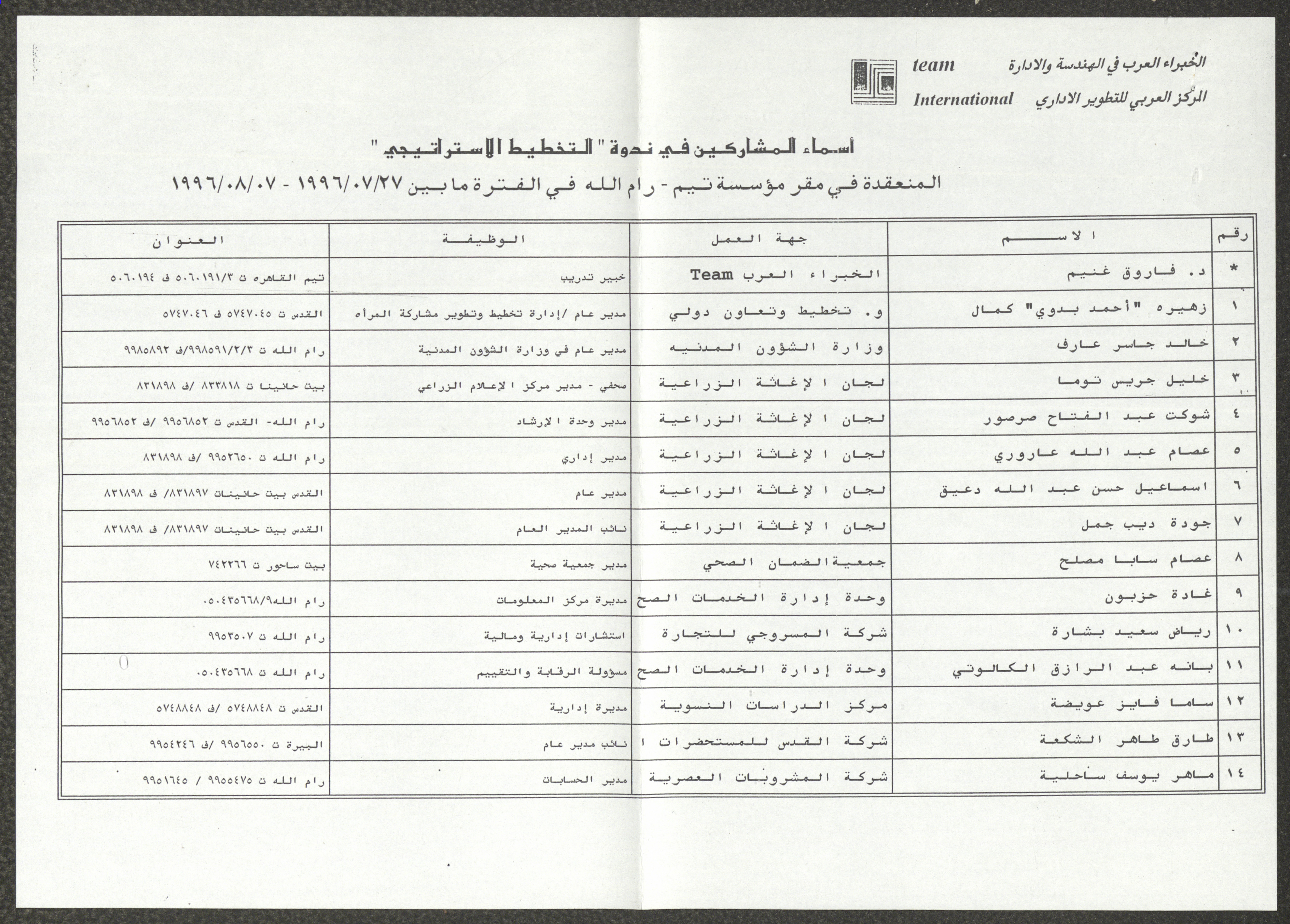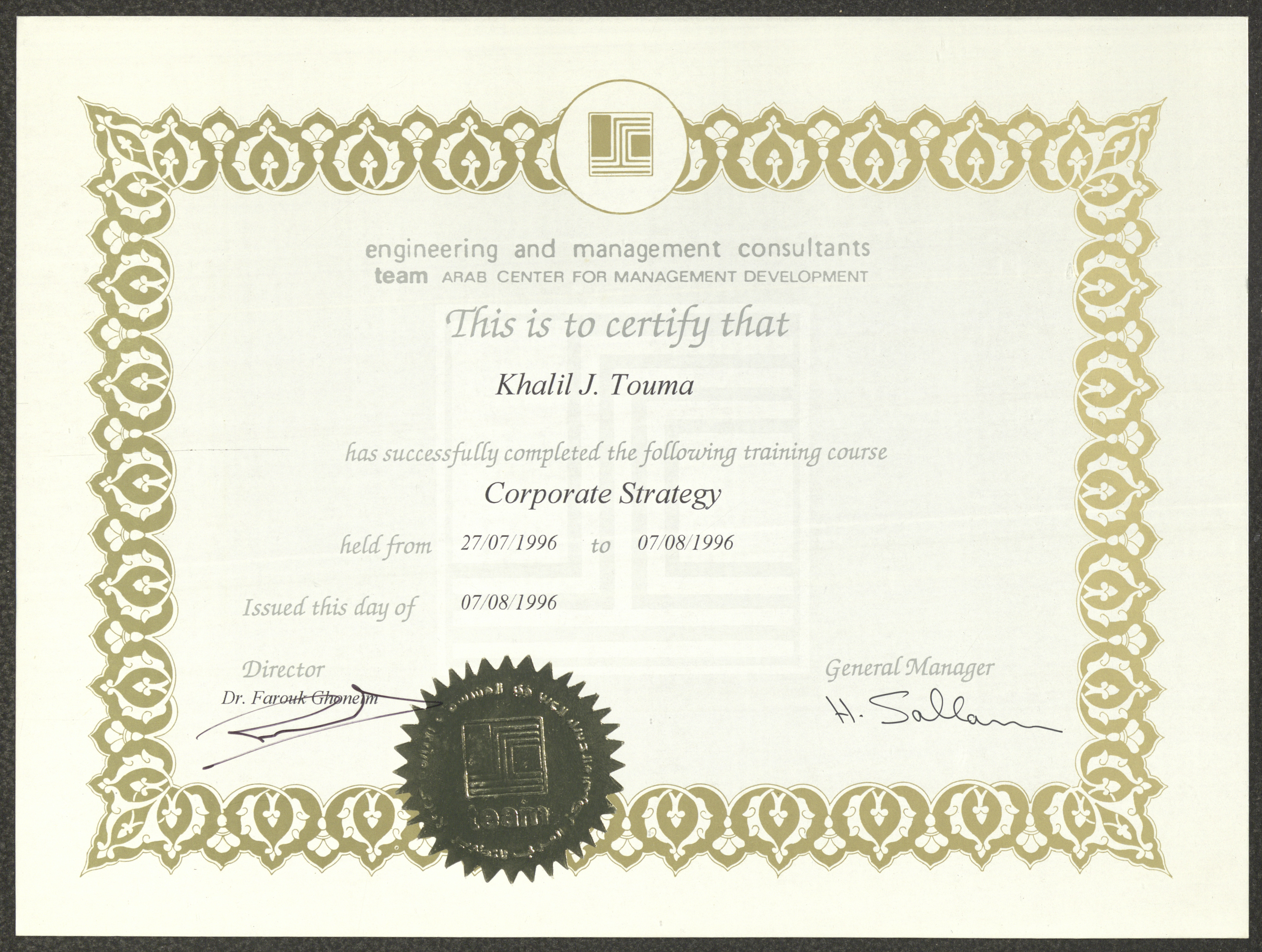 Issued by the Arabic Center for Managerial Development, this document shows a certificate in the name of Khalil Touma on participating in a course of strategic management, held at Team organization in Ramallah between 27 July 1996 and 7 August 1996, the certificate contains a group photograph of the participants in addition to a list of their names, job titles, place of work and addresses.