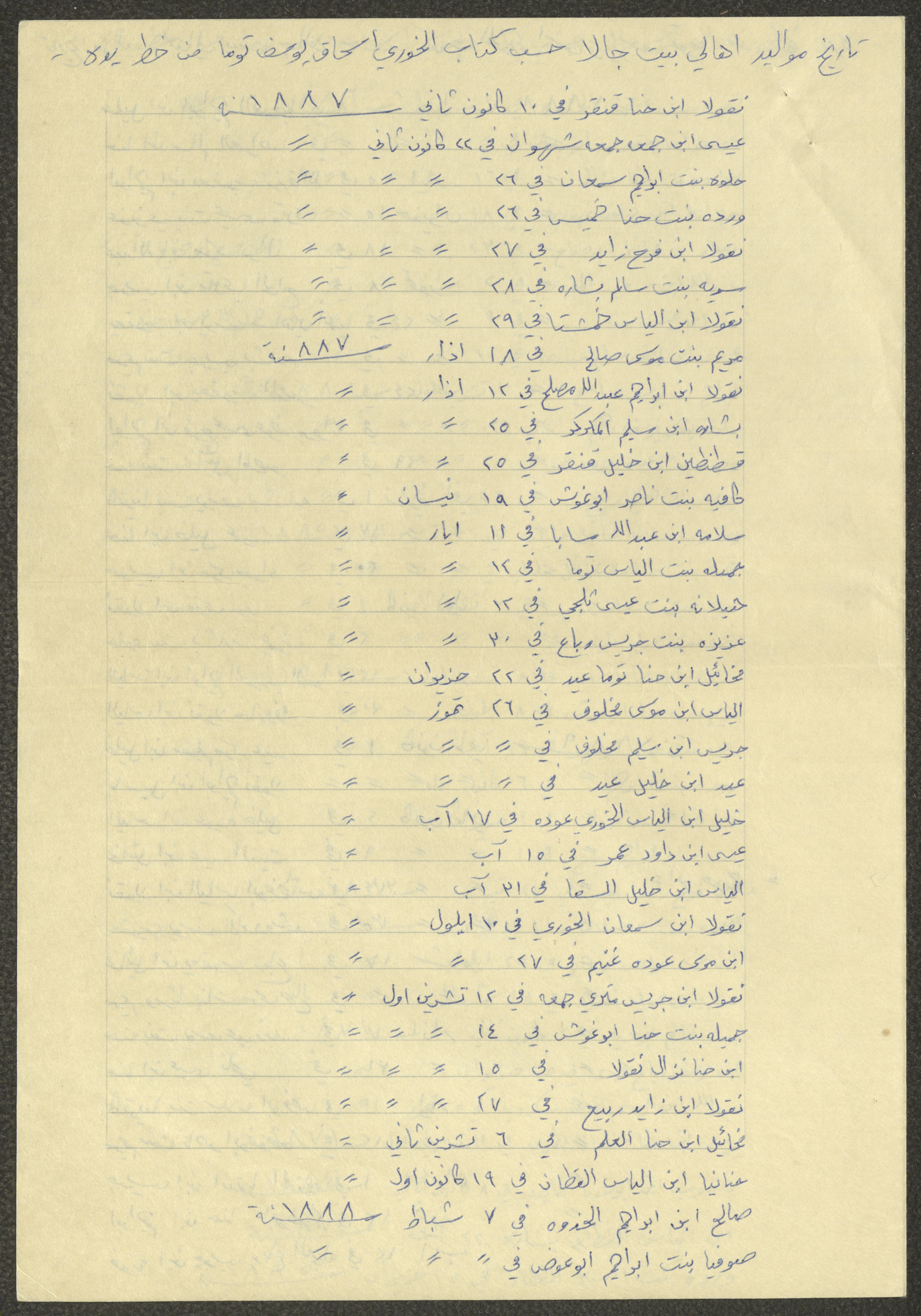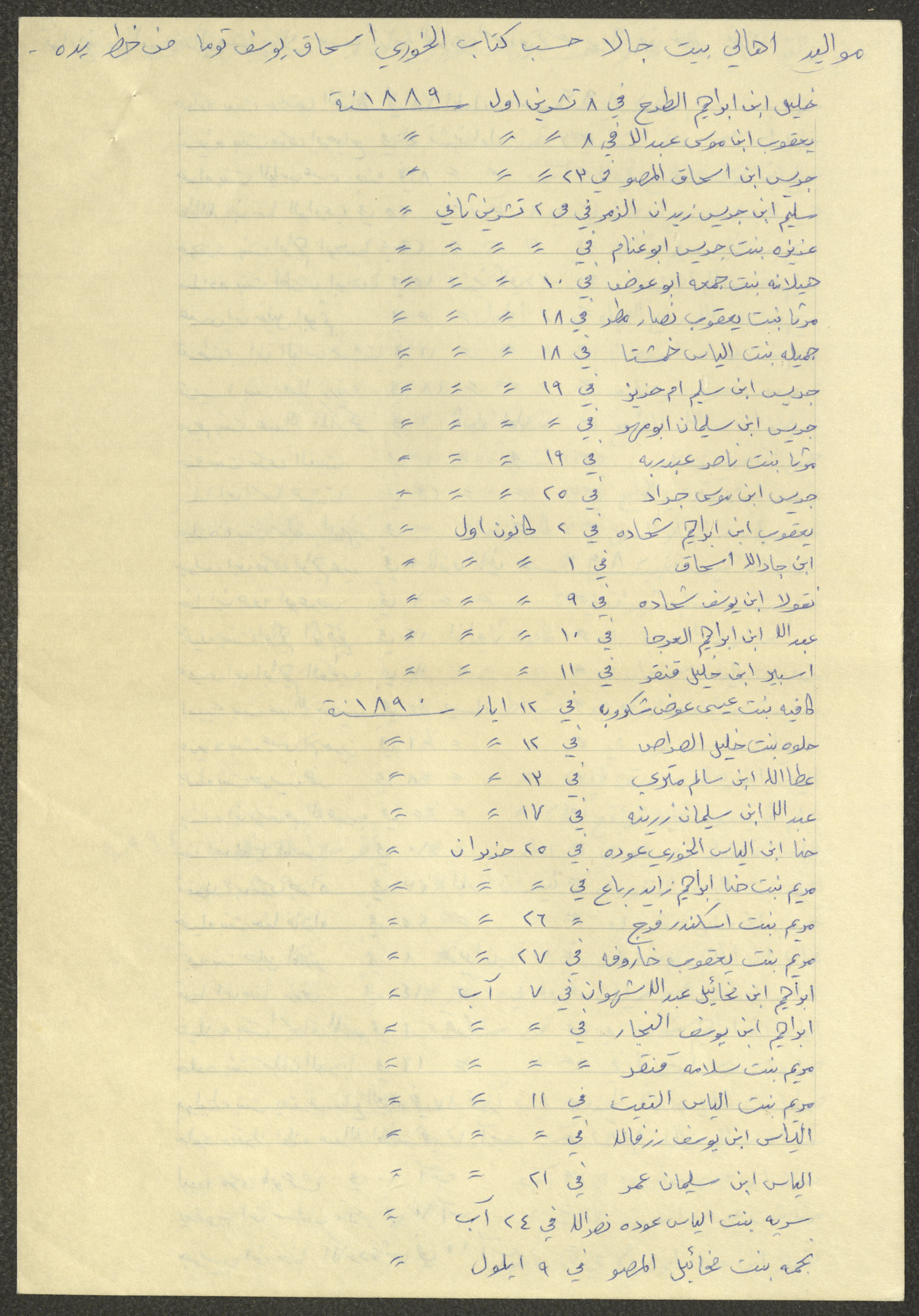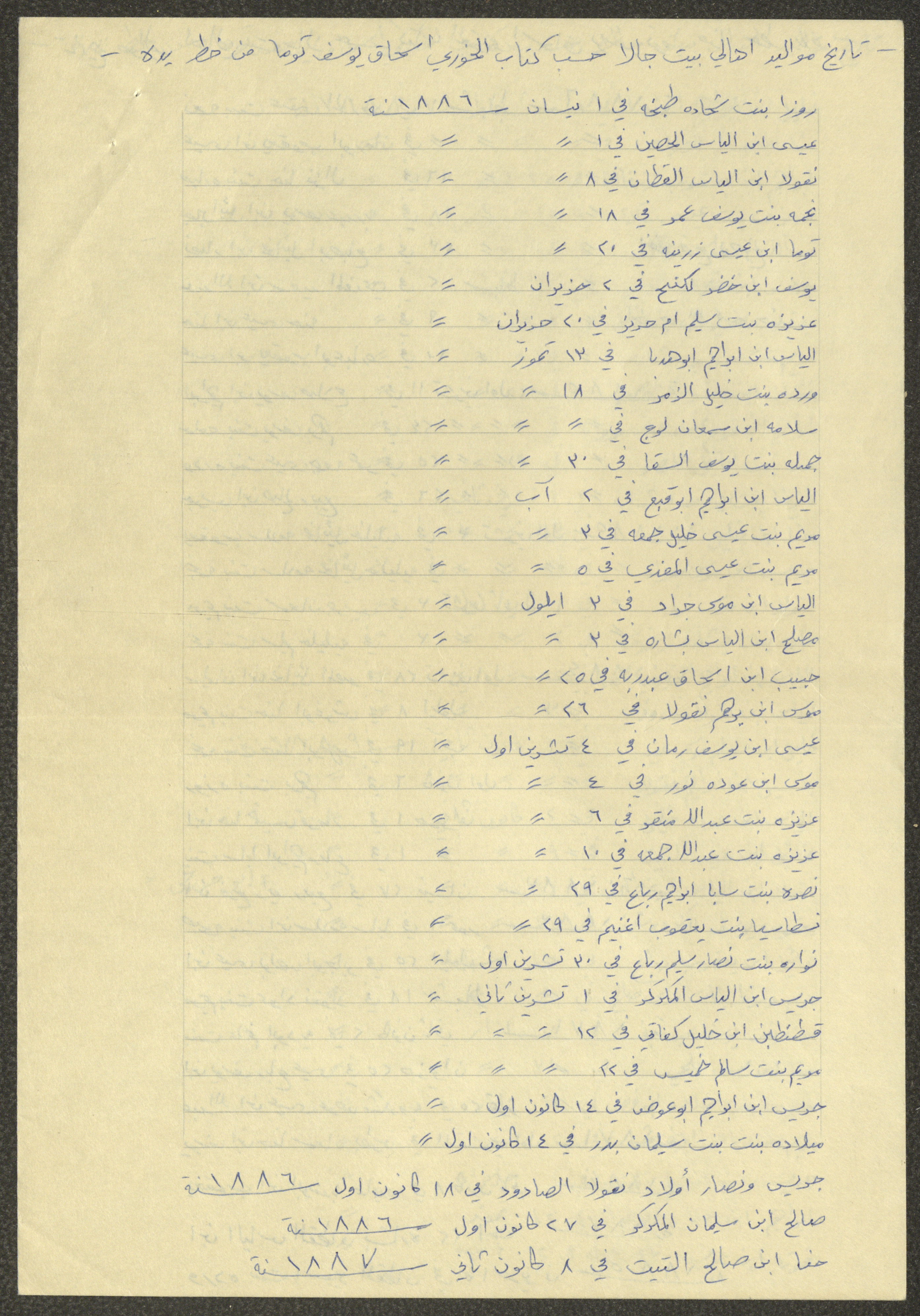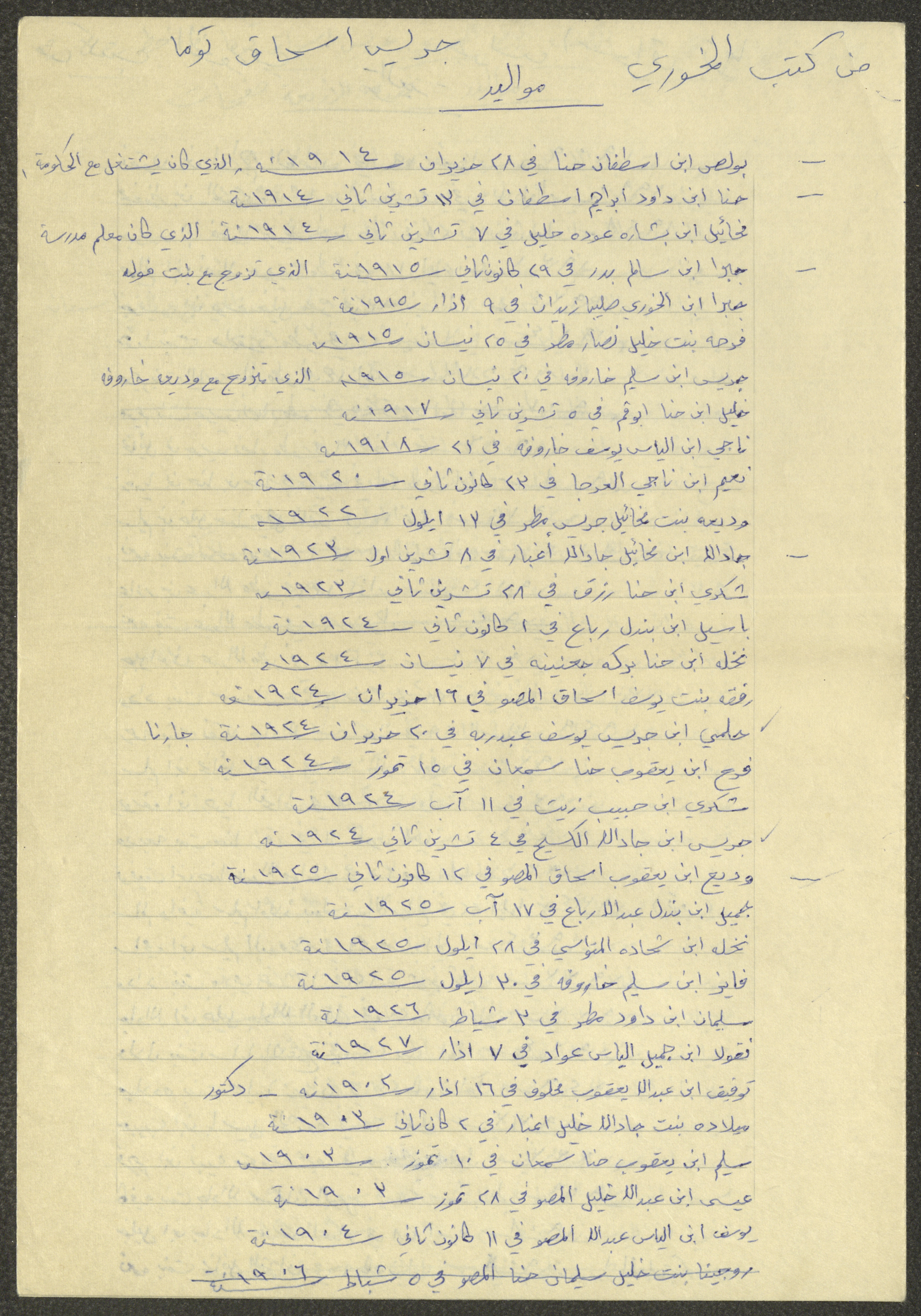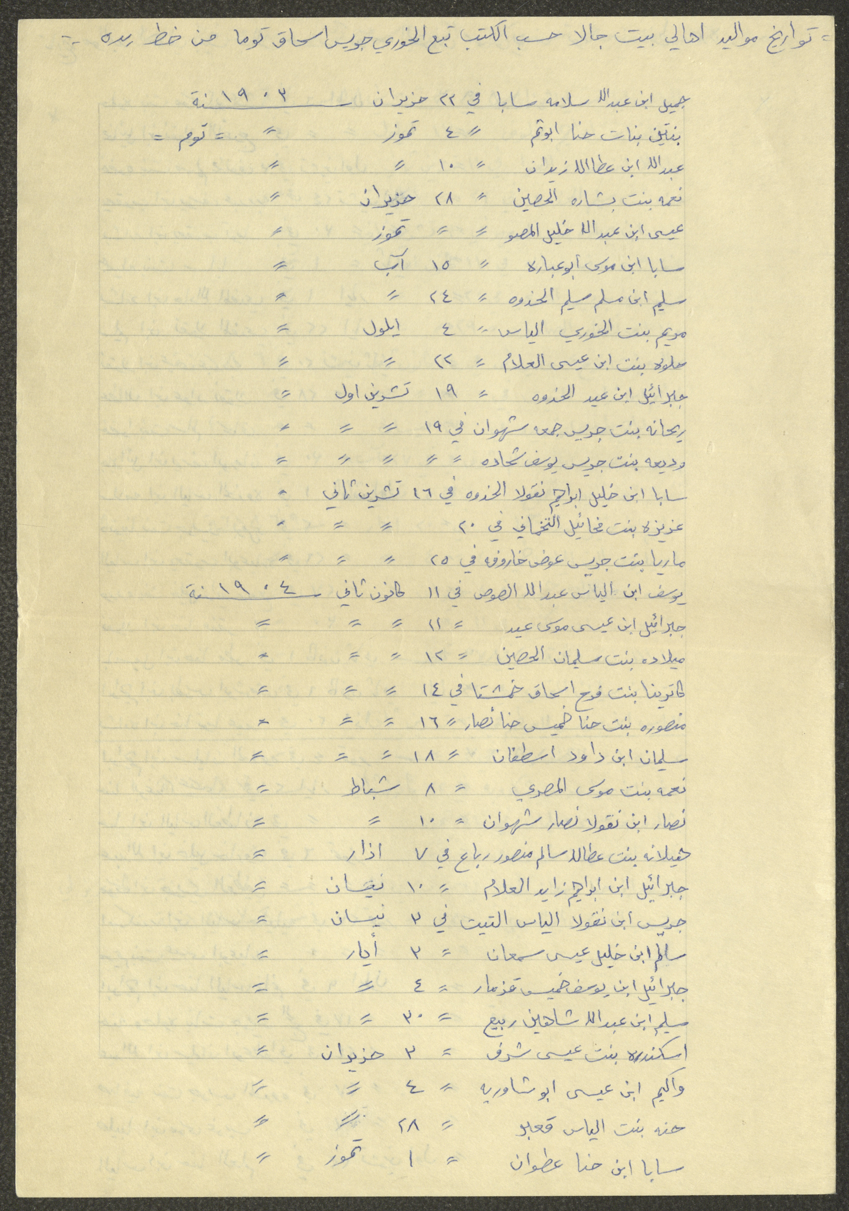 This document shows a list of the names and dates of births of the people of Beit Jala in the 19th and 20th centuries, compiled by Father Ishaq Touma and put in a historical book. Boutros Jeries Touma later collected and handwrote them during his stay in Chile in lists, which he would later send along with the letters he sent to his nephew Khalil Touma in Beit Jala during the 1980s.