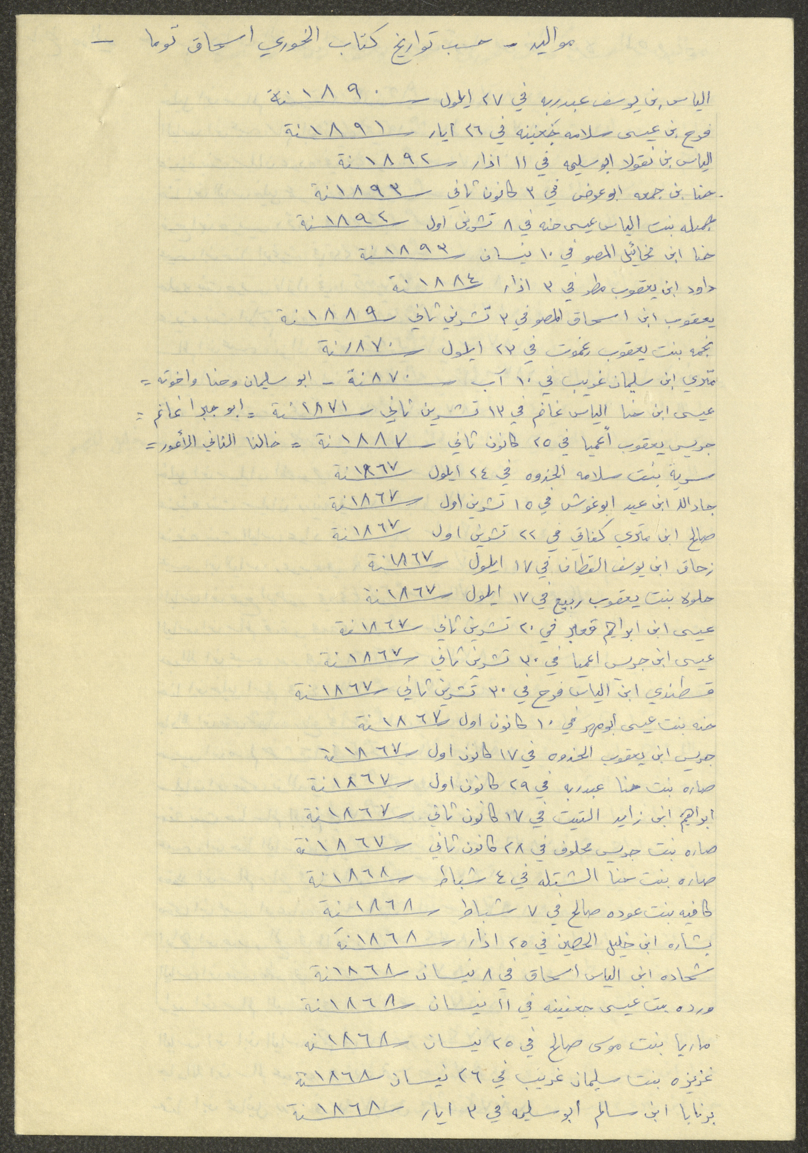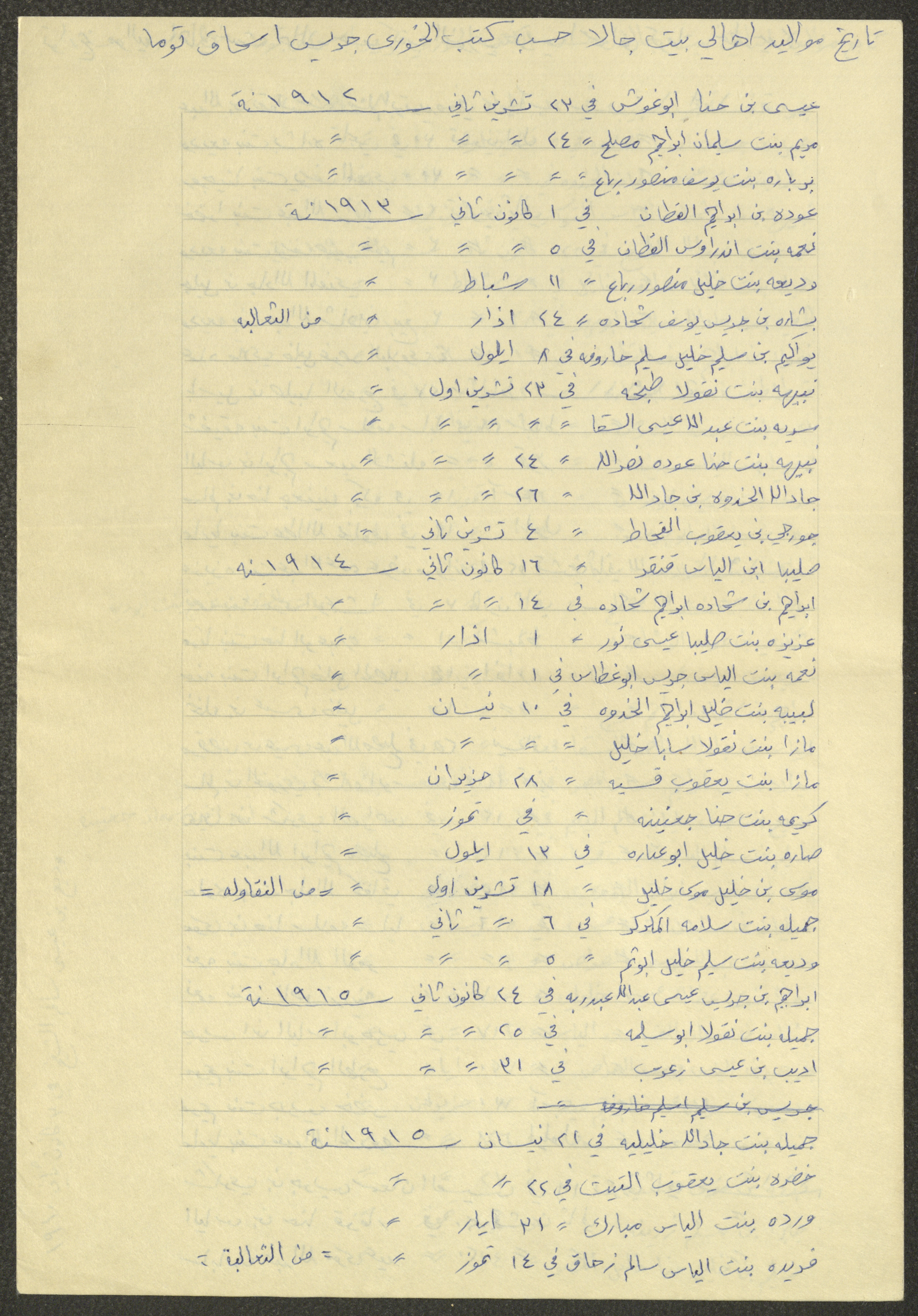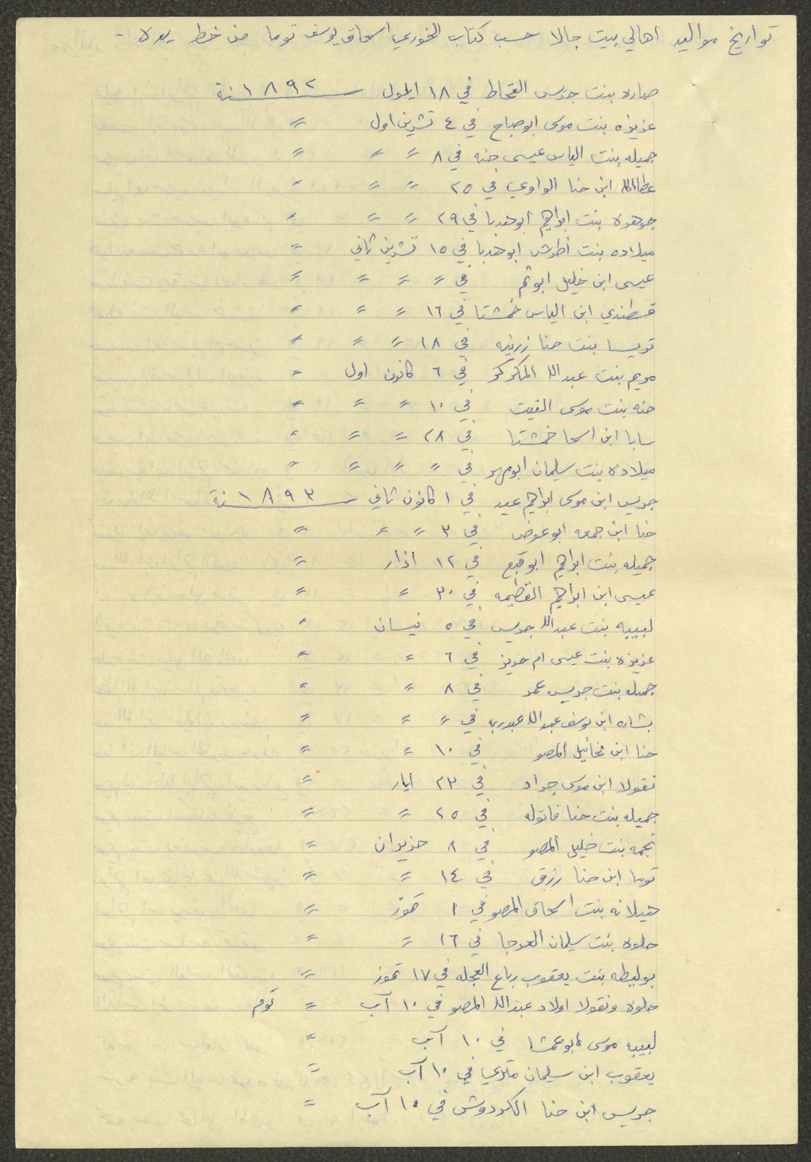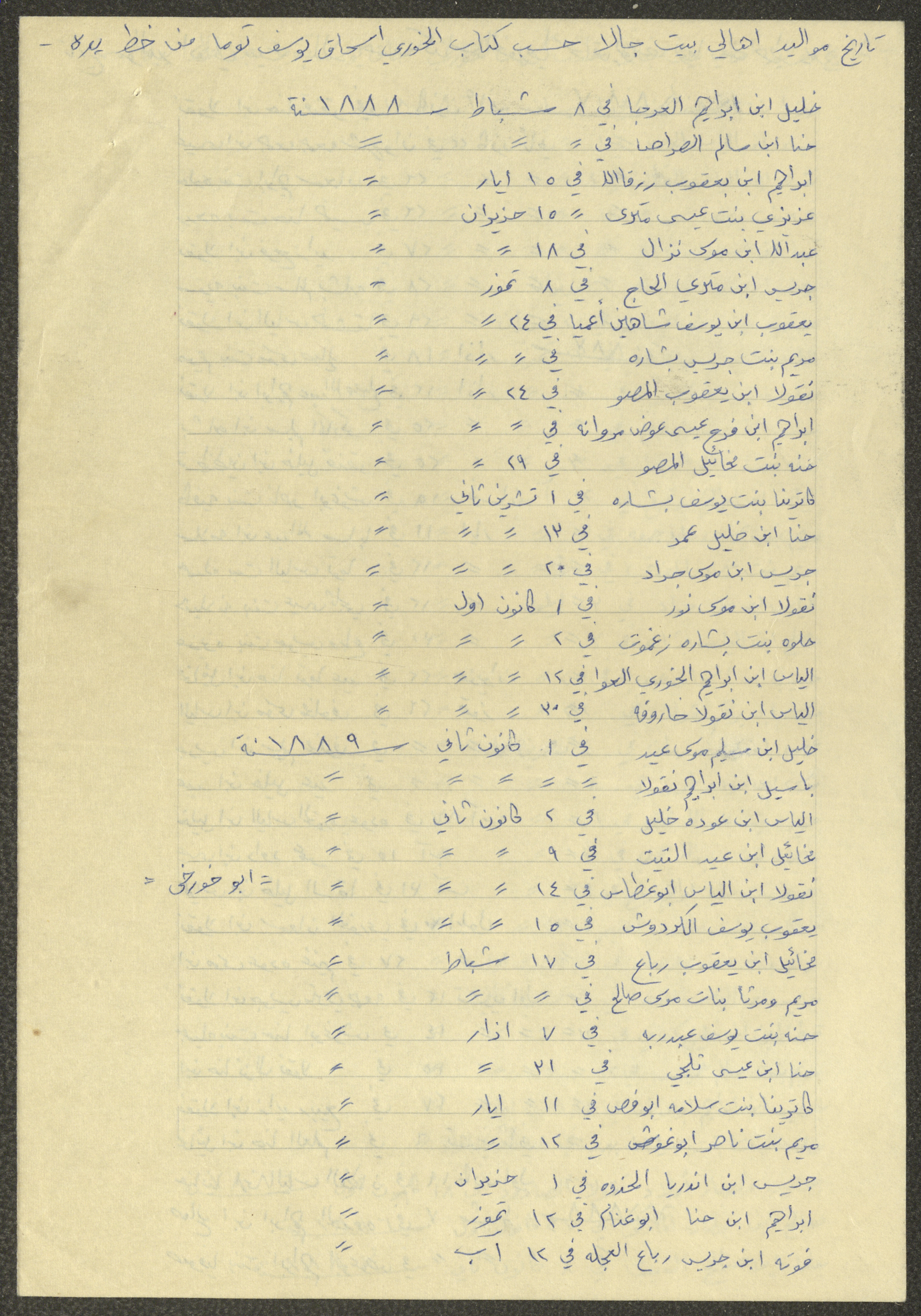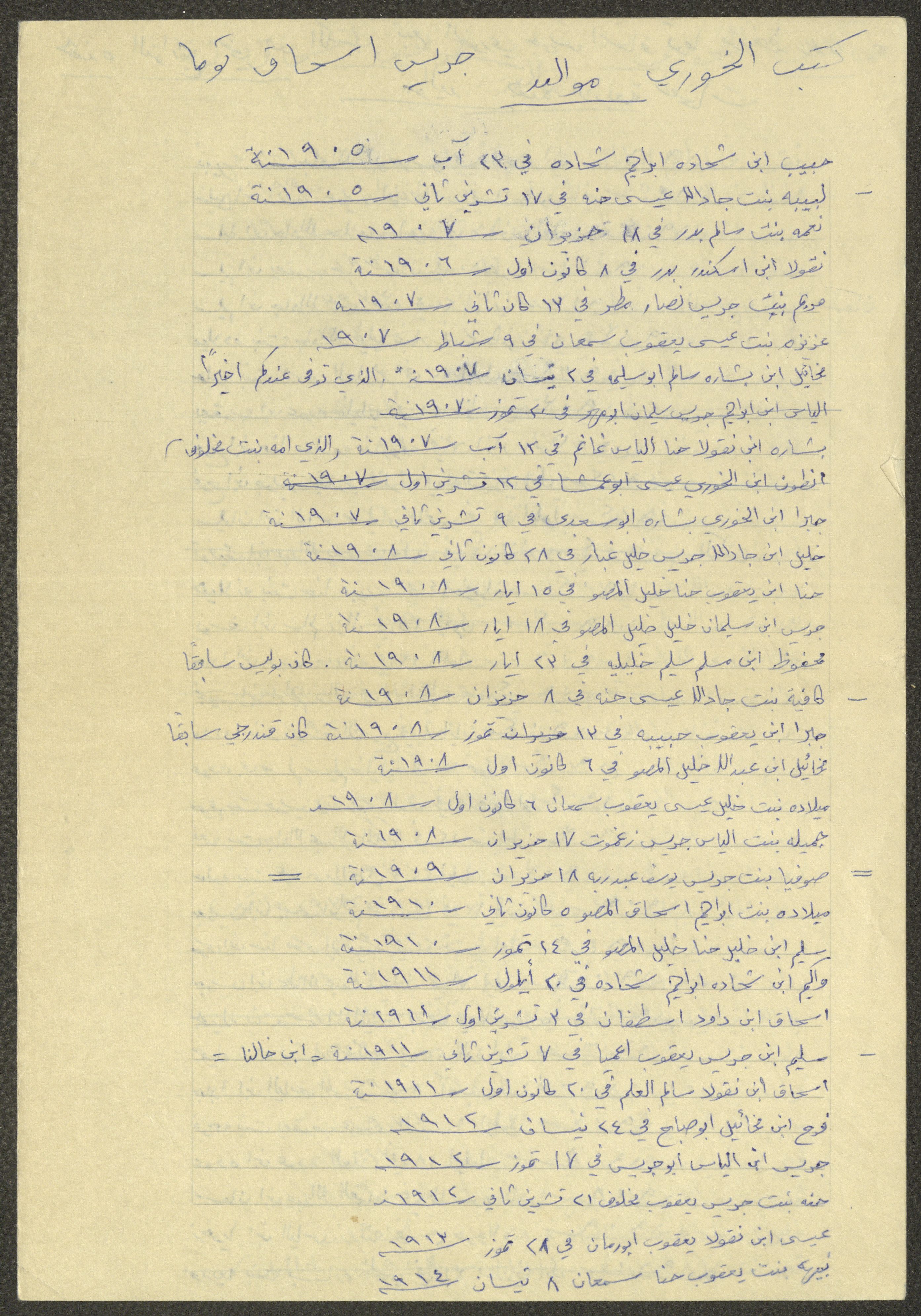 This document shows a list of the names and dates of births of the people of Beit Jala in the 19th and 20th centuries, compiled by Father Ishaq Touma and put in a historical book. Boutros Jeries Touma later collected and handwrote them during his stay in Chile in lists, which he would later send along with the letters he sent to his nephew Khalil Touma in Beit Jala during the 1980s.