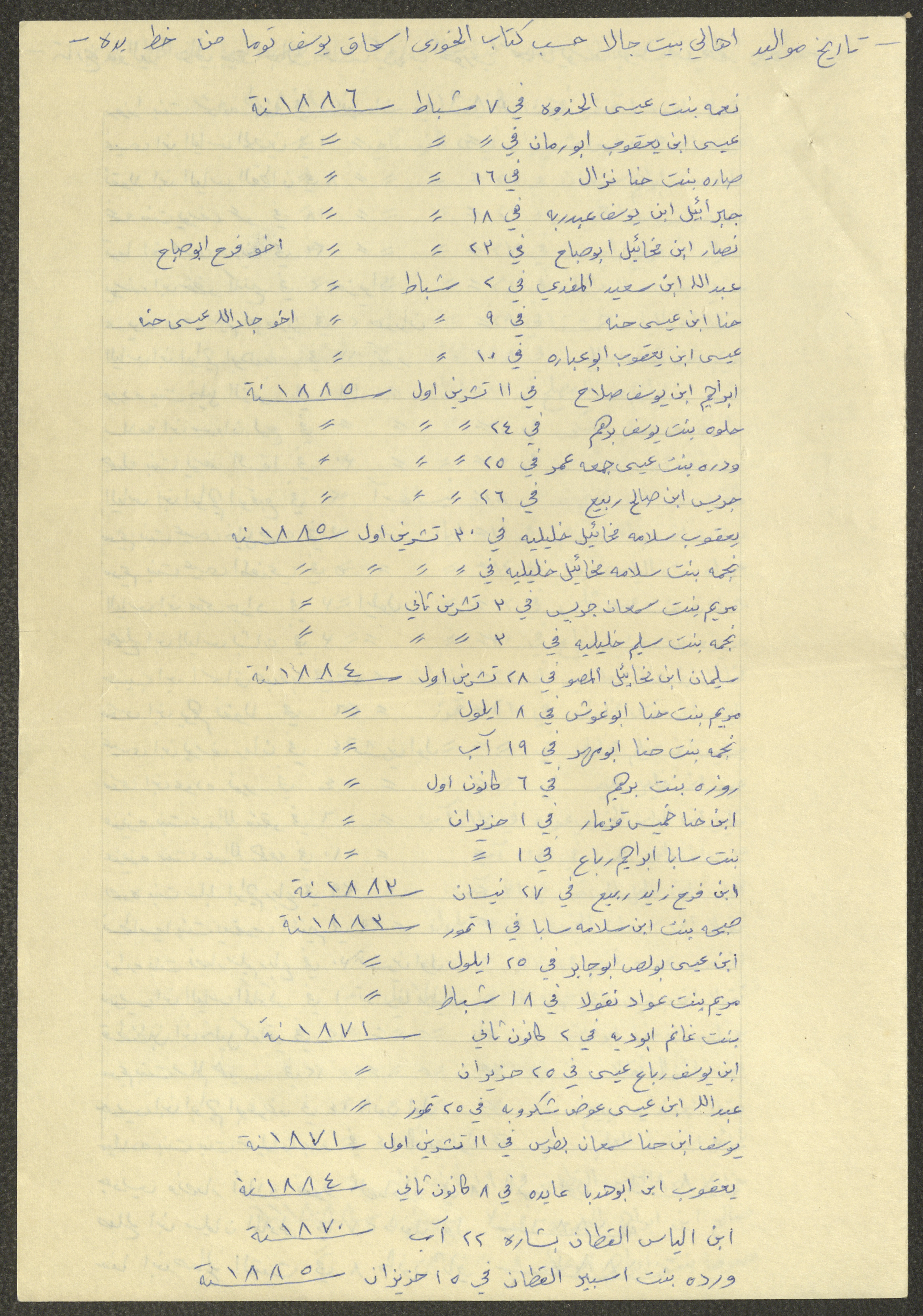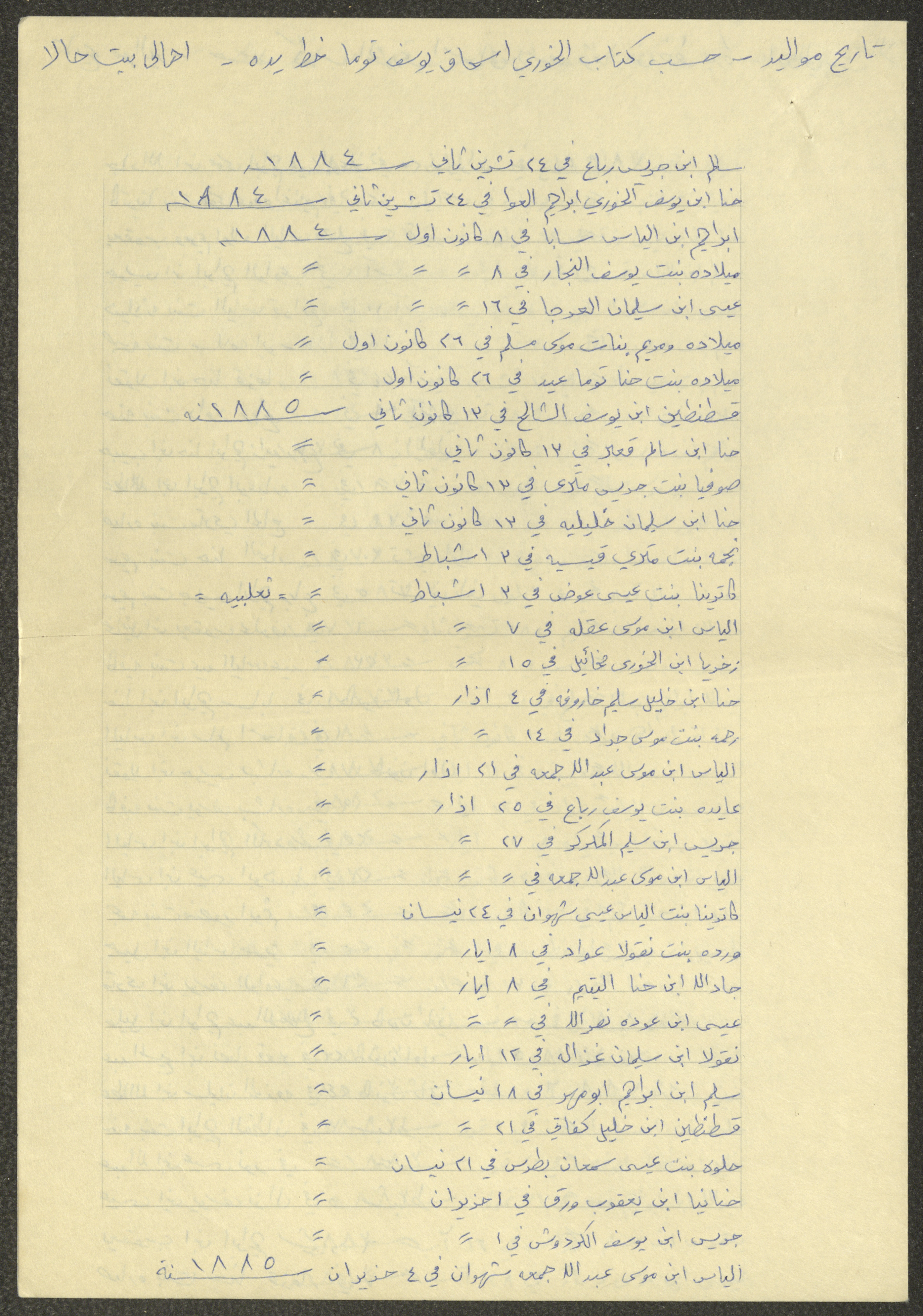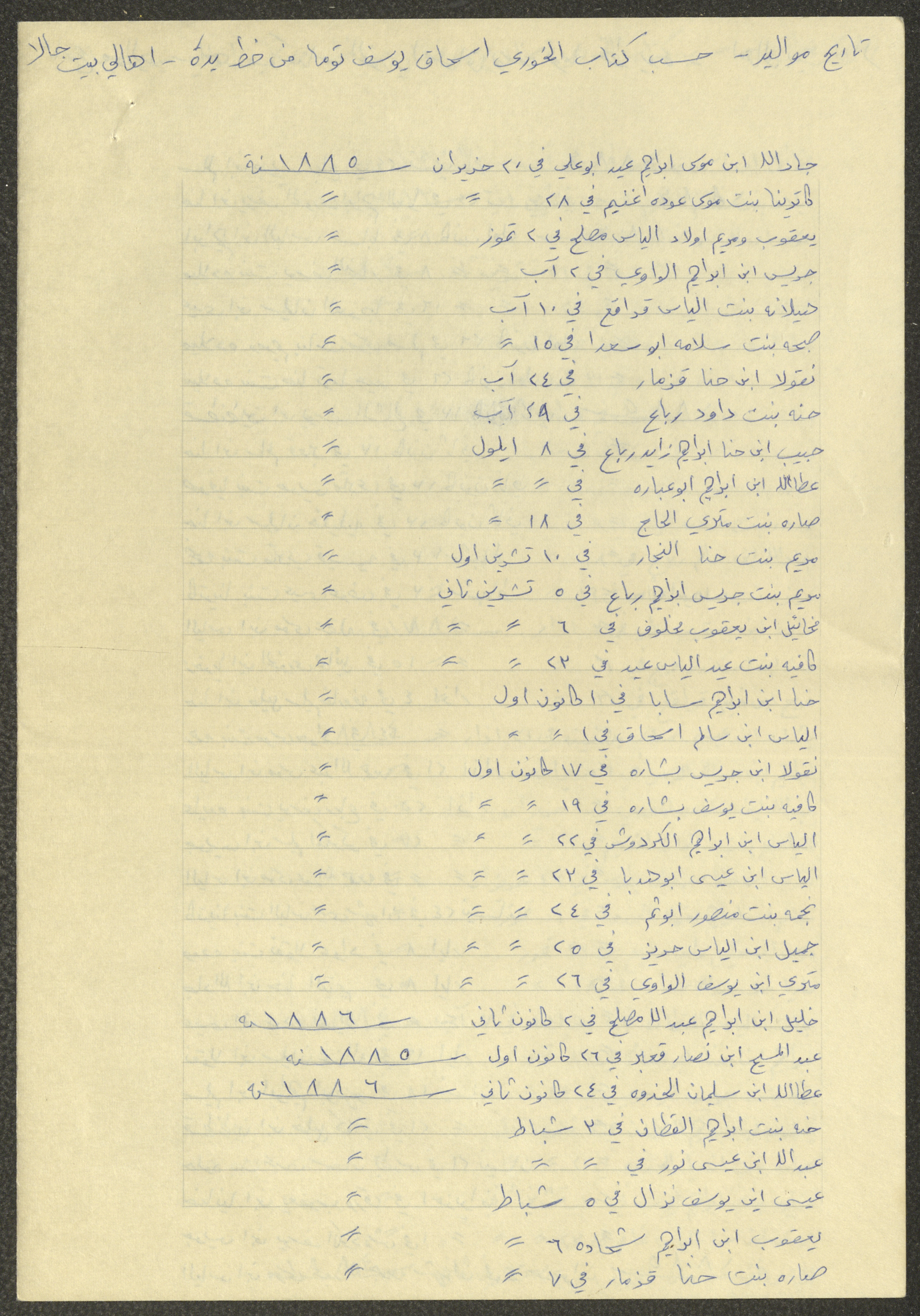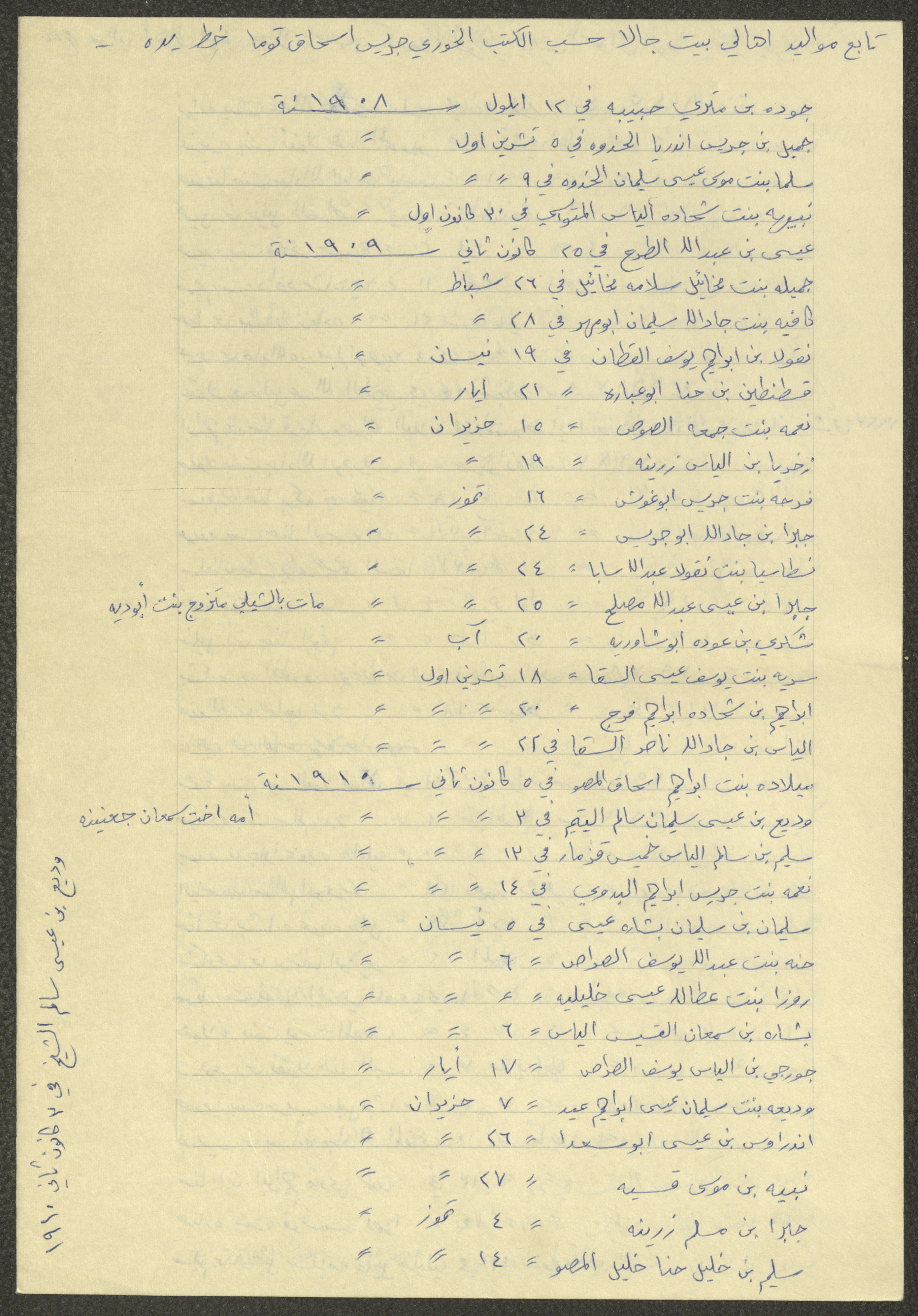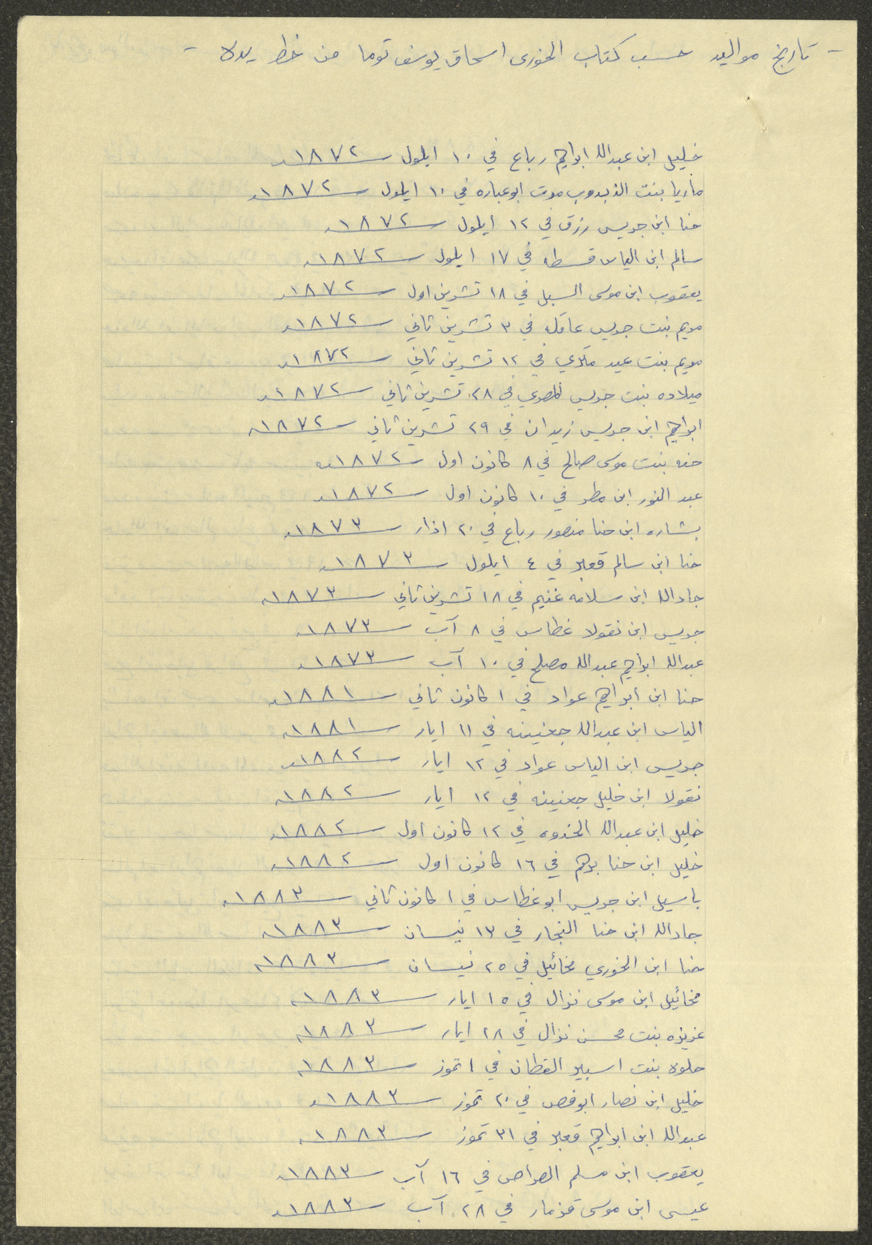 This document shows a list of the names and dates of births of the people of Beit Jala in the 19th and 20th centuries, compiled by Father Ishaq Touma and put in a historical book. Boutros Jeries Touma later collected and handwrote them during his stay in Chile in lists, which he would later send along with the letters he sent to his nephew Khalil Touma in Beit Jala during the 1980s.