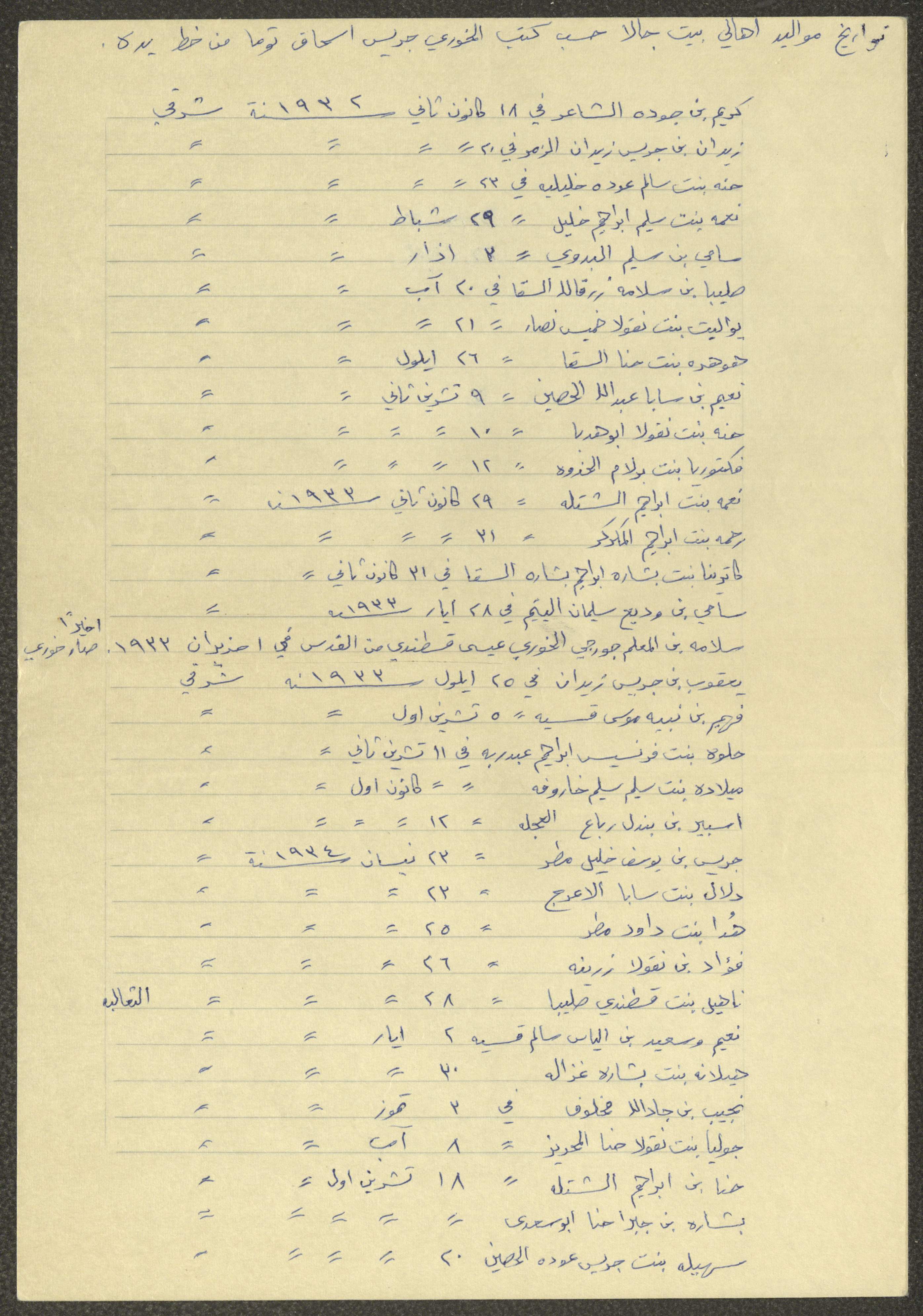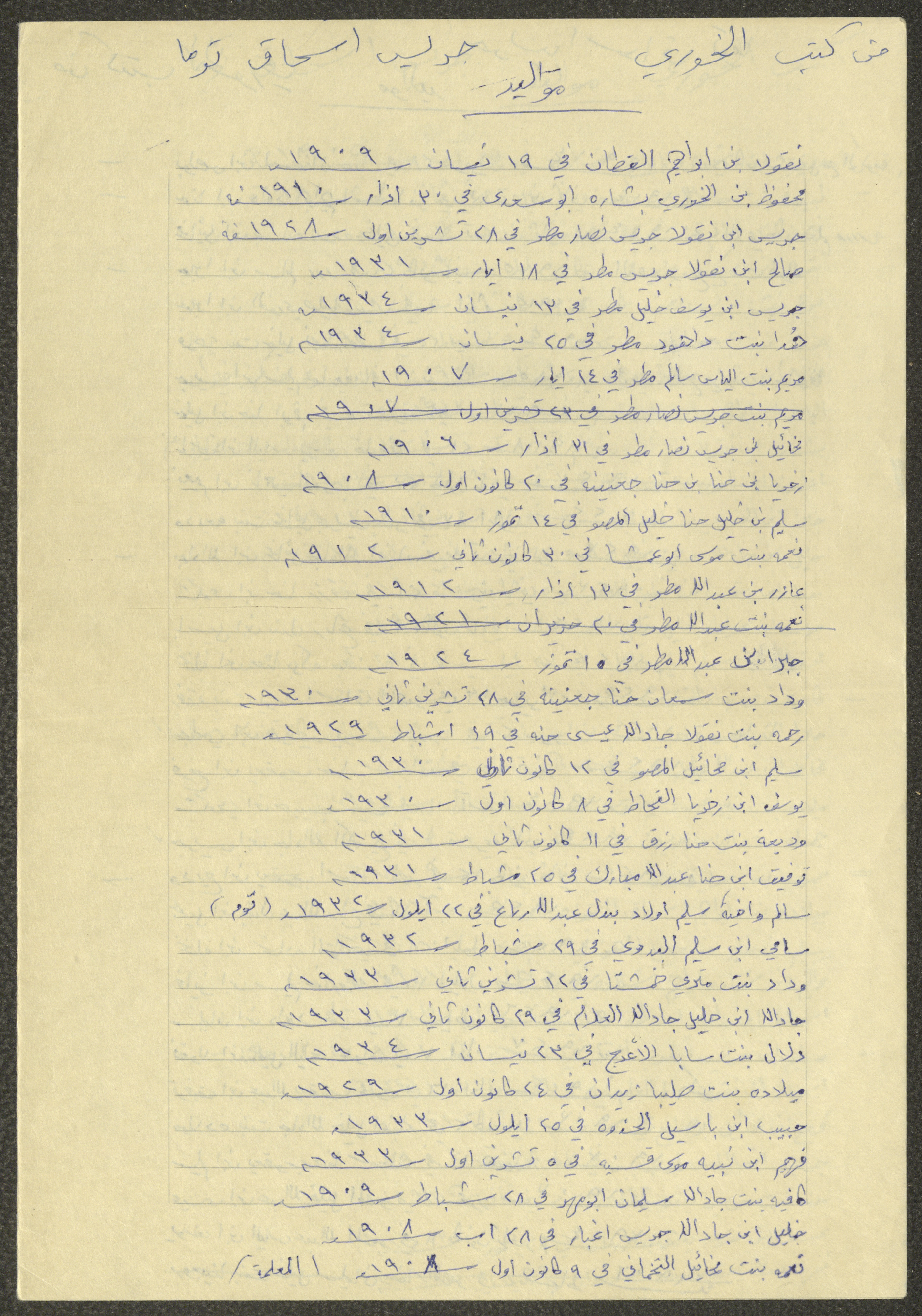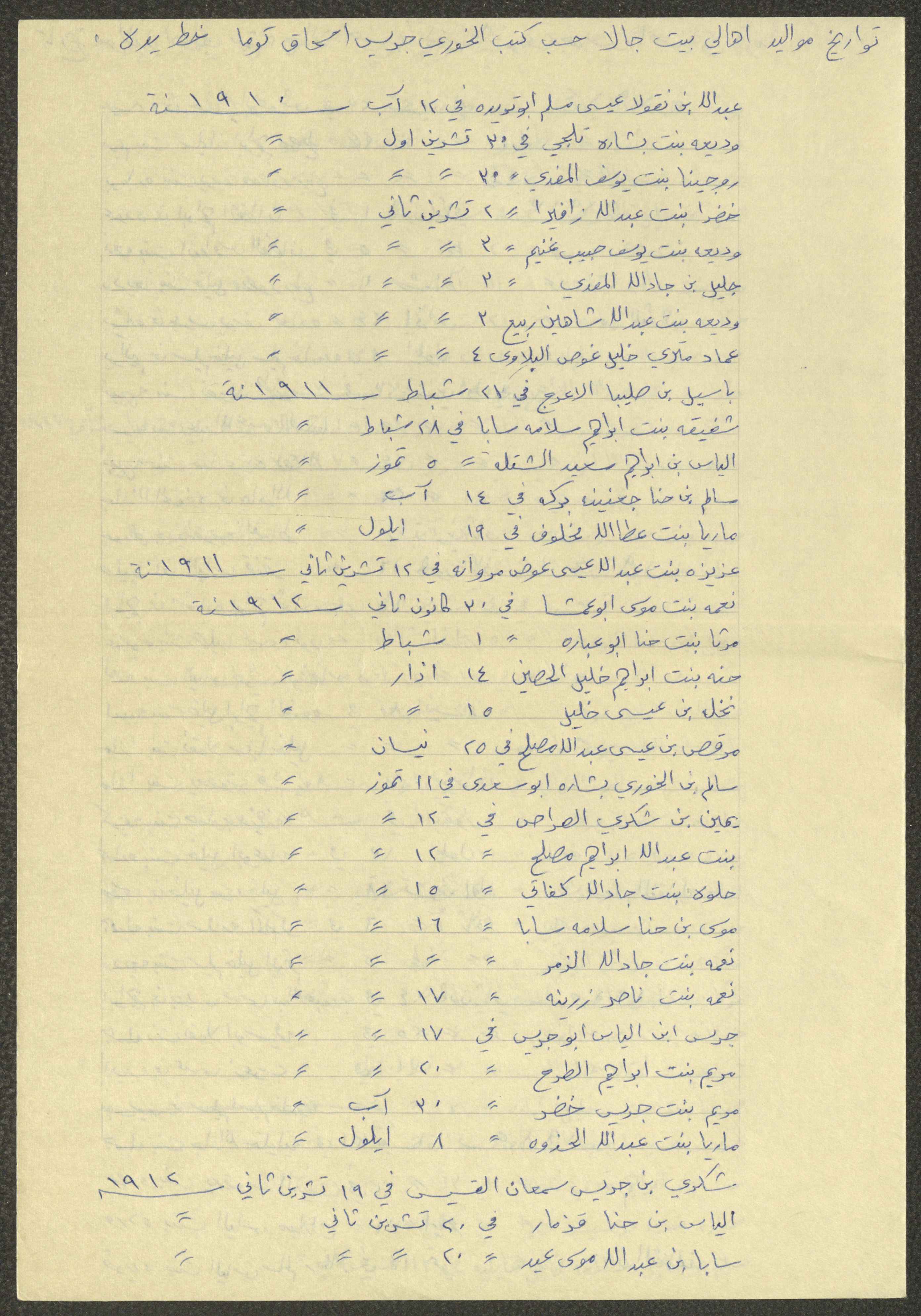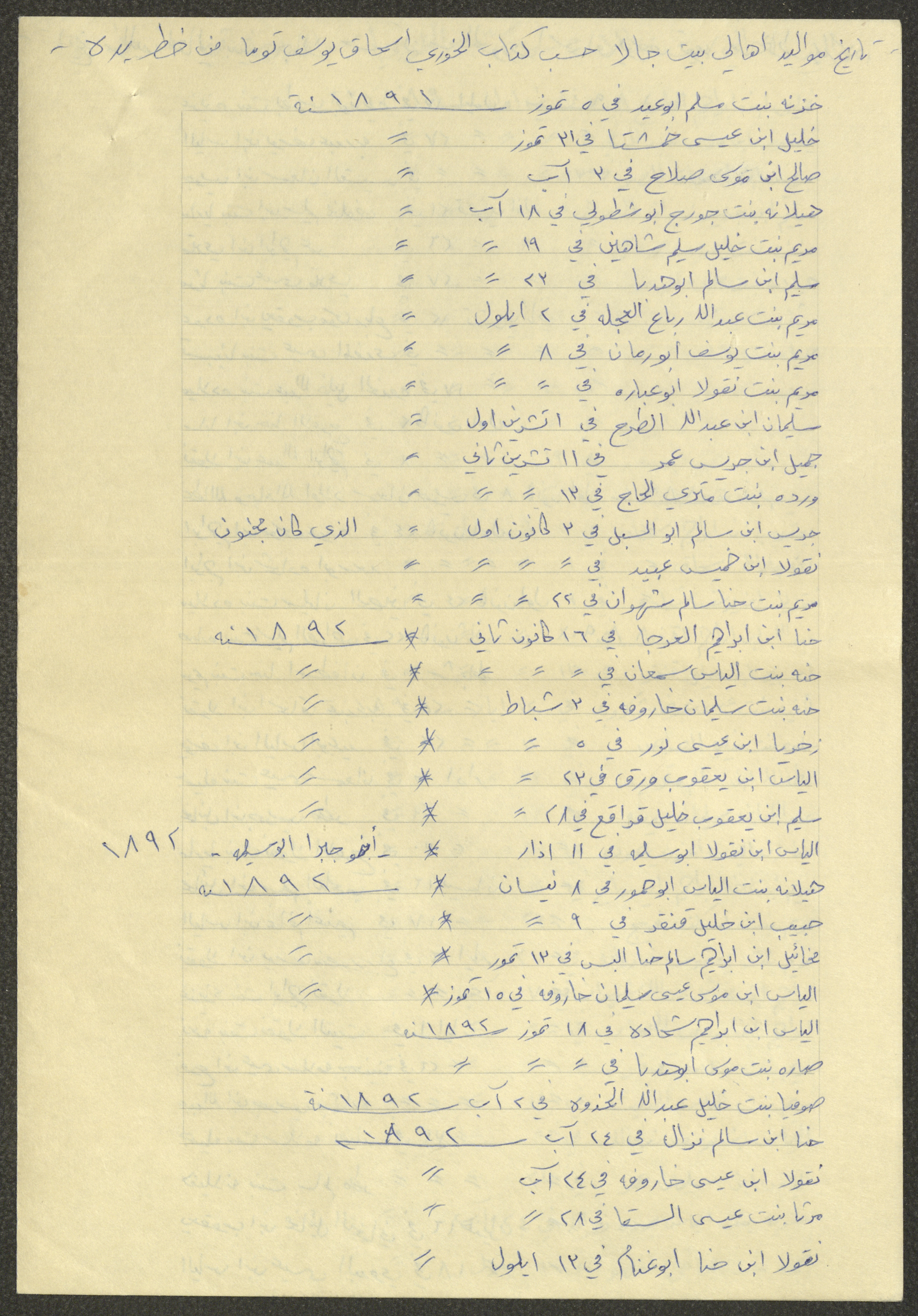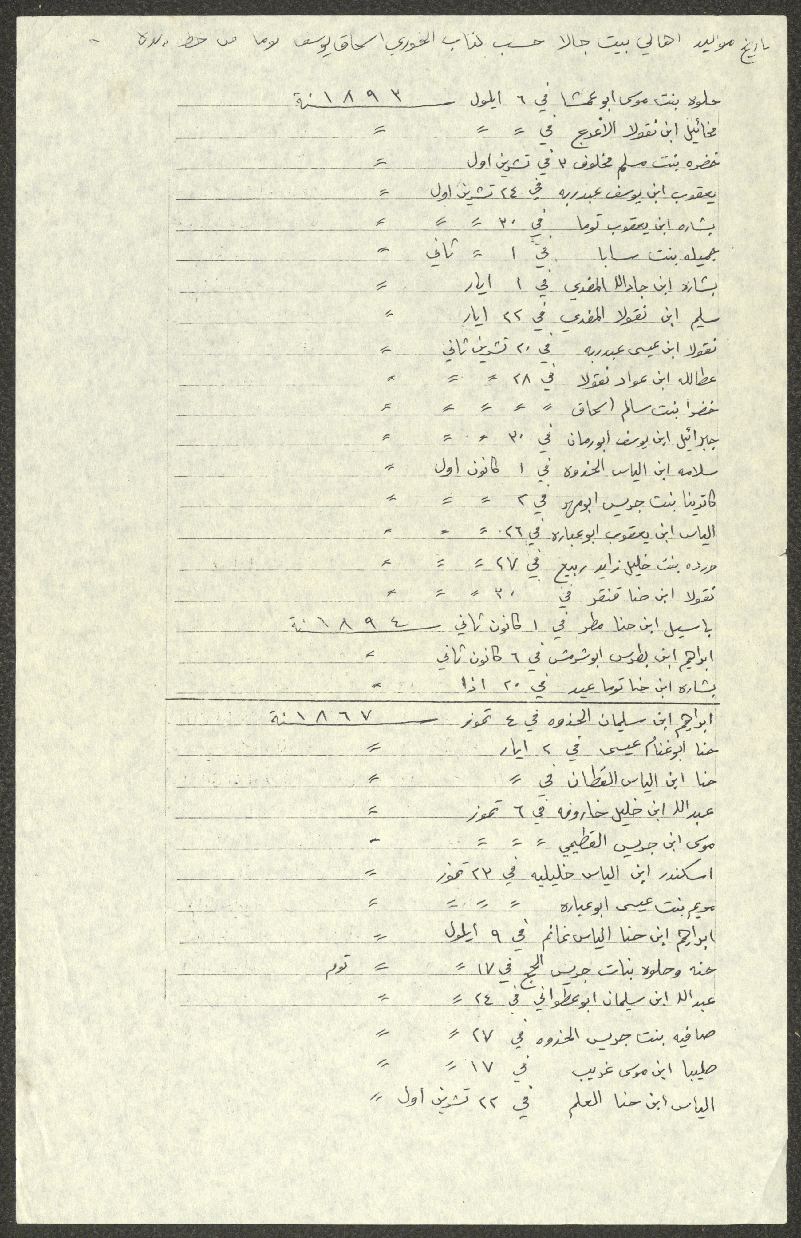 This document shows a list of the names and dates of births of the people of Beit Jala in the 19th and 20th centuries, compiled by Father Ishaq Touma and put in a historical book. Boutros Jeries Touma later collected and handwrote them during his stay in Chile in lists, which he would later send along with the letters he sent to his nephew Khalil Touma in Beit Jala during the 1980s.