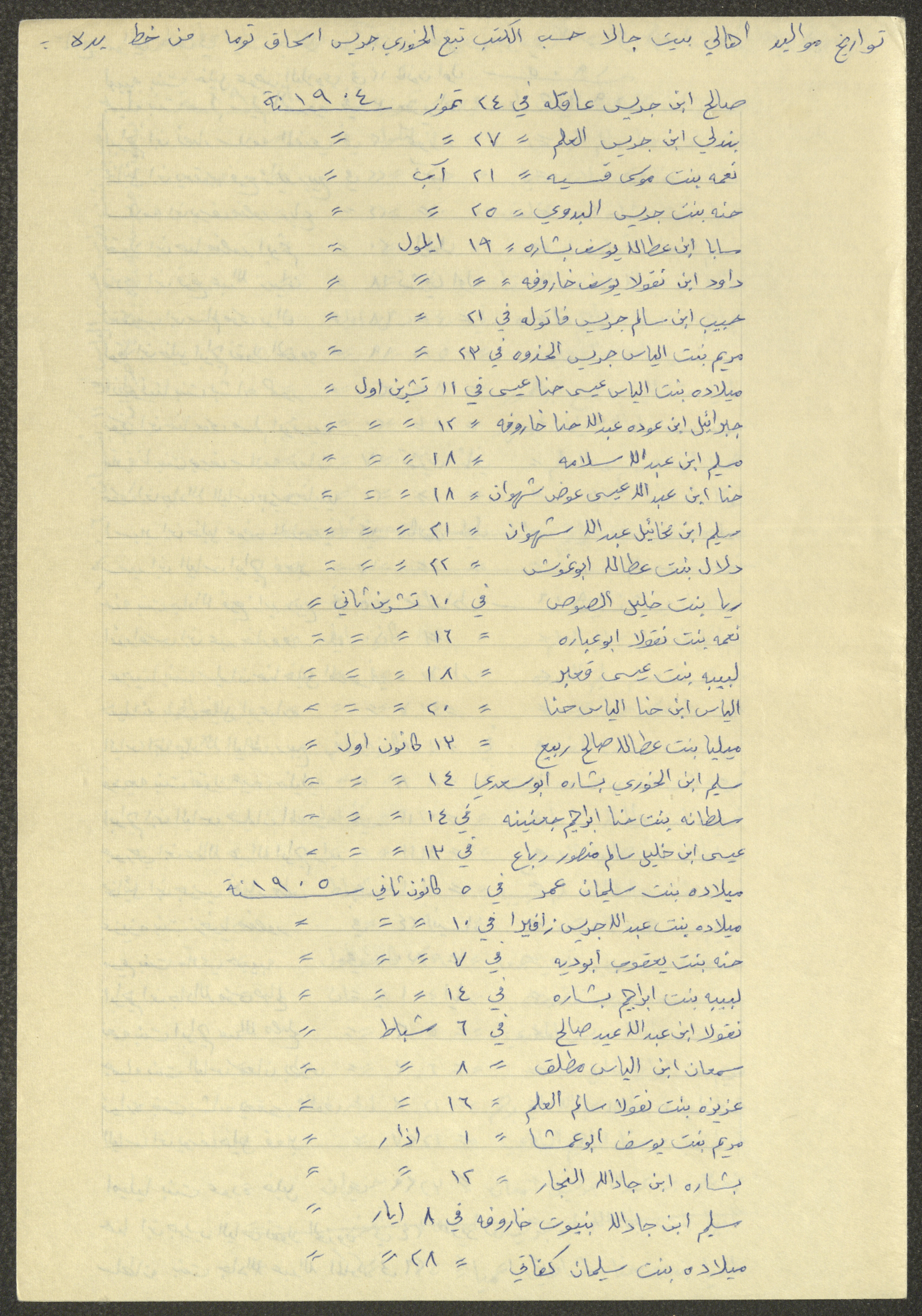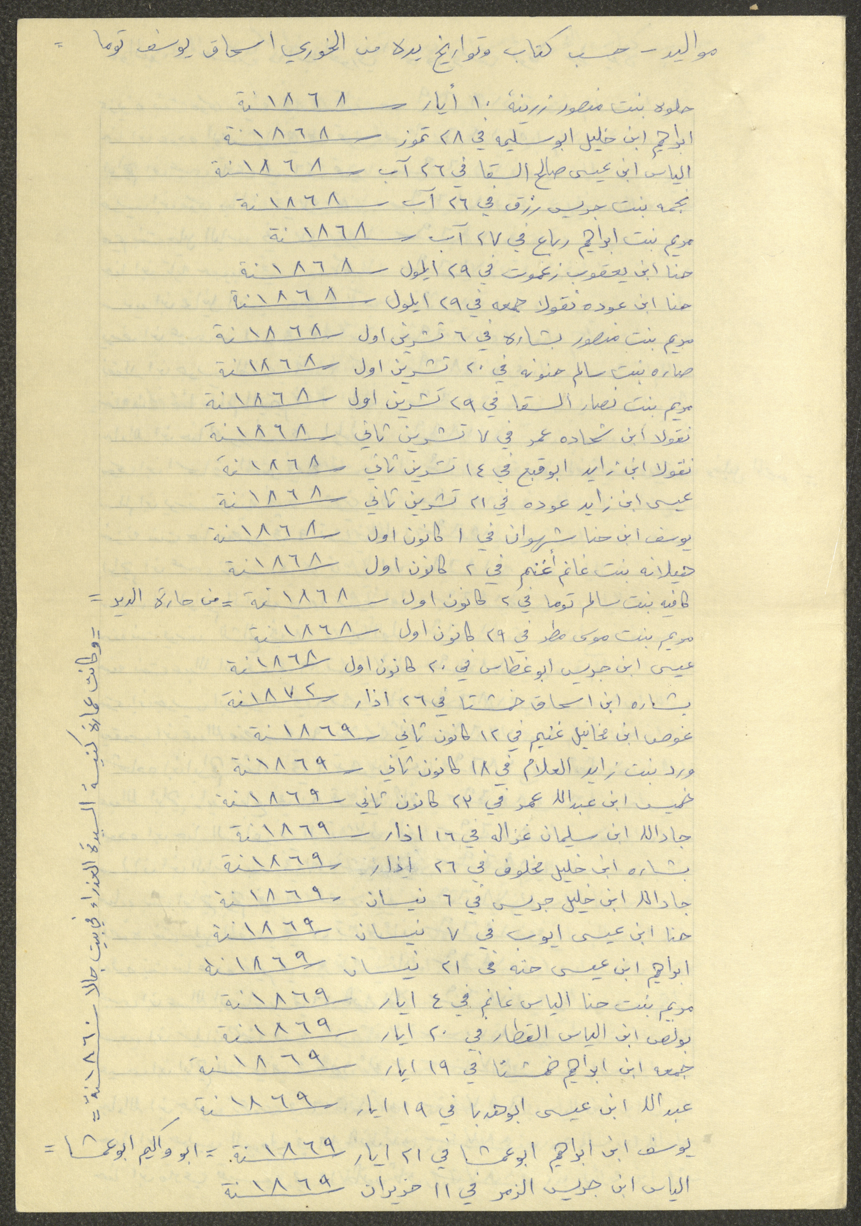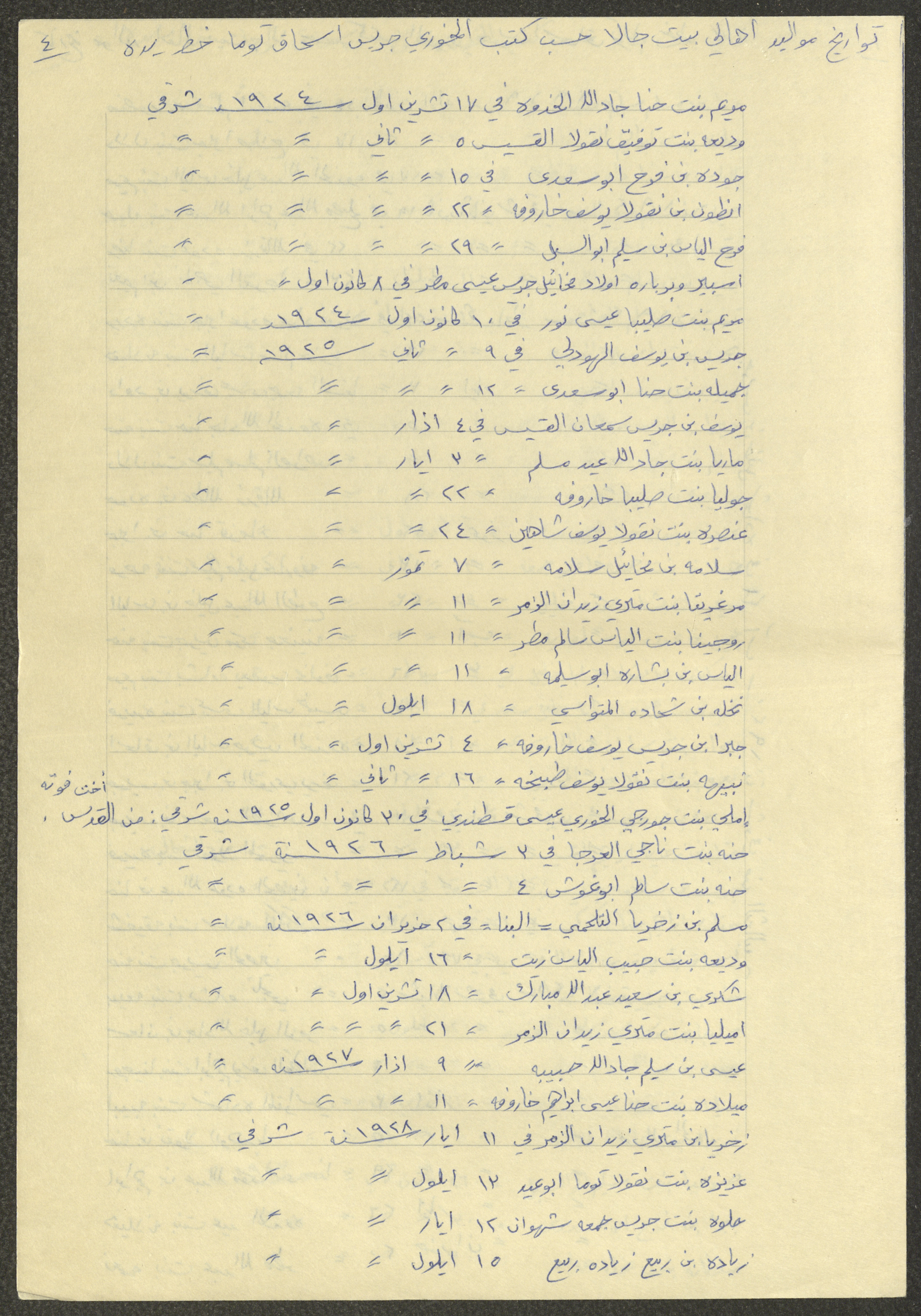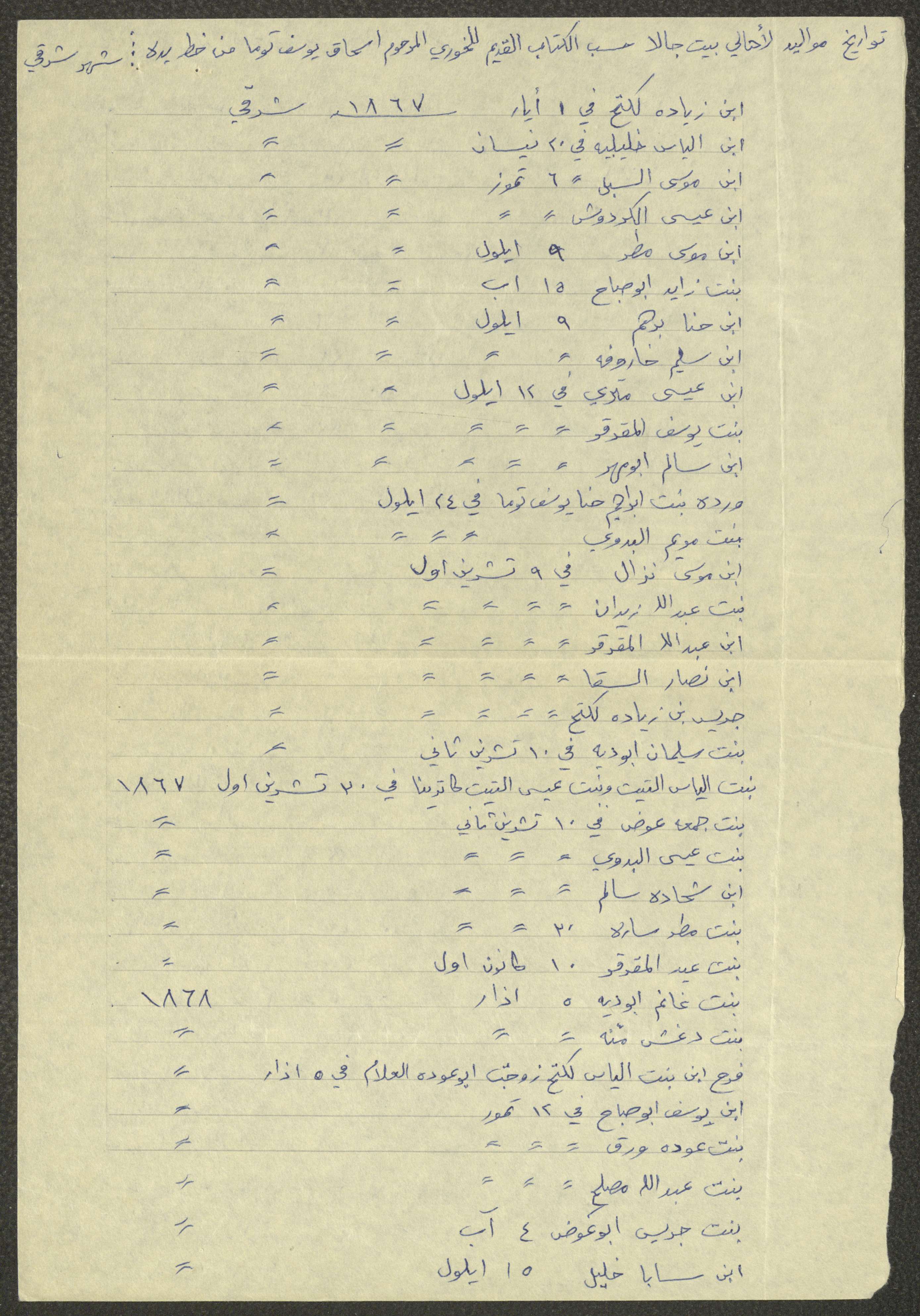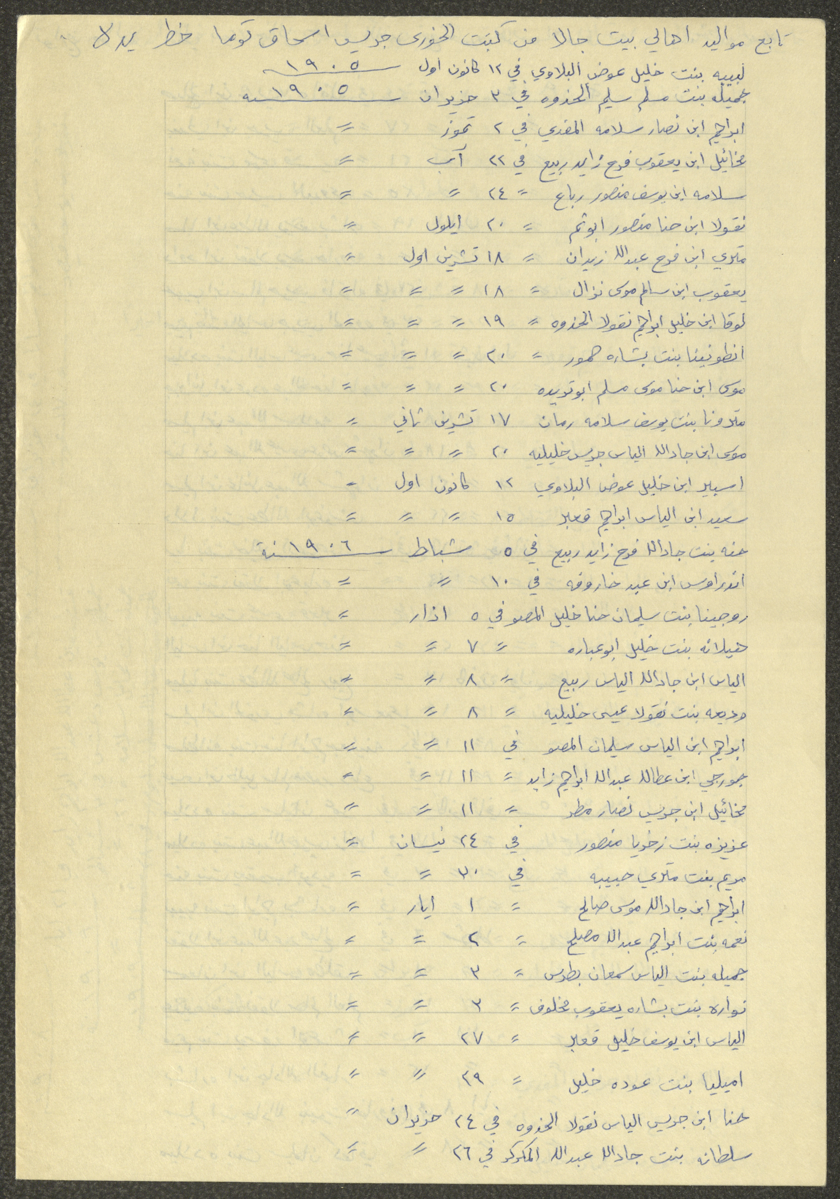 This document shows a list of the names and dates of births of the people of Beit Jala in the 19th and 20th centuries, compiled by Father Ishaq Touma and put in a historical book. Boutros Jeries Touma later collected and handwrote them during his stay in Chile in lists, which he would later send along with the letters he sent to his nephew Khalil Touma in Beit Jala during the 1980s.