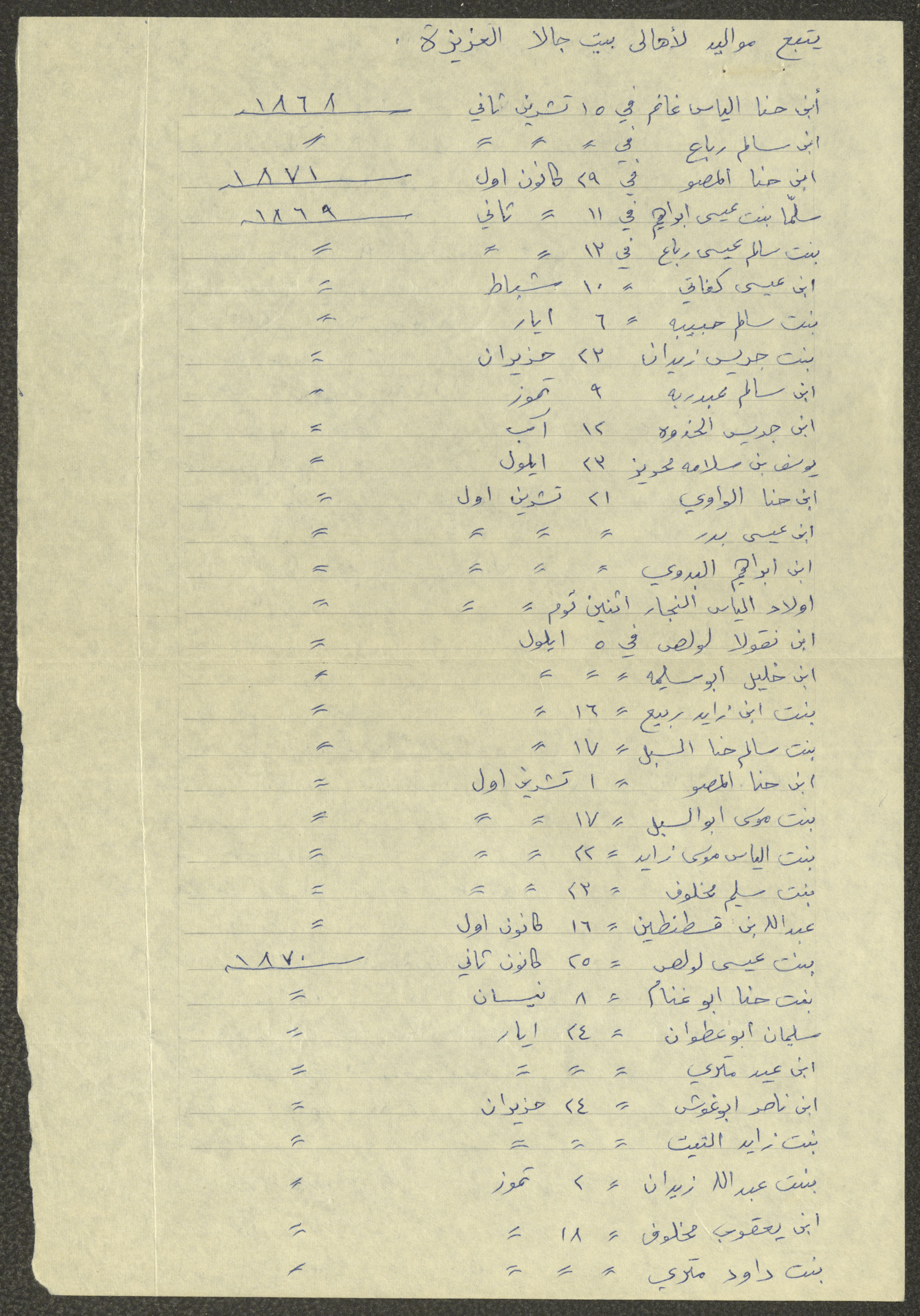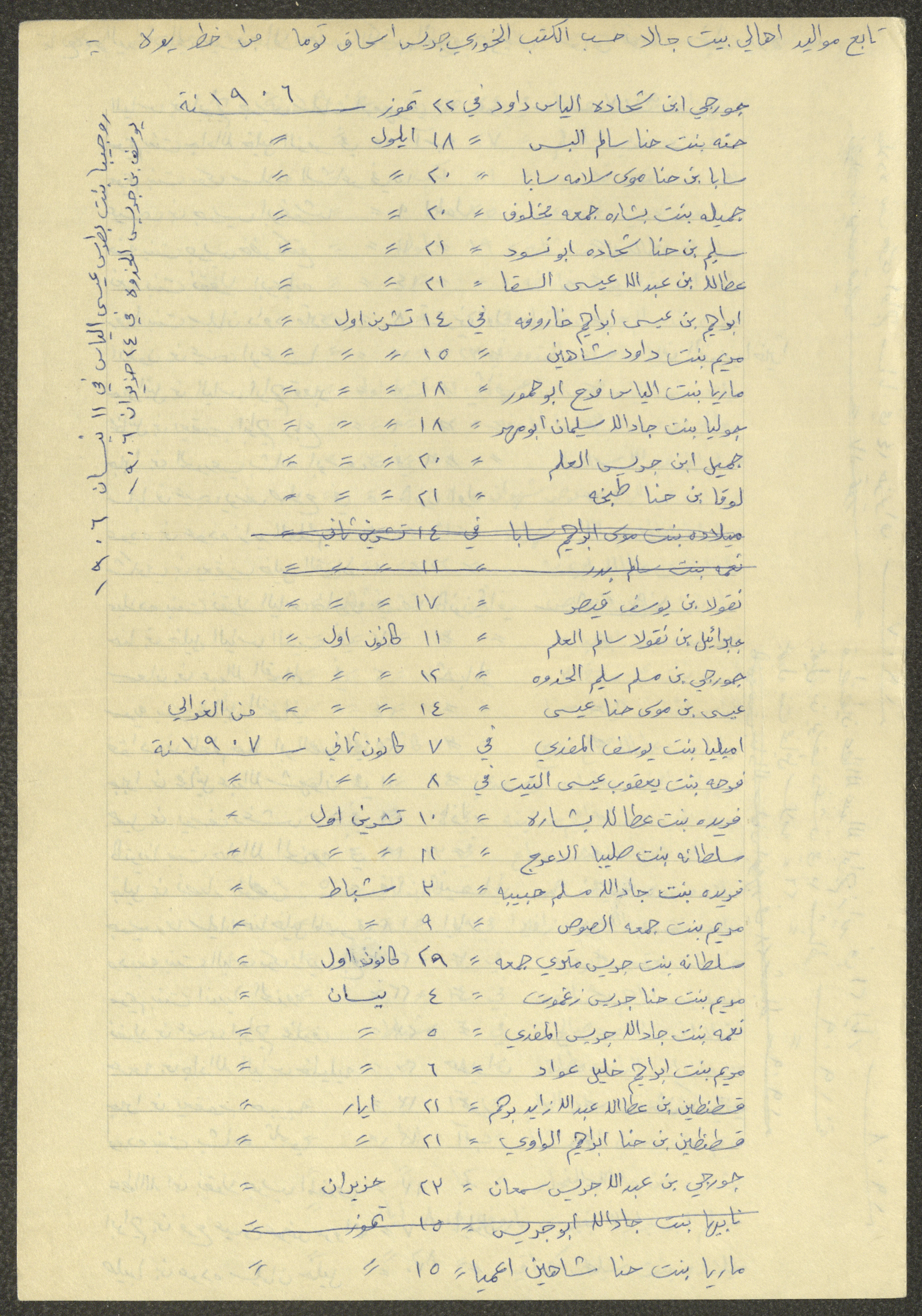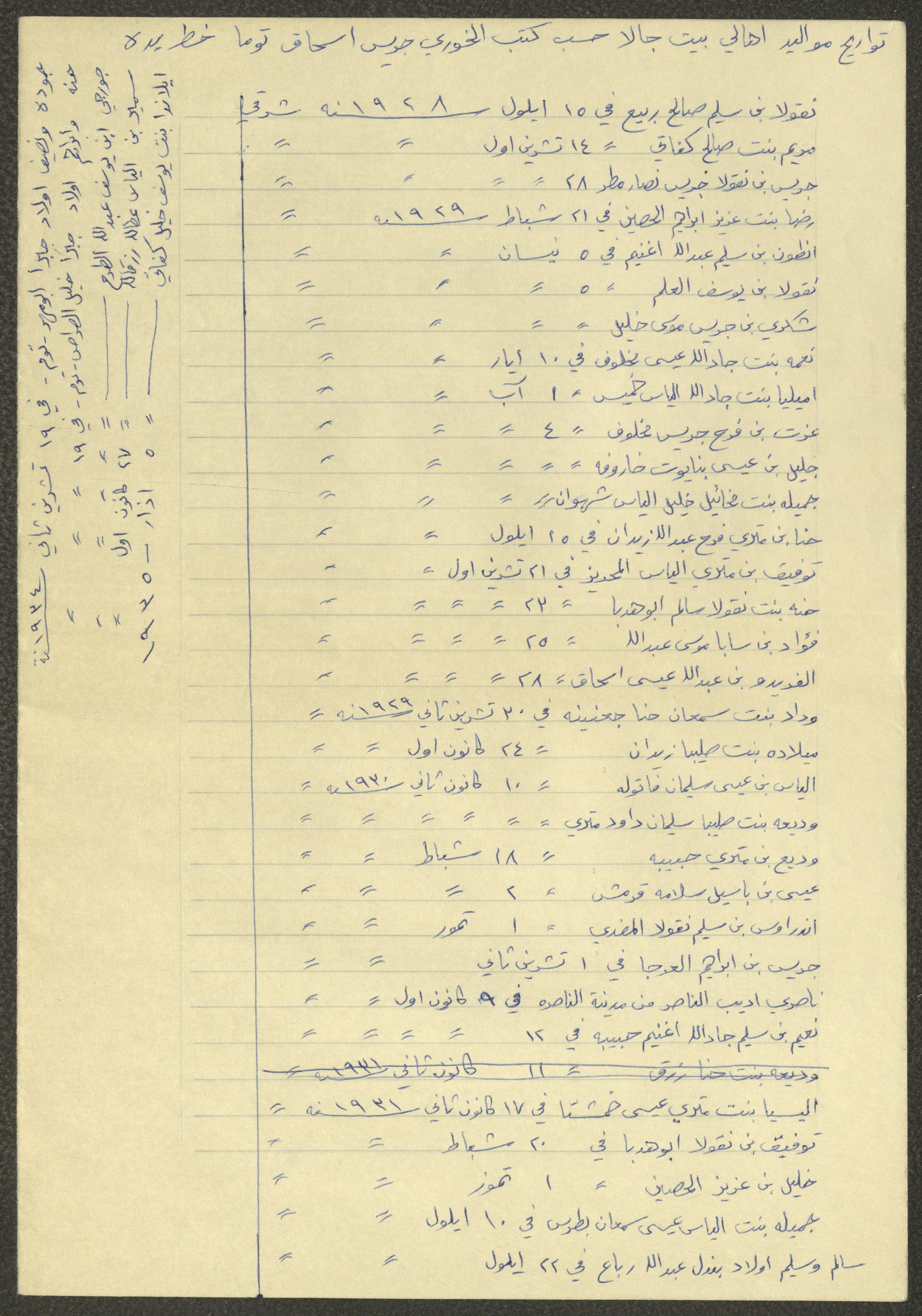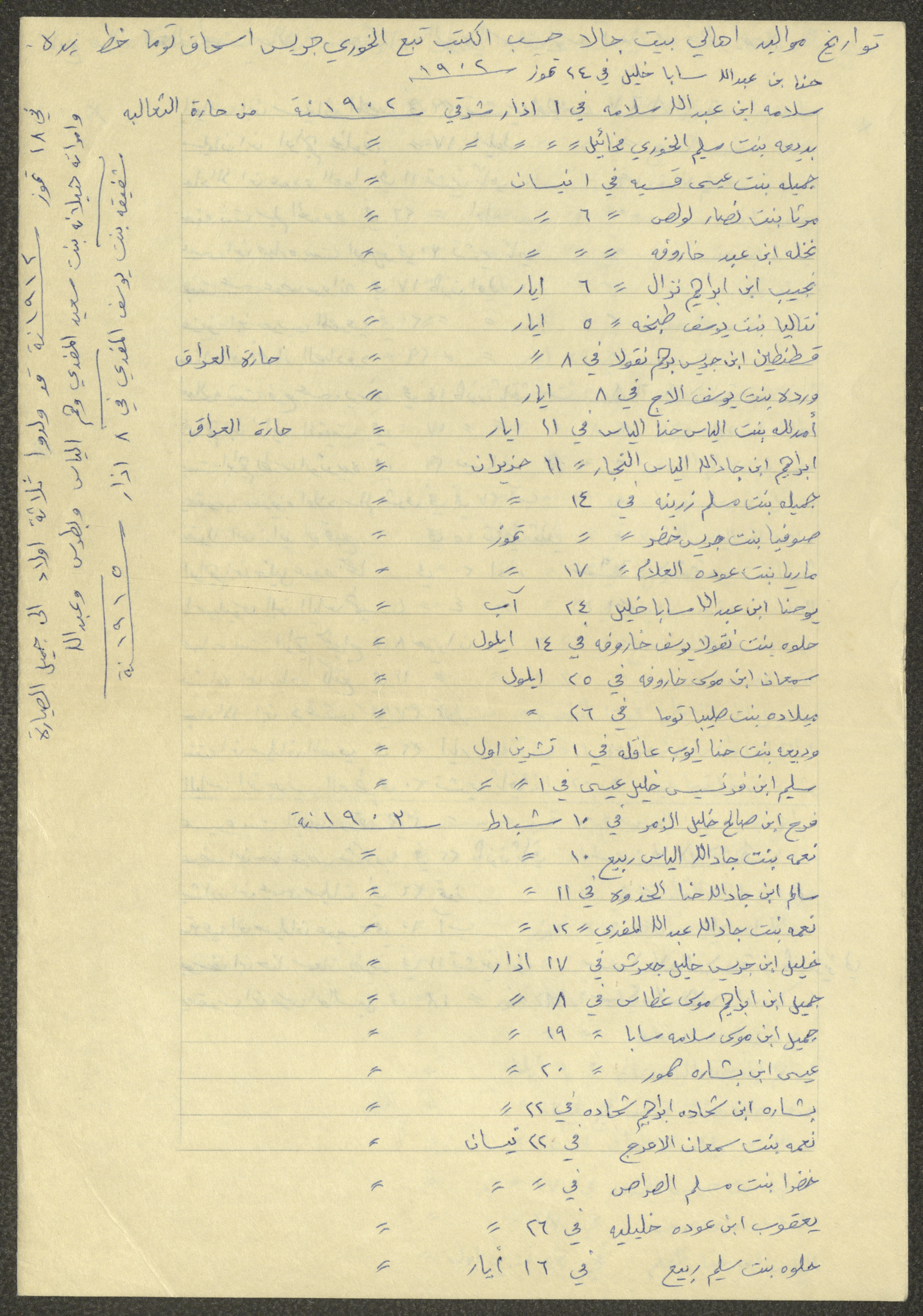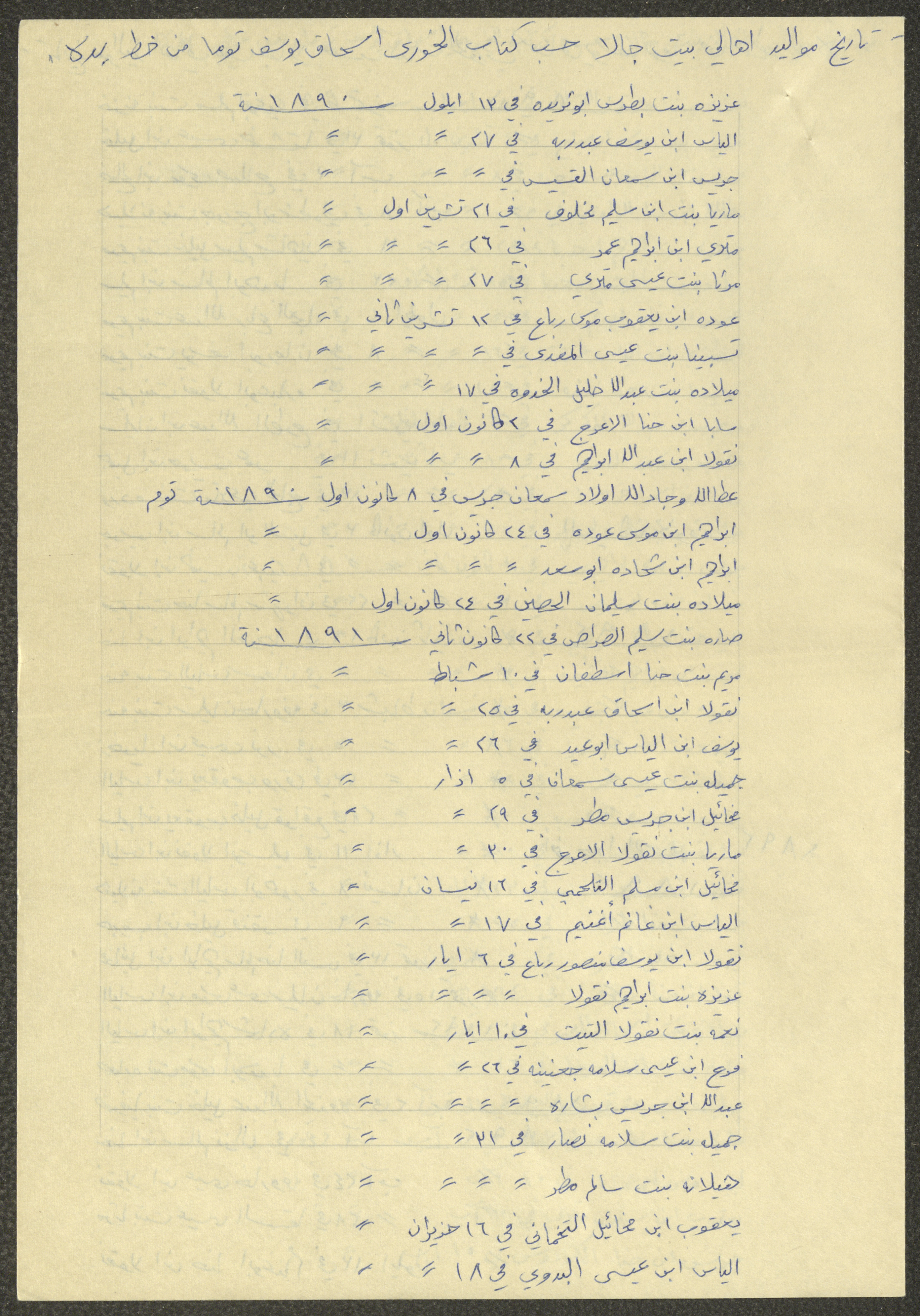 This document shows a list of the names and dates of births of the people of Beit Jala in the 19th and 20th centuries, compiled by Father Ishaq Touma and put in a historical book. Boutros Jeries Touma later collected and handwrote them during his stay in Chile in lists, which he would later send along with the letters he sent to his nephew Khalil Touma in Beit Jala during the 1980s.
