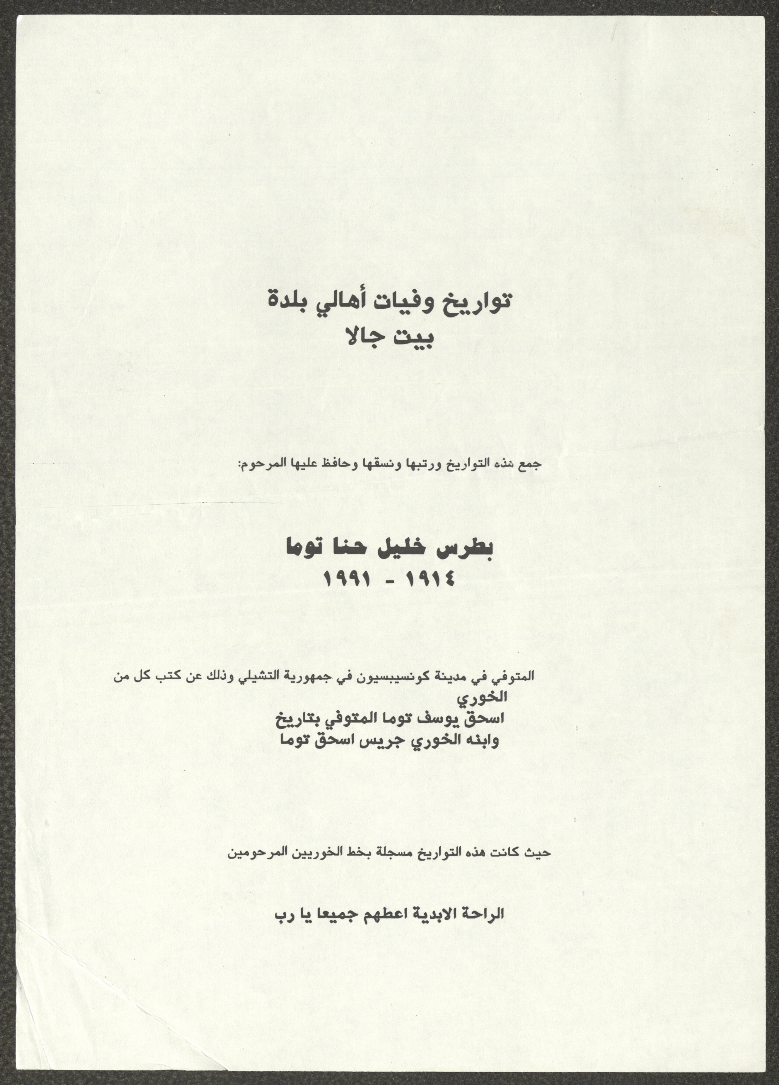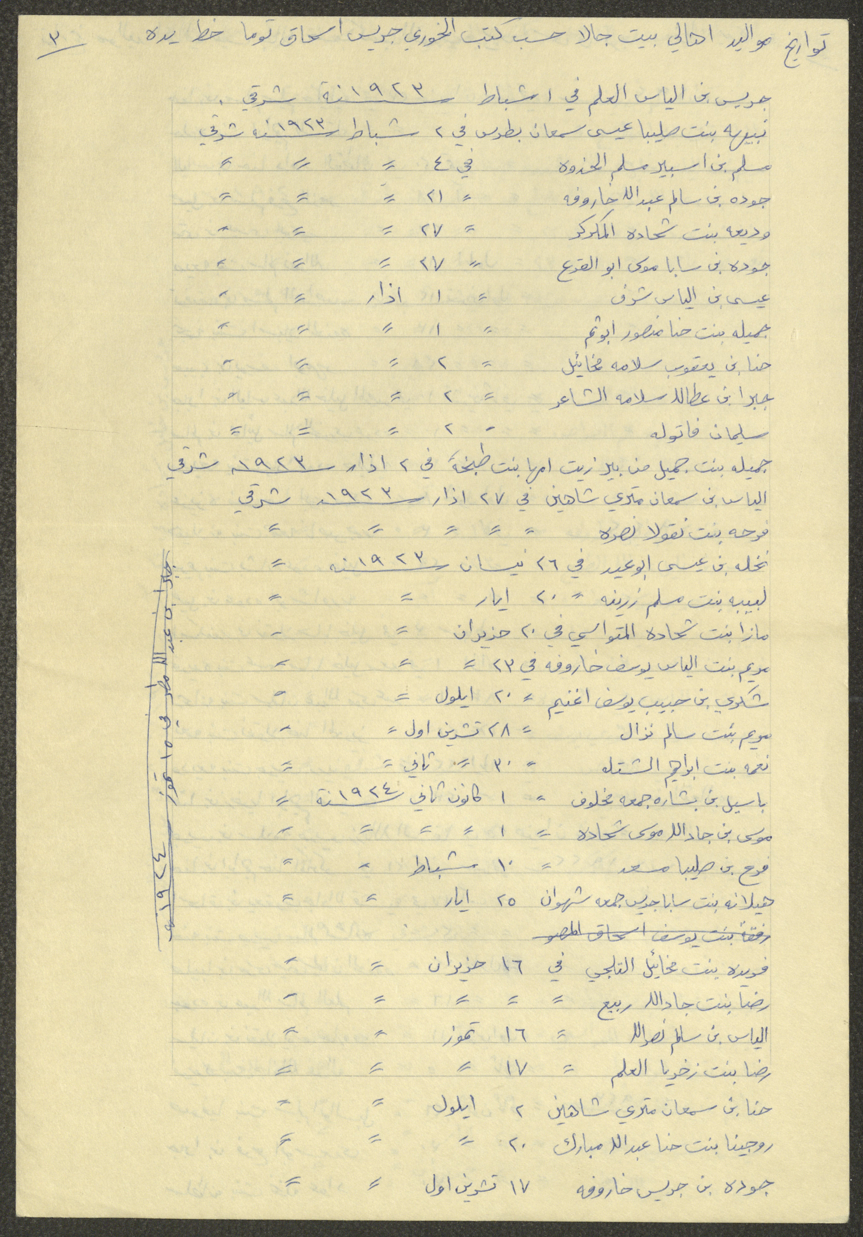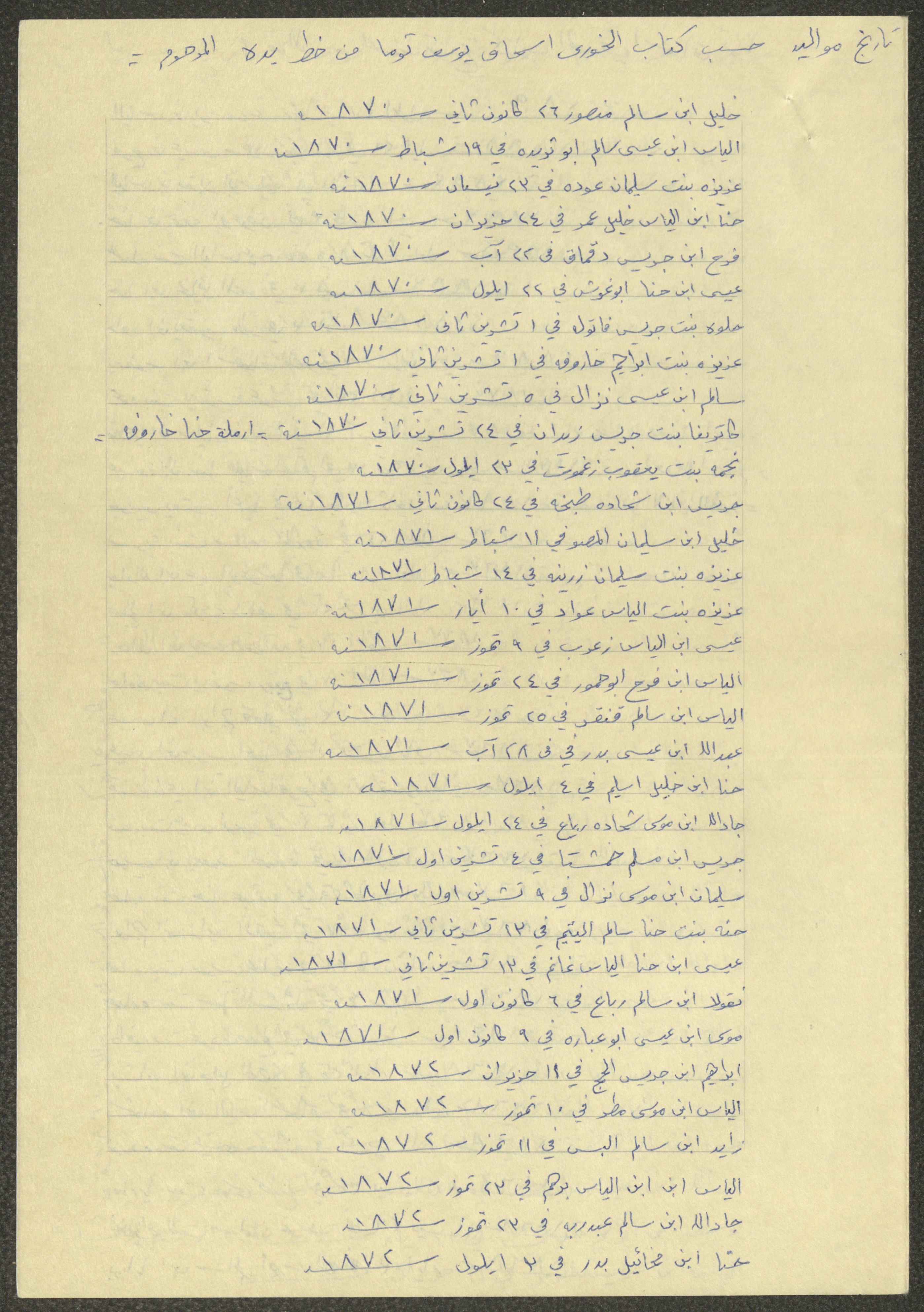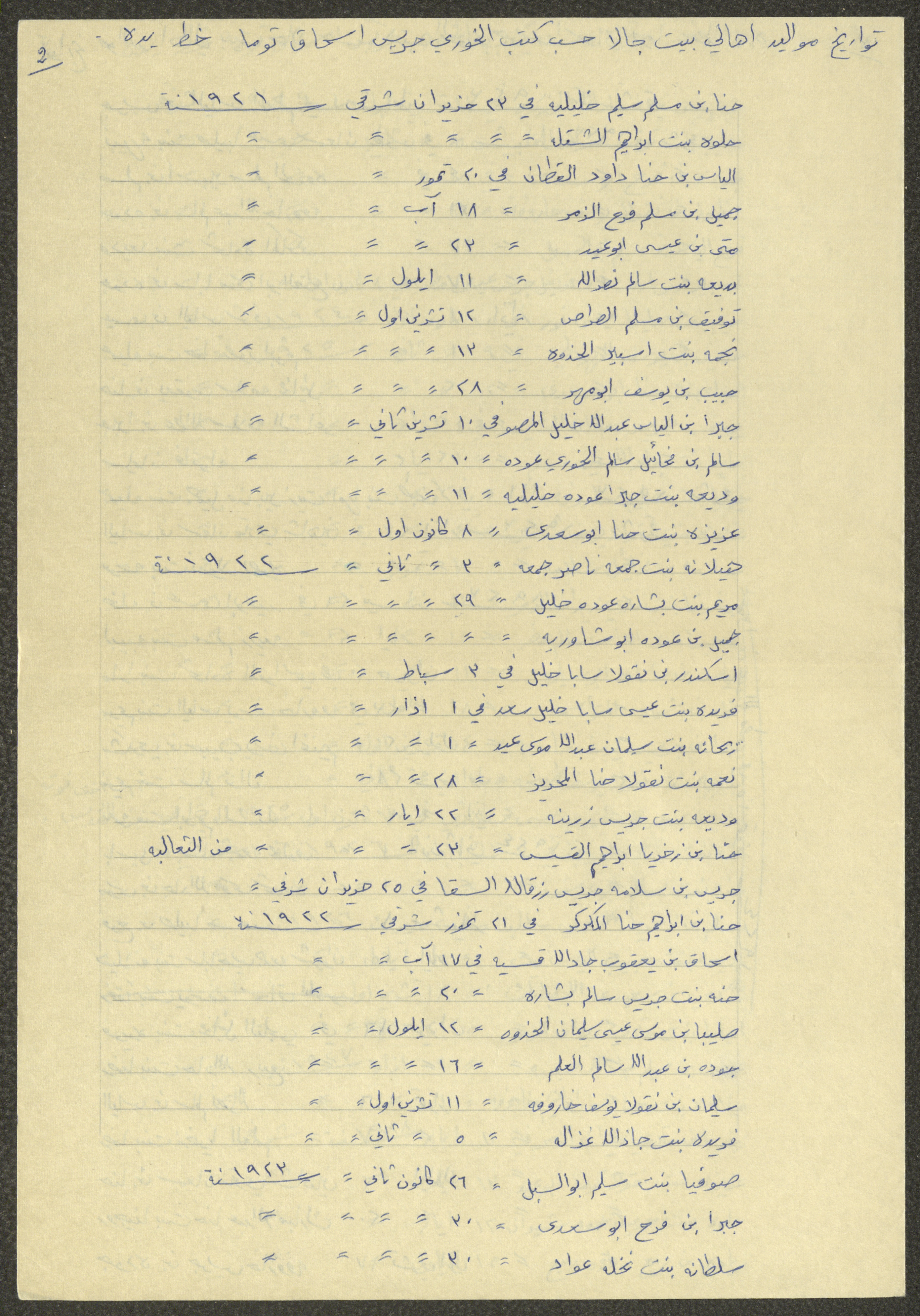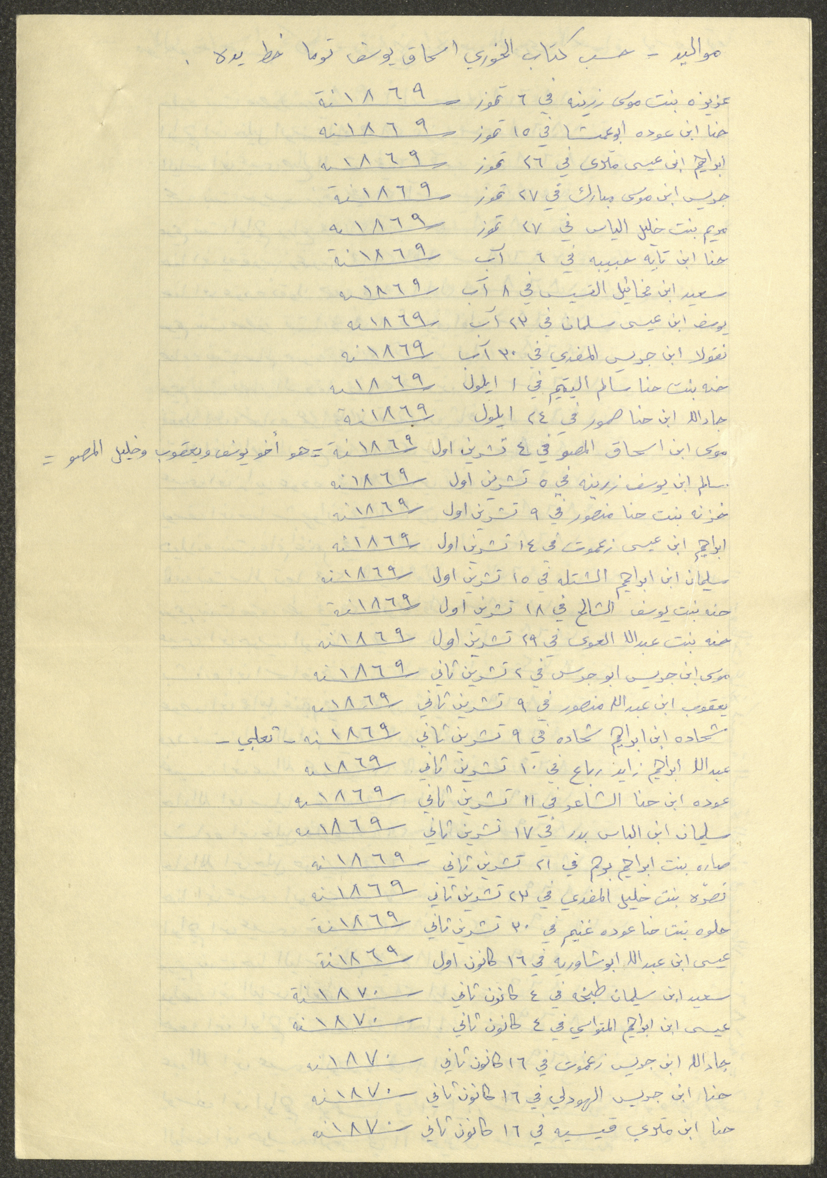This document shows a list of the names and dates of births of the people of Beit Jala in the 19th and 20th centuries, compiled by Father Ishaq Touma and put in a historical book. Boutros Jeries Touma later collected and handwrote them during his stay in Chile in lists, which he would later send along with the letters he sent to his nephew Khalil Touma in Beit Jala during the 1980s.