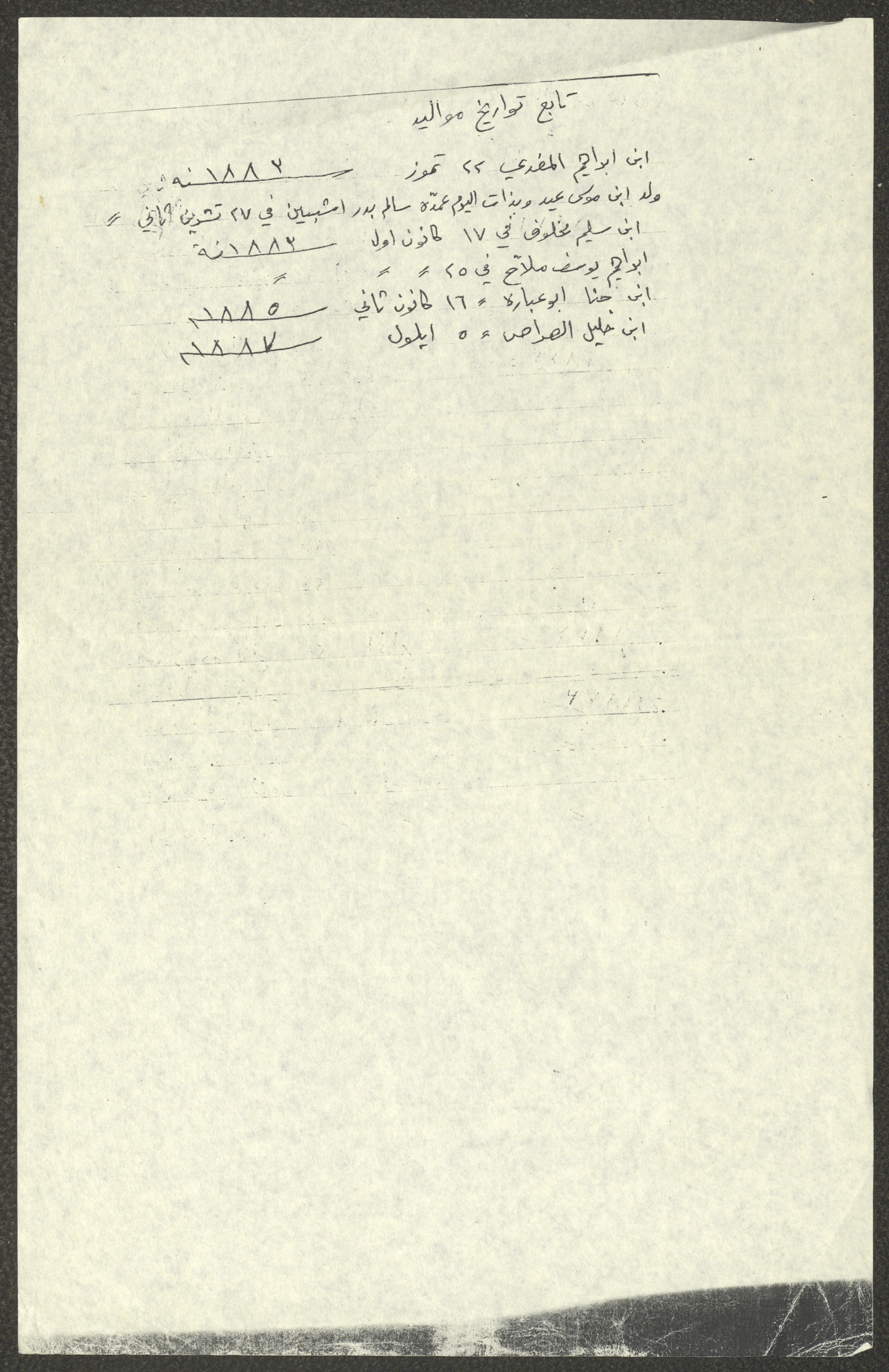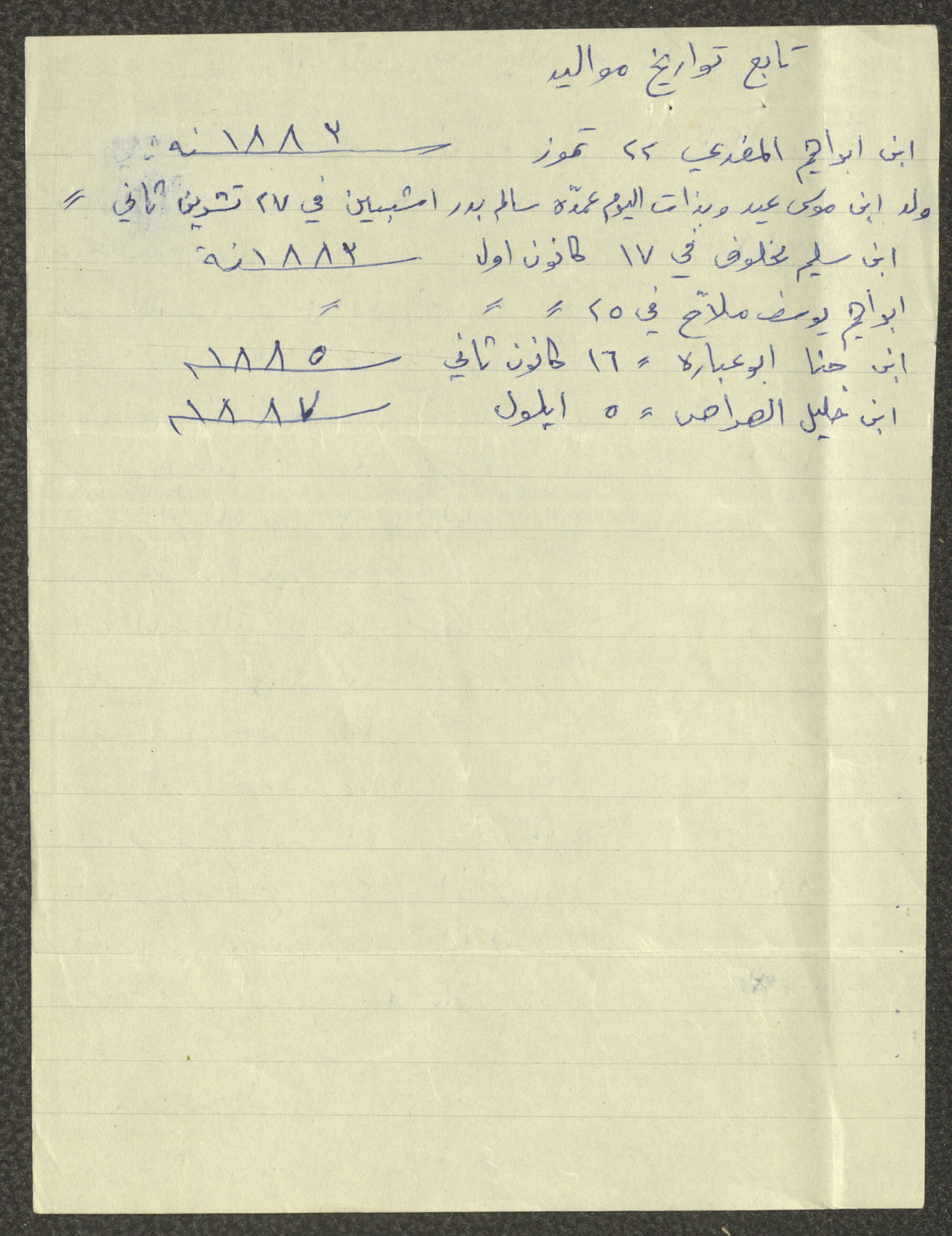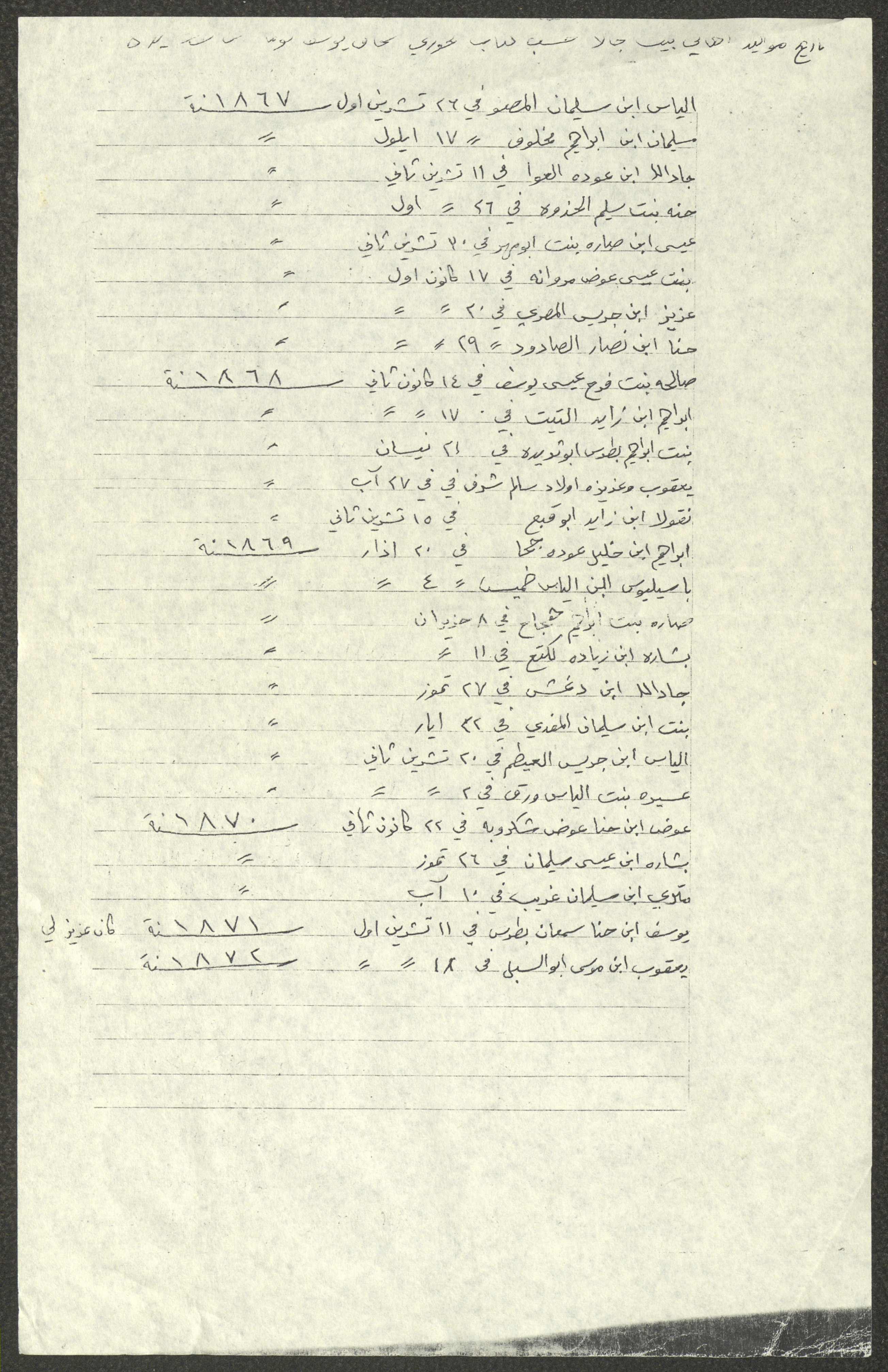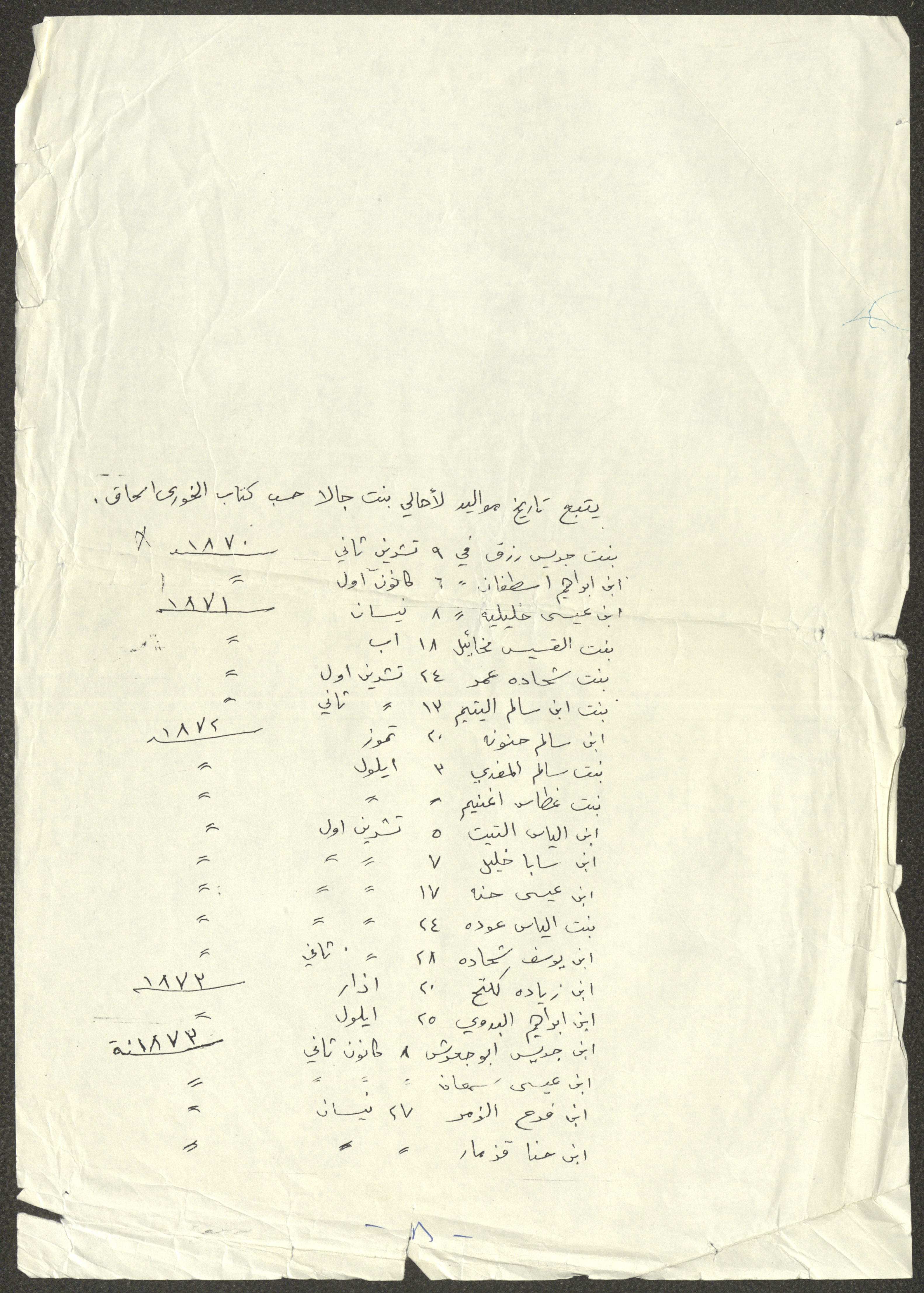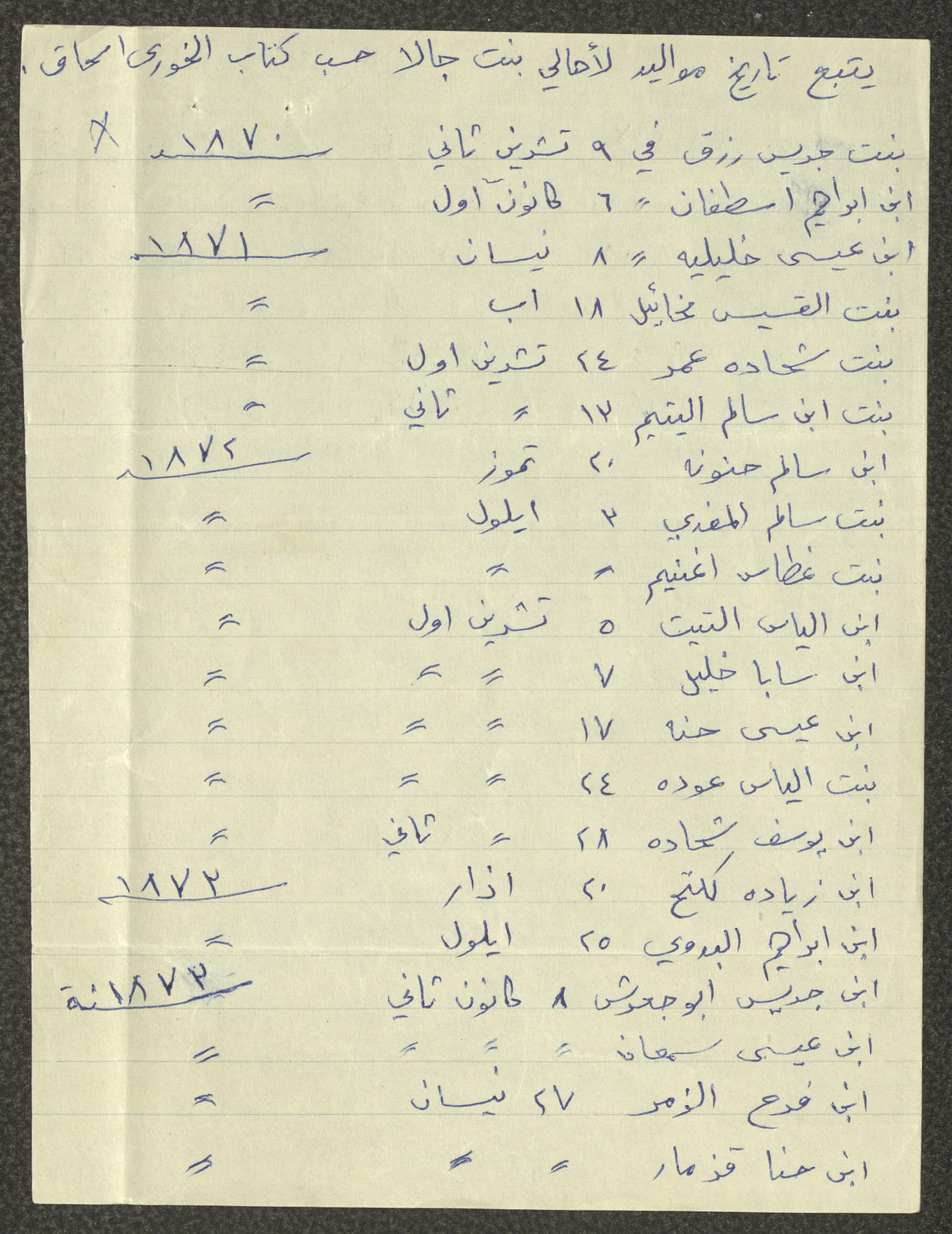 This document shows a list of the names and dates of births of the people of Beit Jala in the 19th and 20th centuries, compiled by Father Ishaq Touma and put in a historical book. Boutros Jeries Touma later collected and handwrote them during his stay in Chile in lists, which he would later send along with the letters he sent to his nephew Khalil Touma in Beit Jala during the 1980s.