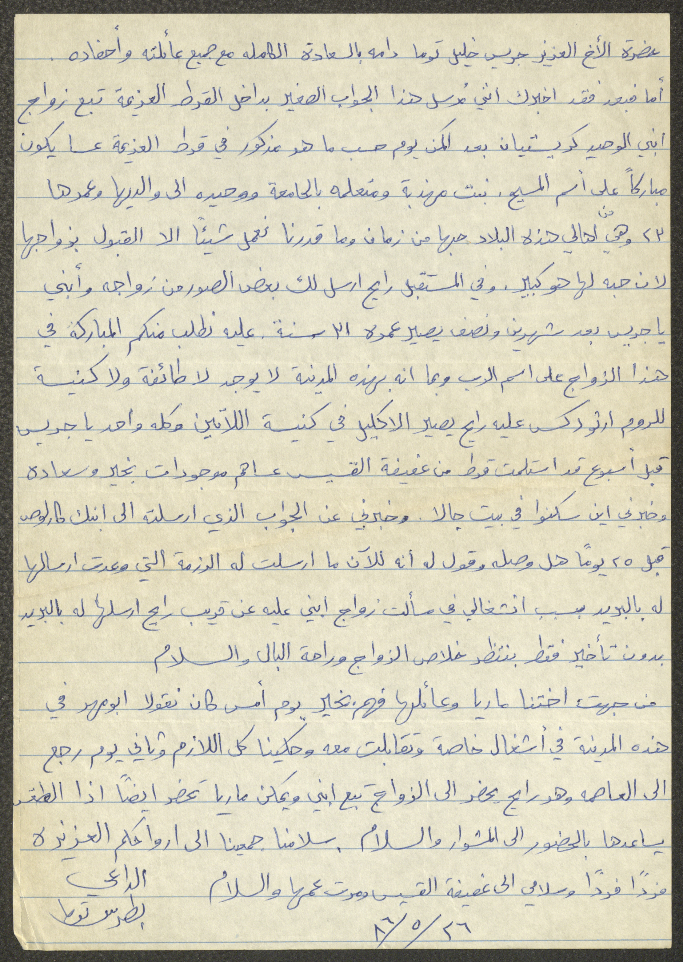 Sent on 26 May 1986, this document shows a letter from Boutros Touma in Chile to his brother Jeries in Beit Jala, attached with it is his son's wedding invitation scheduled to be held in Chile.