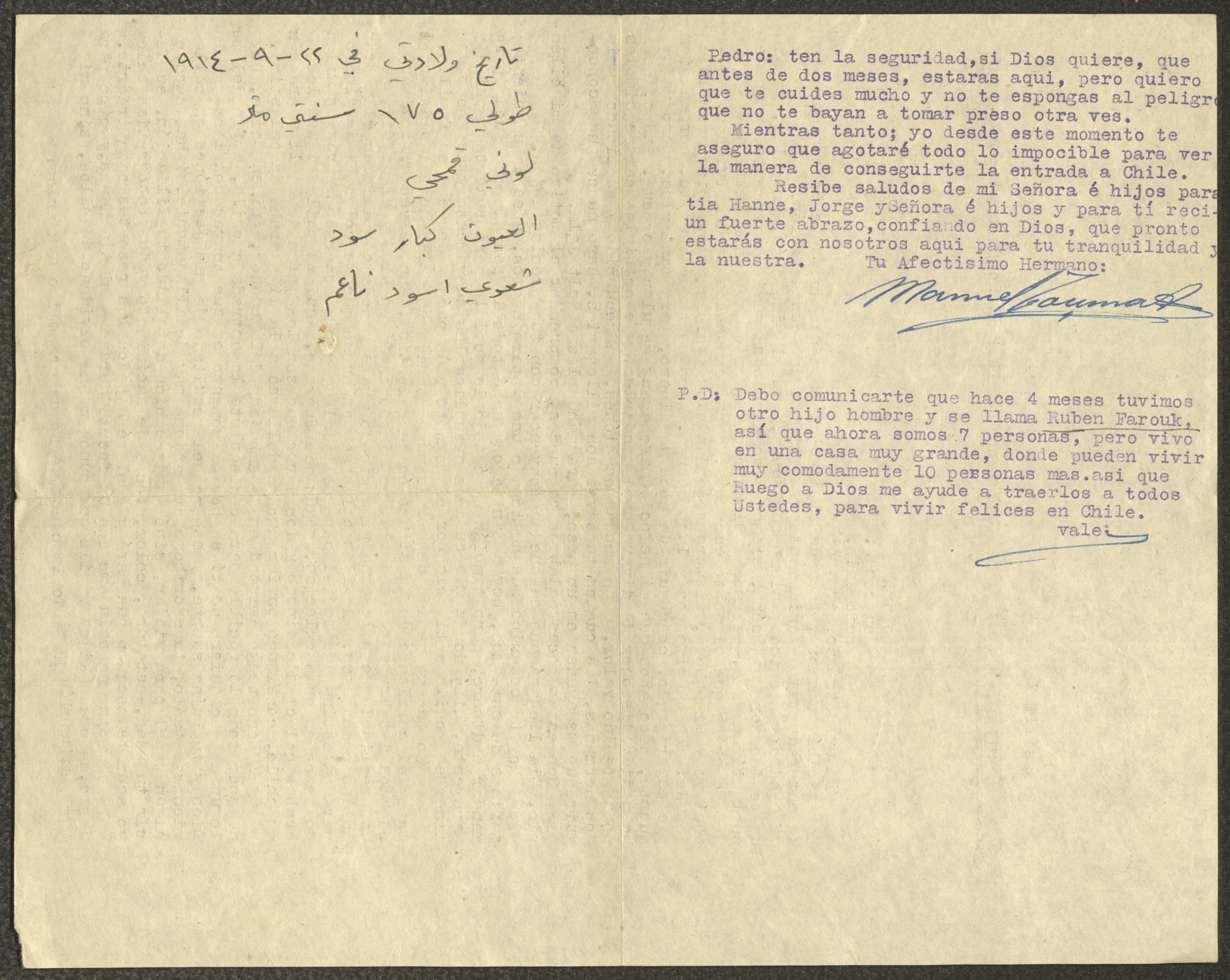 Printed in Spanish, this document shows a letter from Manuel Touma in the Republic of Chile to Boutros Touma in Beit Jala sent on 19 January 1949.