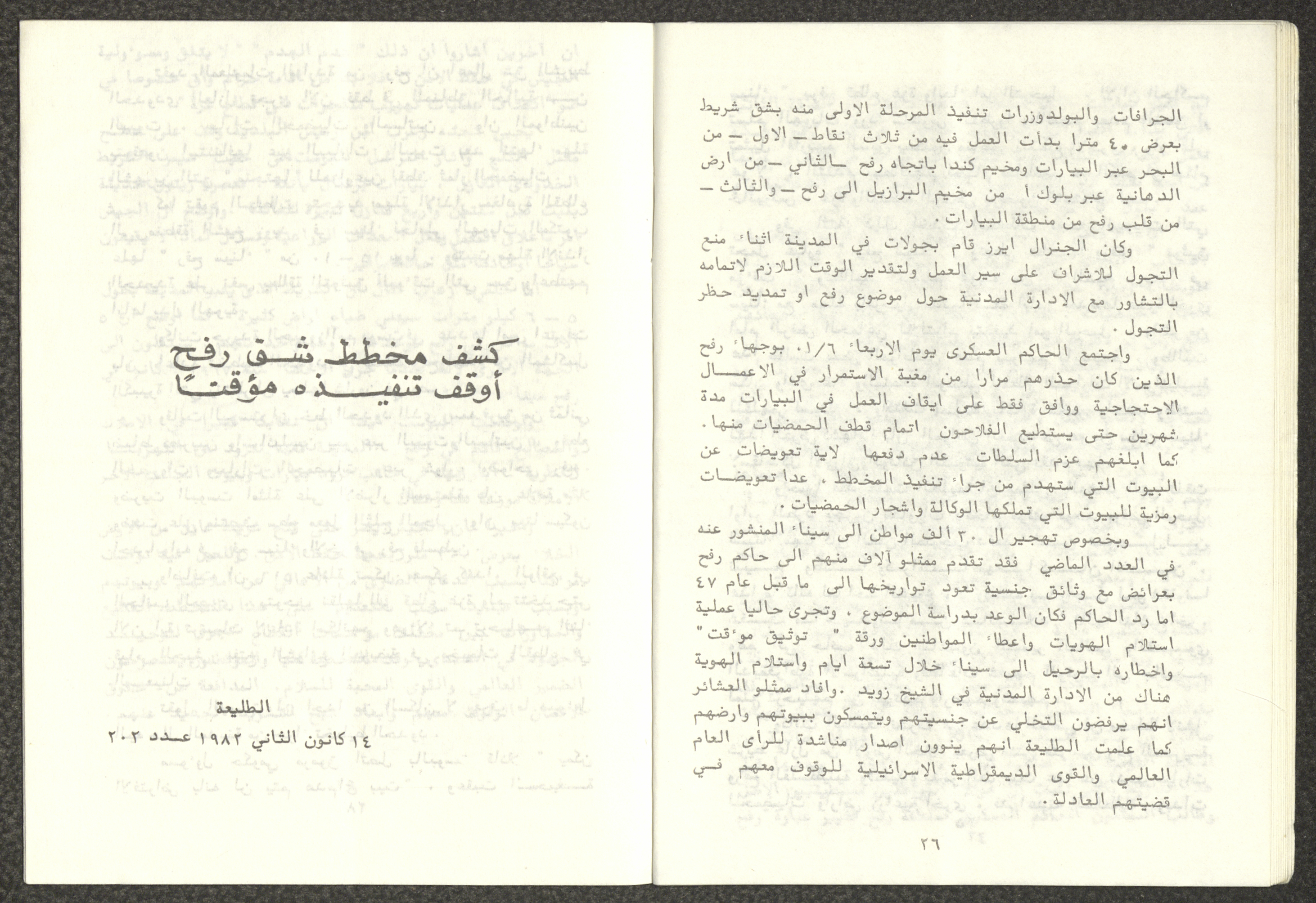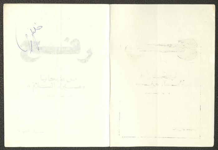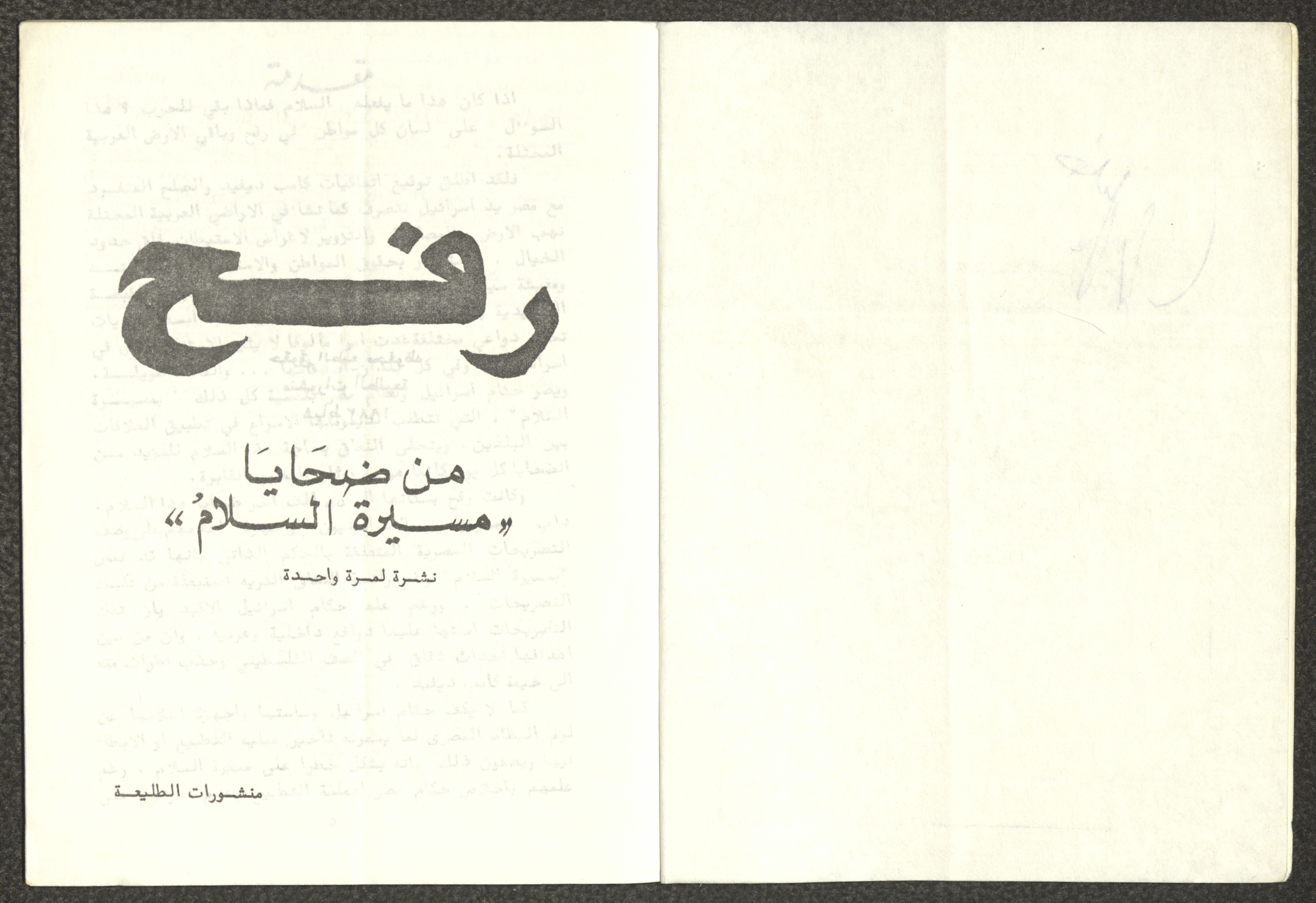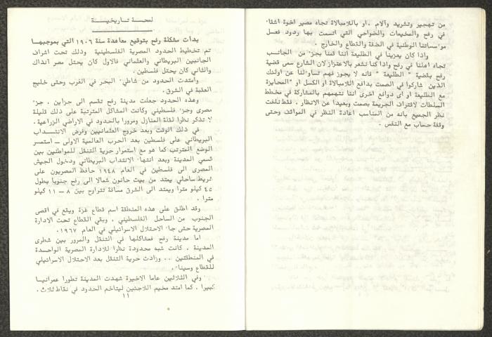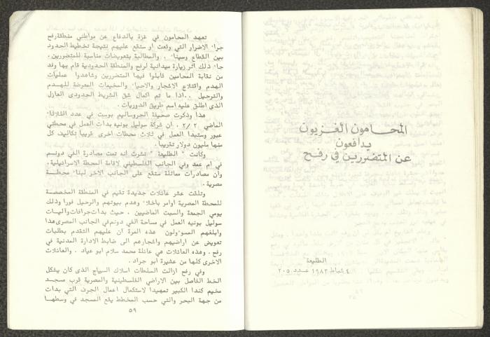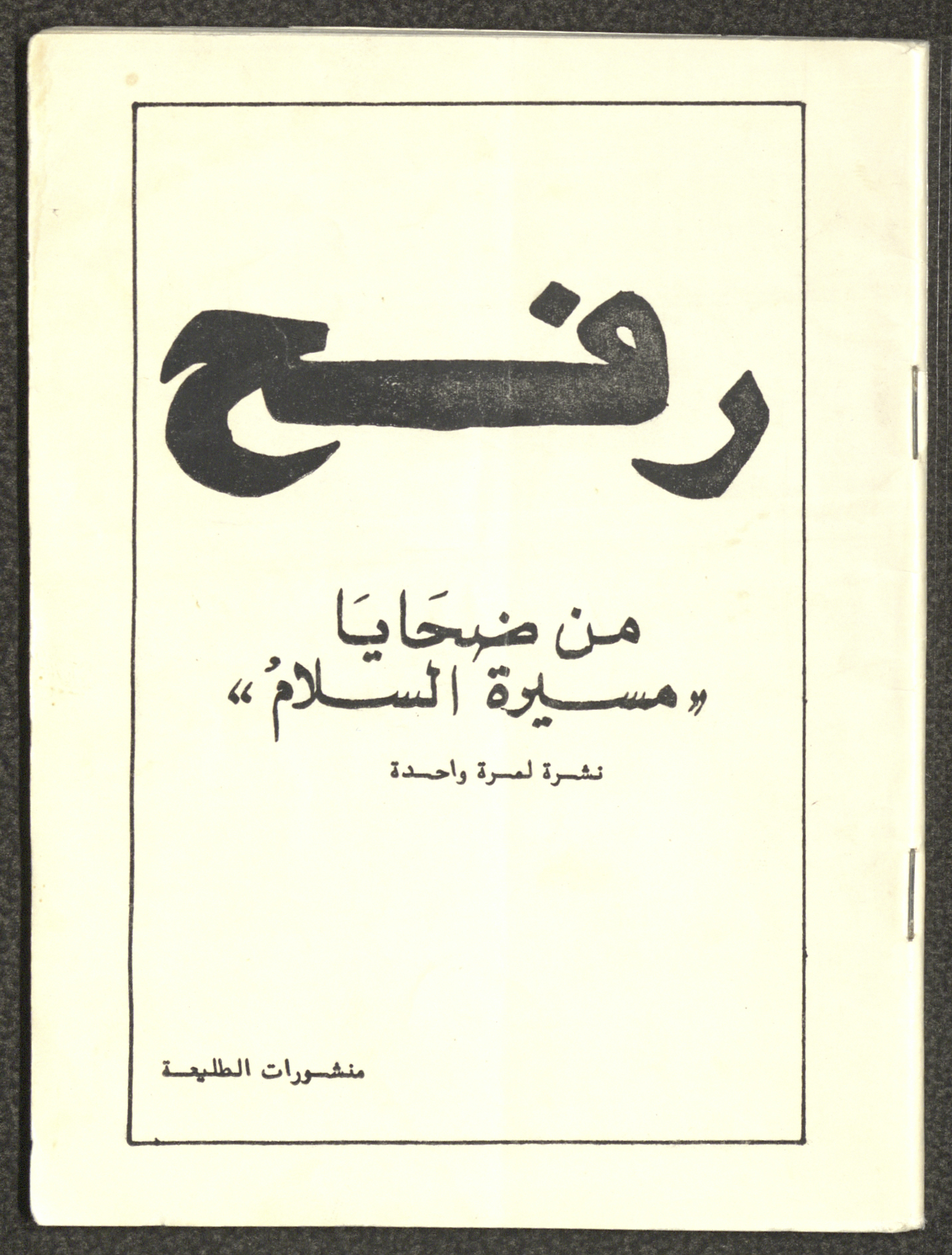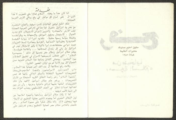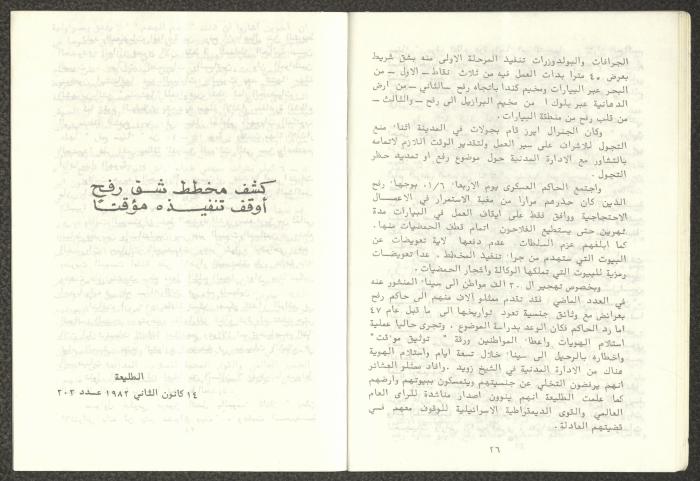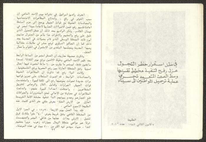 Issued by Attali'a Publications in February 1982, this one-time pamphlet is titled "Rafah, Victims of the Peace March" and it shows the history of the city of Rafah and its position in the Arab-Israeli conflict, it also contains several articles that were published in the various Attali'a issues during January and February of 1982.