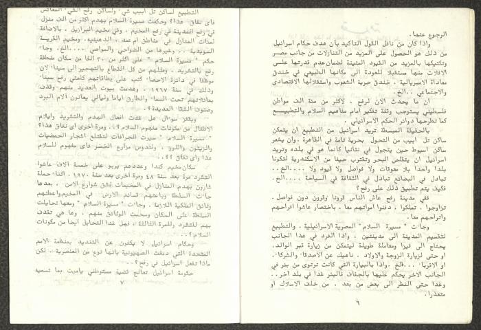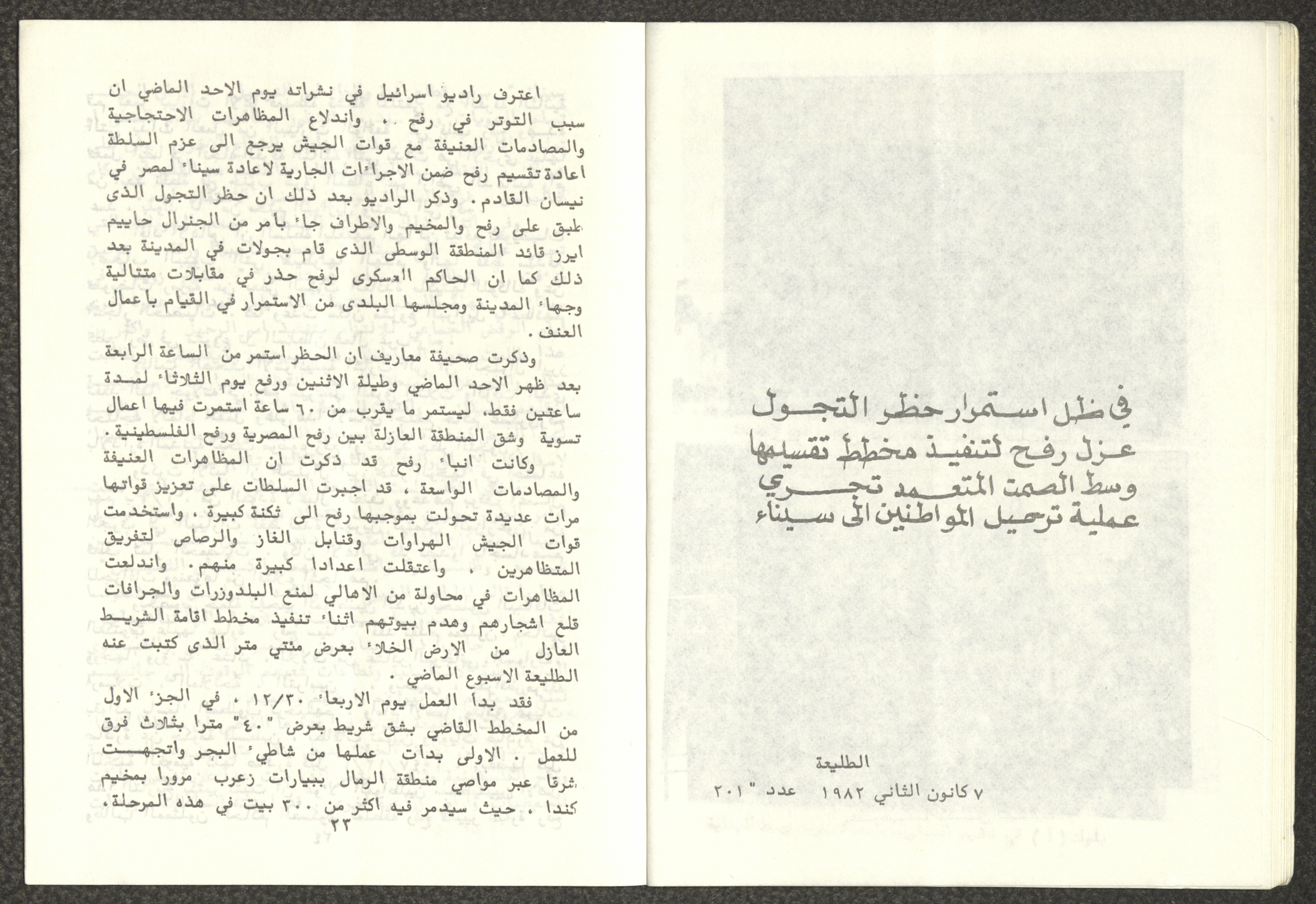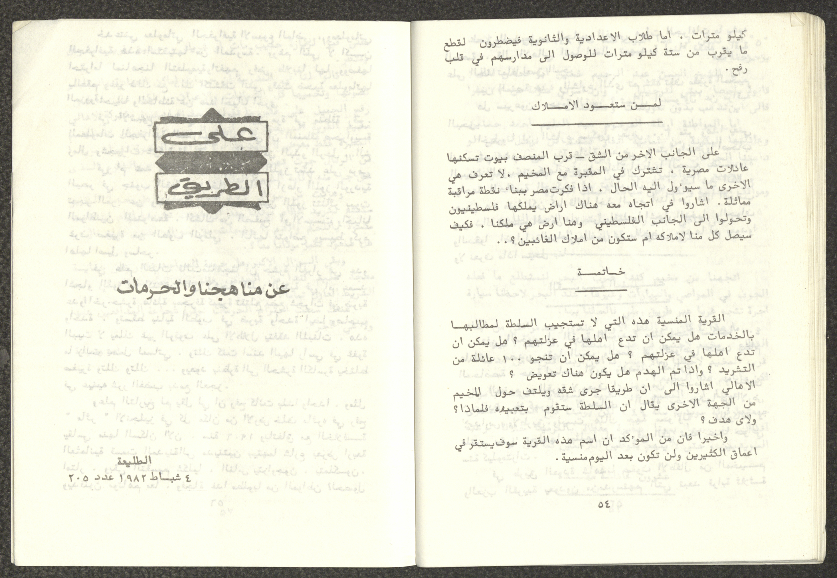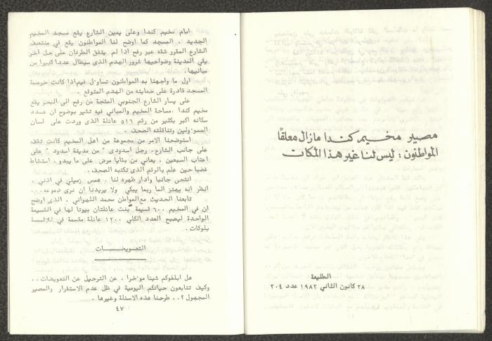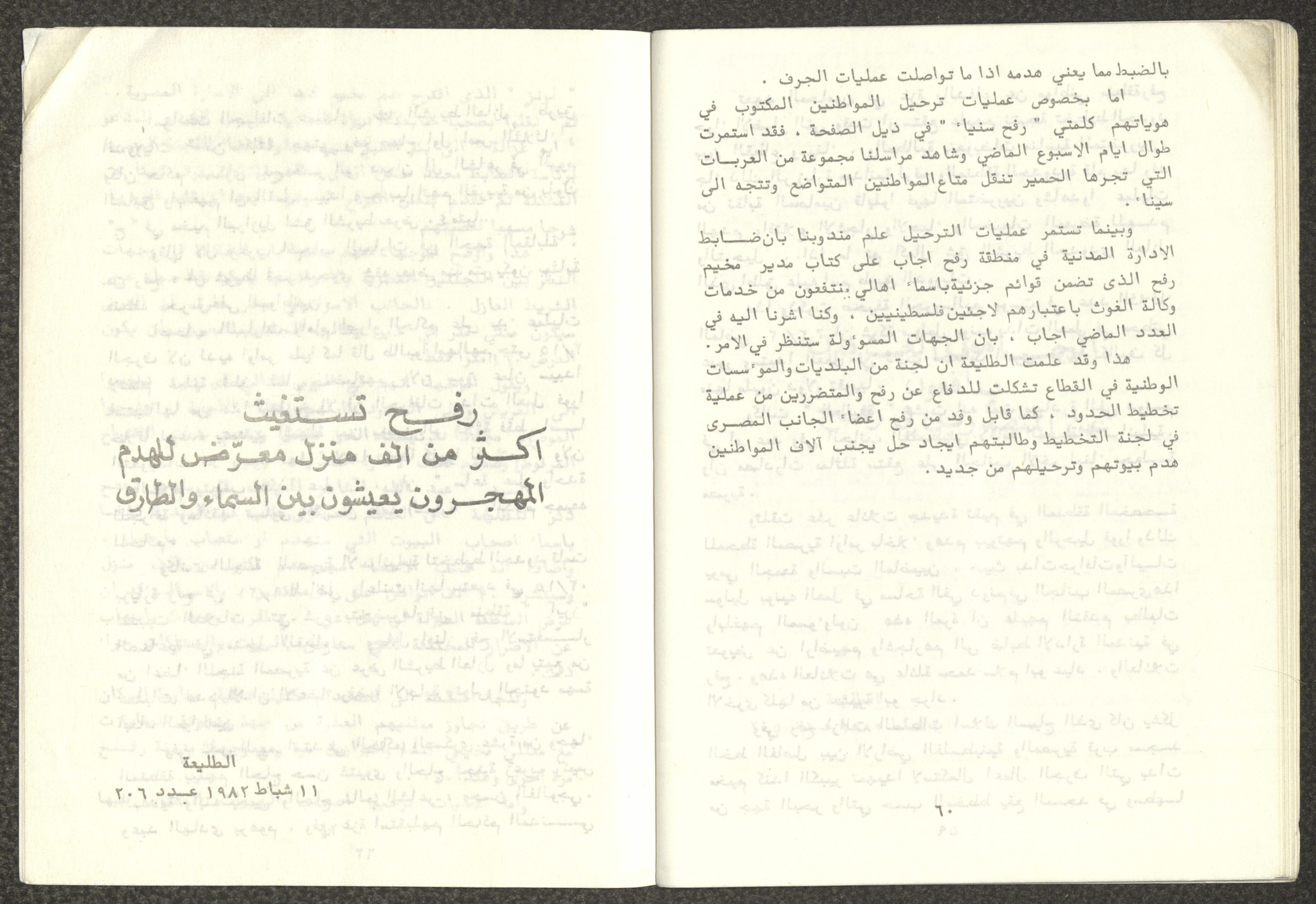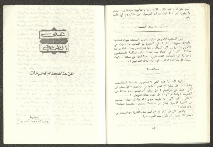 Issued by Attali'a Publications in February 1982, this one-time pamphlet is titled "Rafah, Victims of the Peace March" and it shows the history of the city of Rafah and its position in the Arab-Israeli conflict, it also contains several articles that were published in the various Attali'a issues during January and February of 1982.