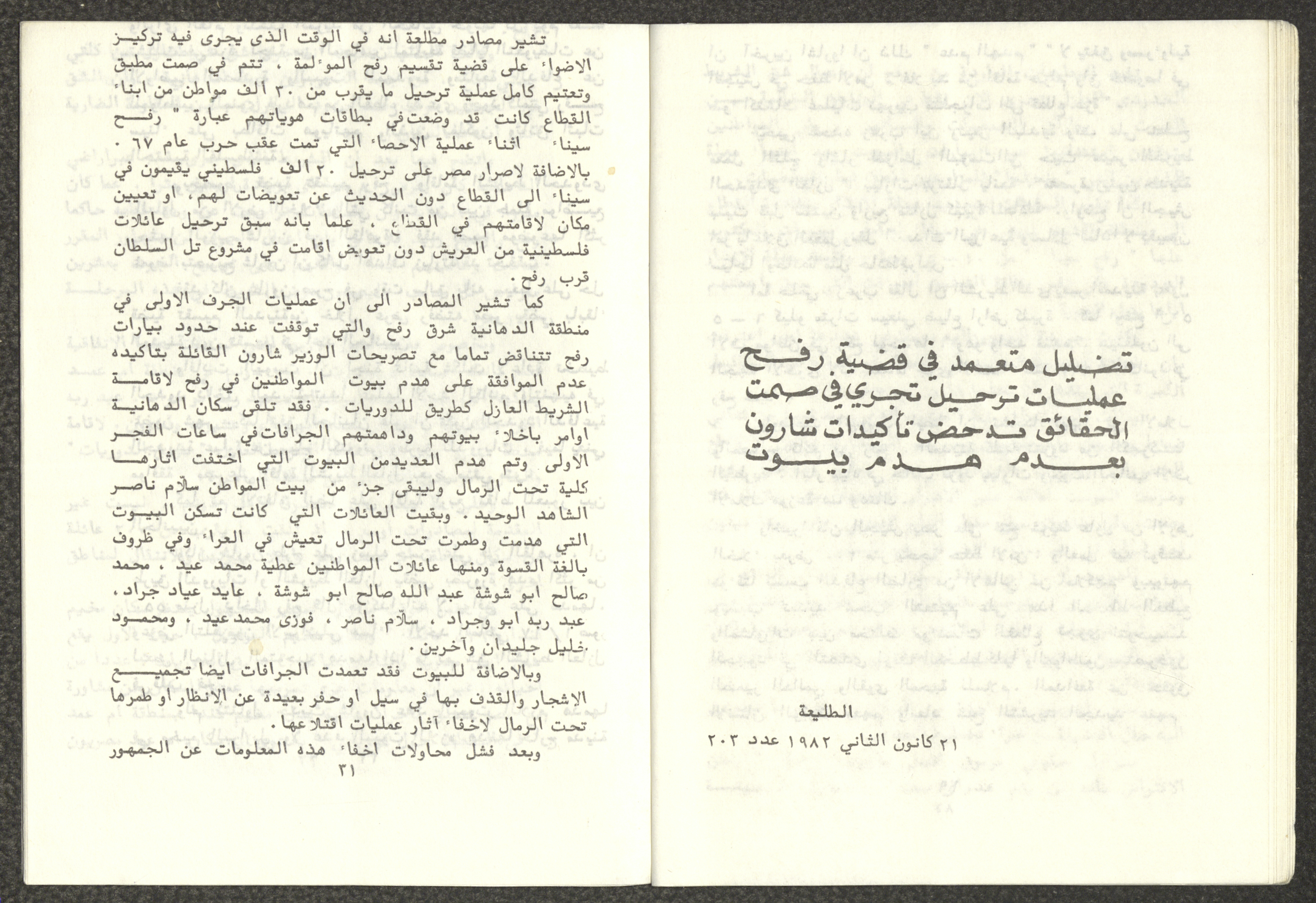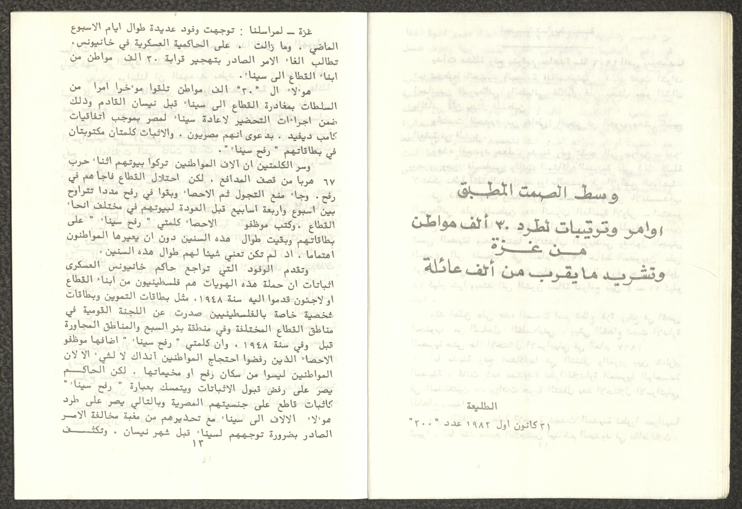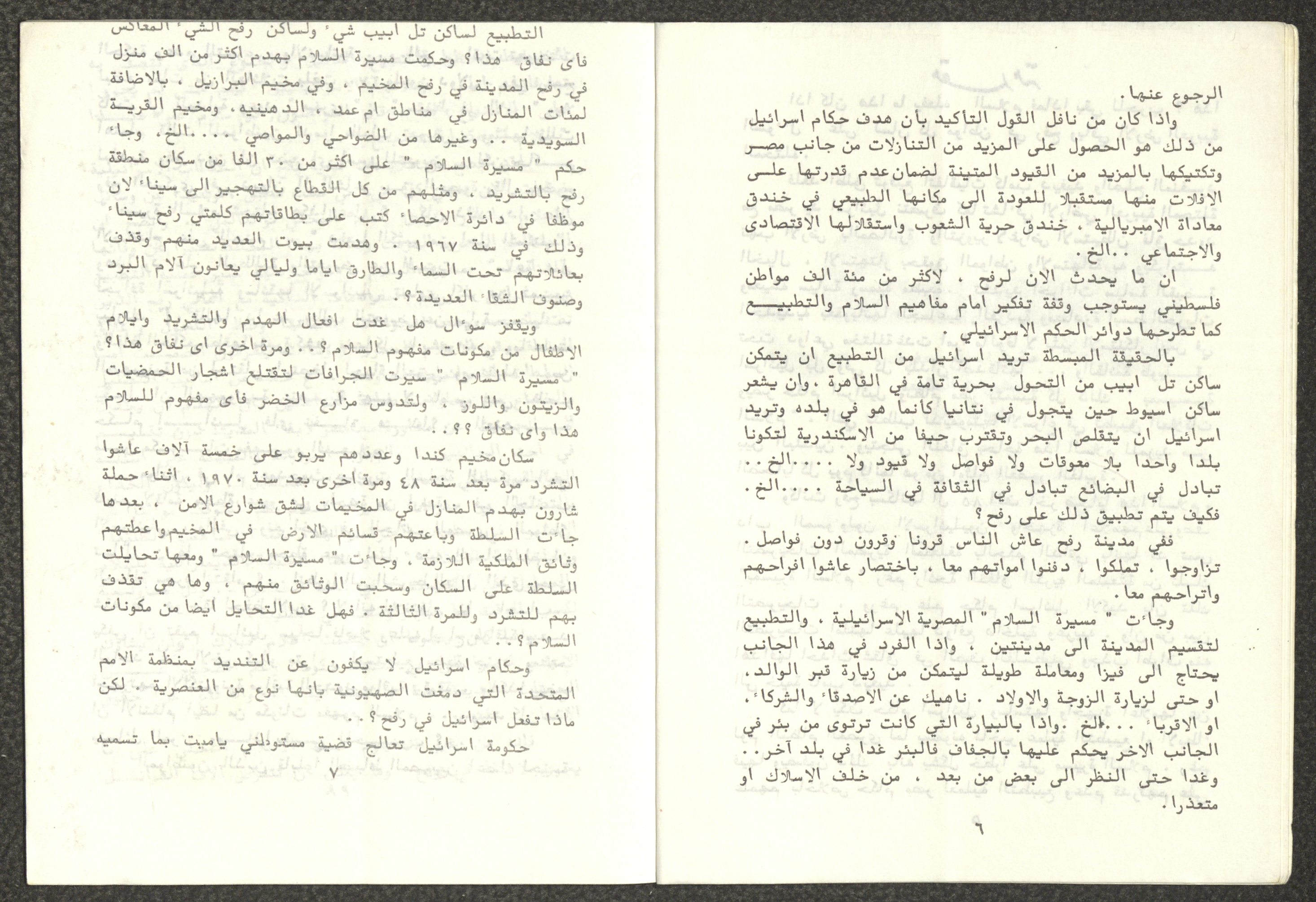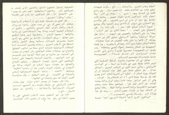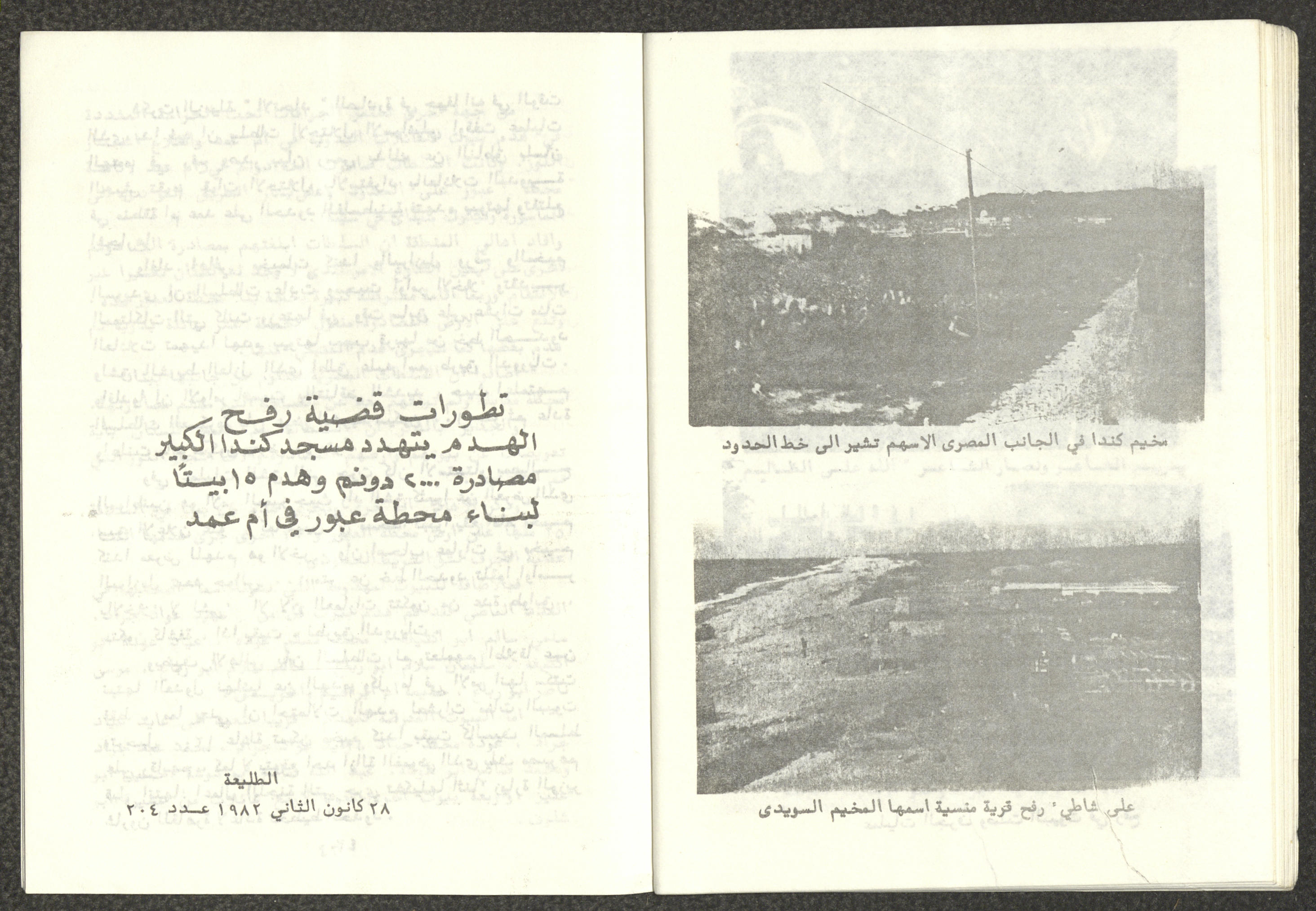 Issued by Attali'a Publications in February 1982, this one-time pamphlet is titled "Rafah, Victims of the Peace March" and it shows the history of the city of Rafah and its position in the Arab-Israeli conflict, it also contains several articles that were published in the various Attali'a issues during January and February of 1982.