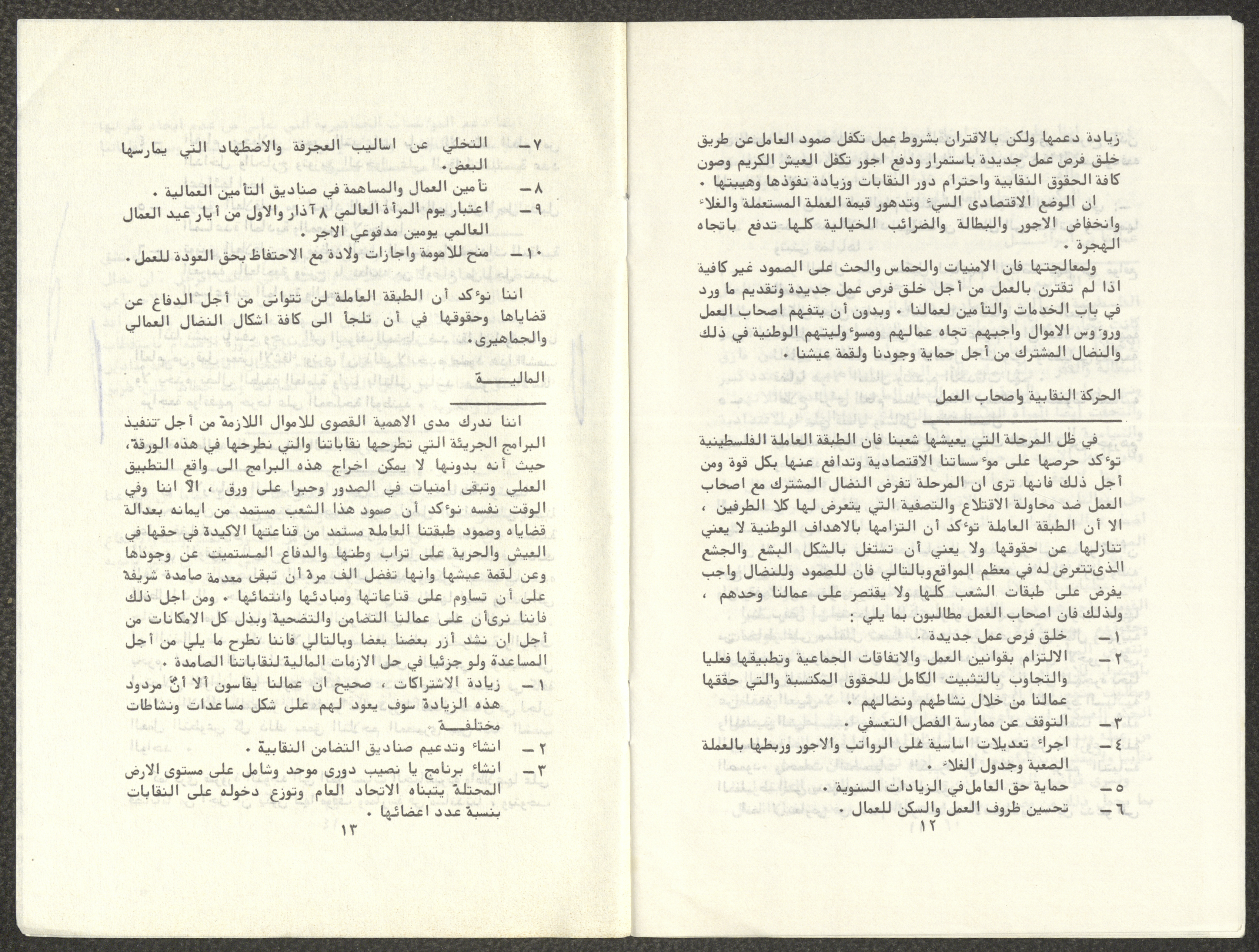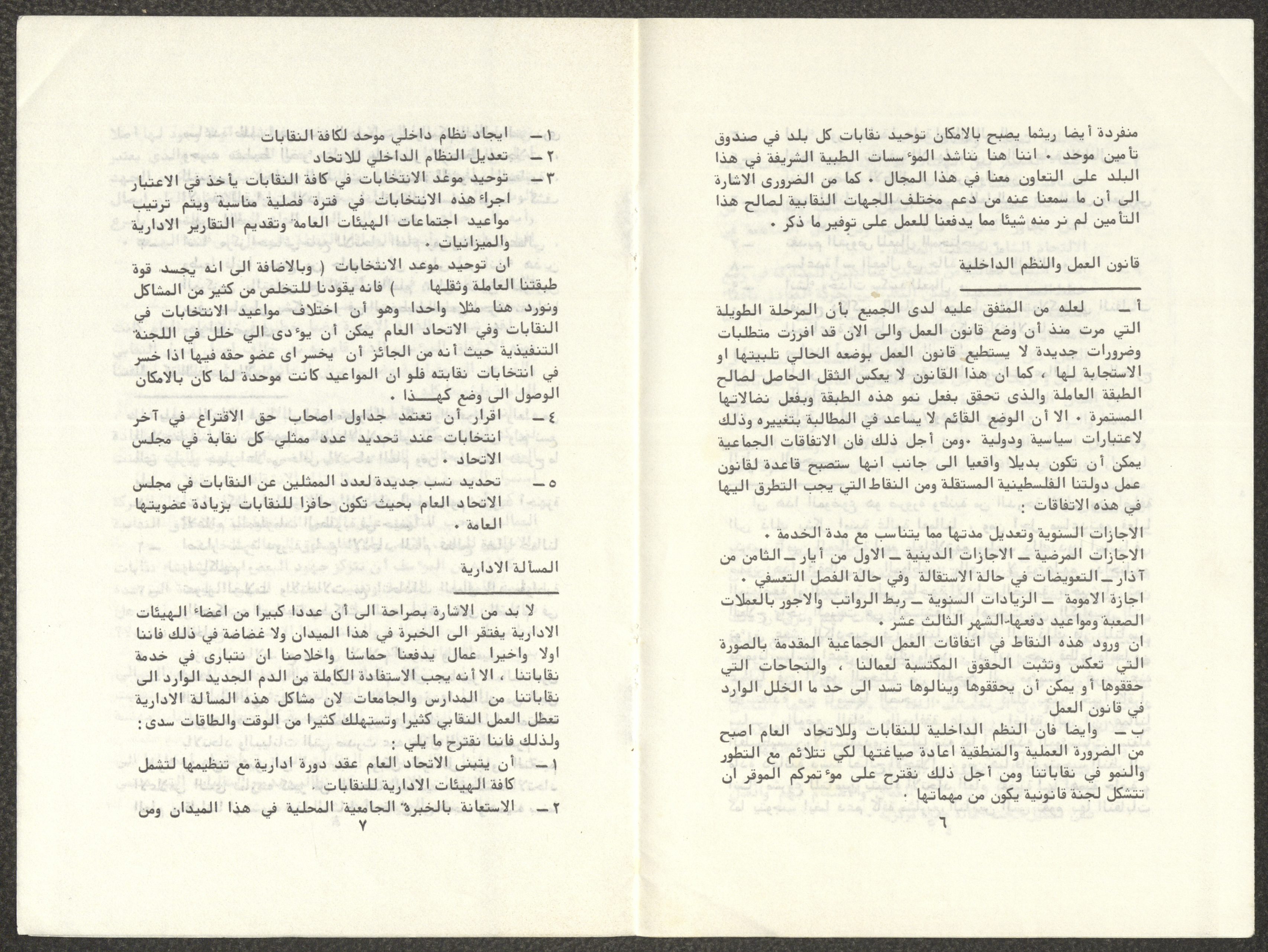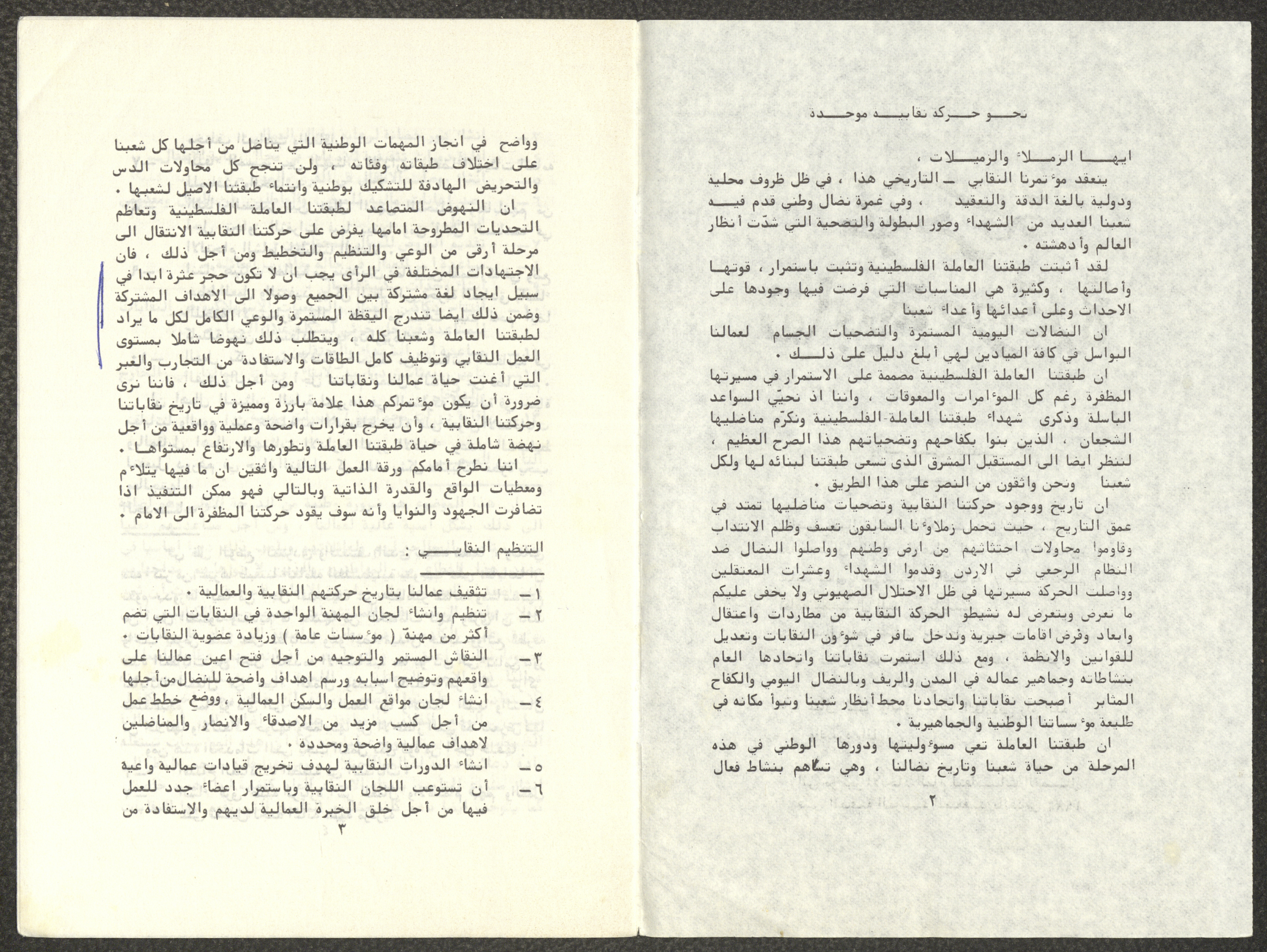 Titled "Towards a Unified Trade Union Movement", this working paper is by the General Carpentry Workers’ Union in Hebron, the Construction Workers’ Syndicate in Jerusalem, the Public Establishments Workers’ Syndicate in Bethlehem, the Construction Workers’ Syndicate in Nablus, the Public Establishments Workers’ Syndicate in Tulkarm, and the Workers’ Syndicate for Workers and Employees of Public Establishments and Free Professions in Jerusalem. The paper was presented to the Conference of the General Federation of Trade Unions in the West Bank and Gaza Strip, which was held in Jerusalem in 1982.