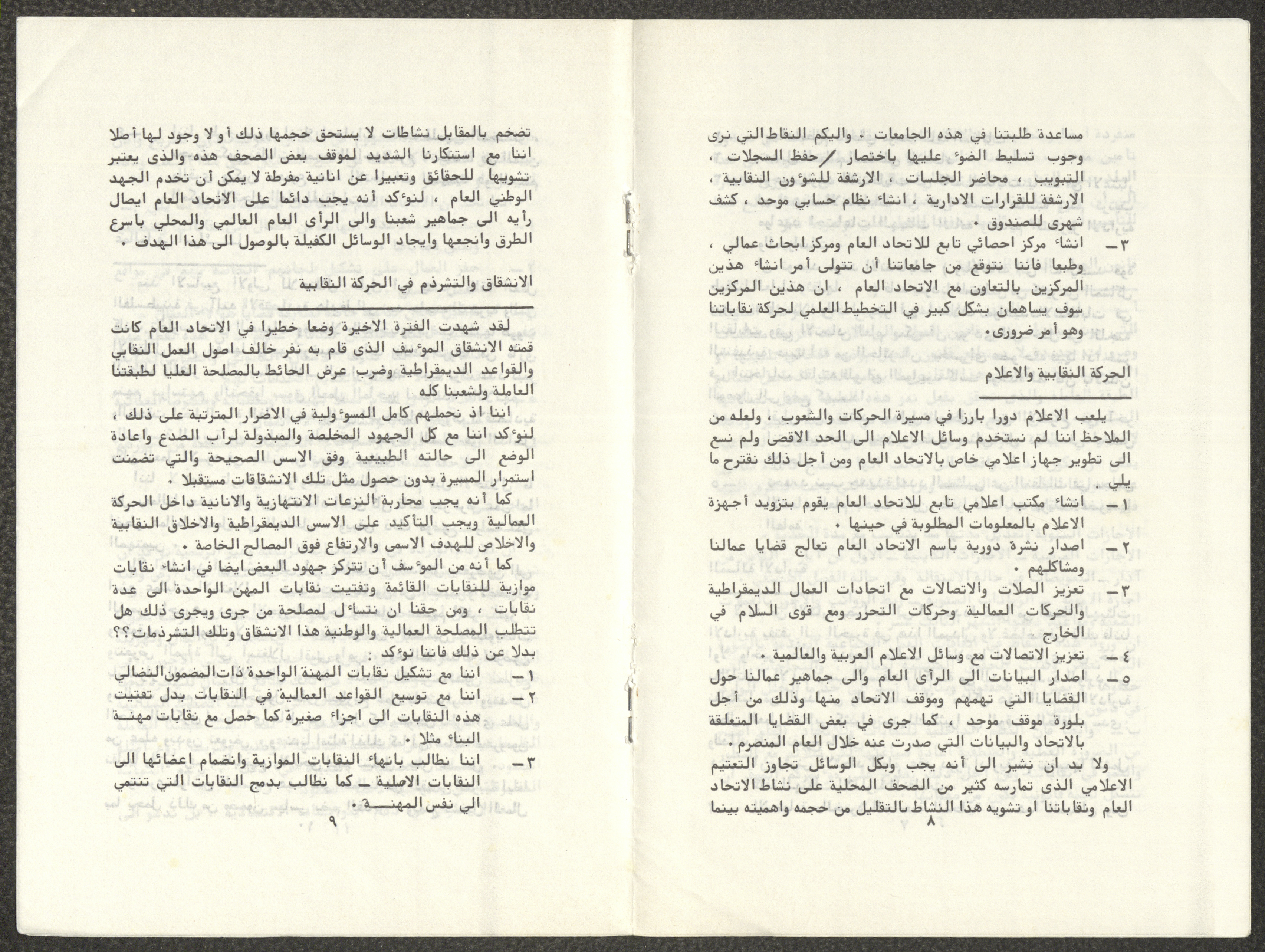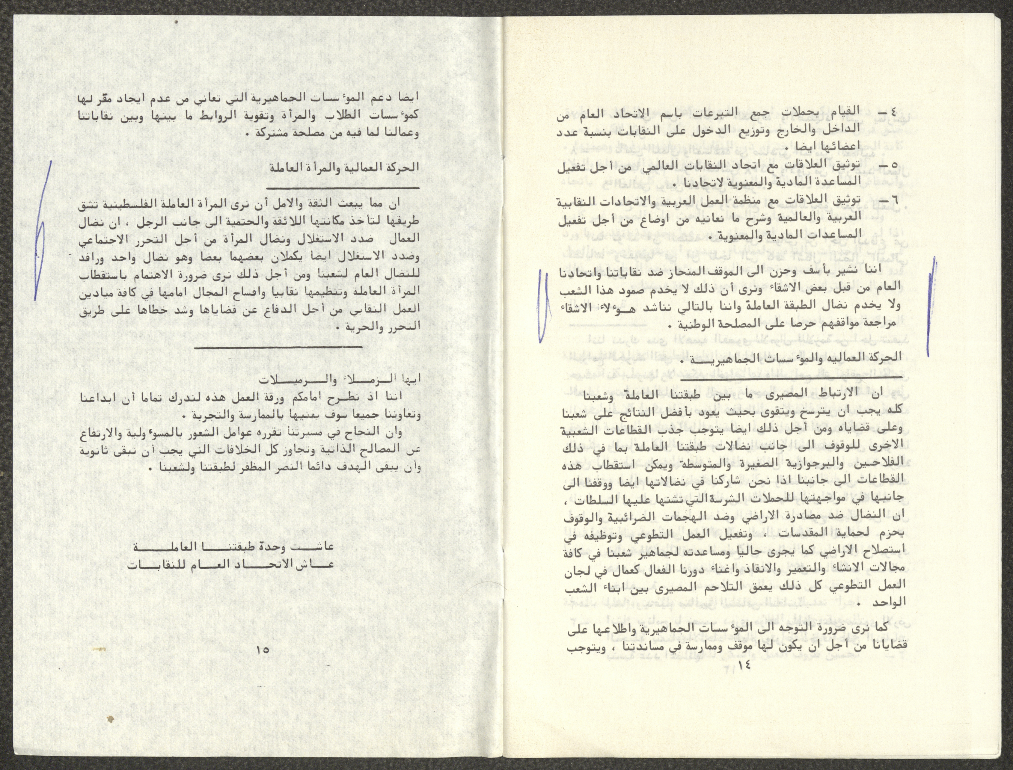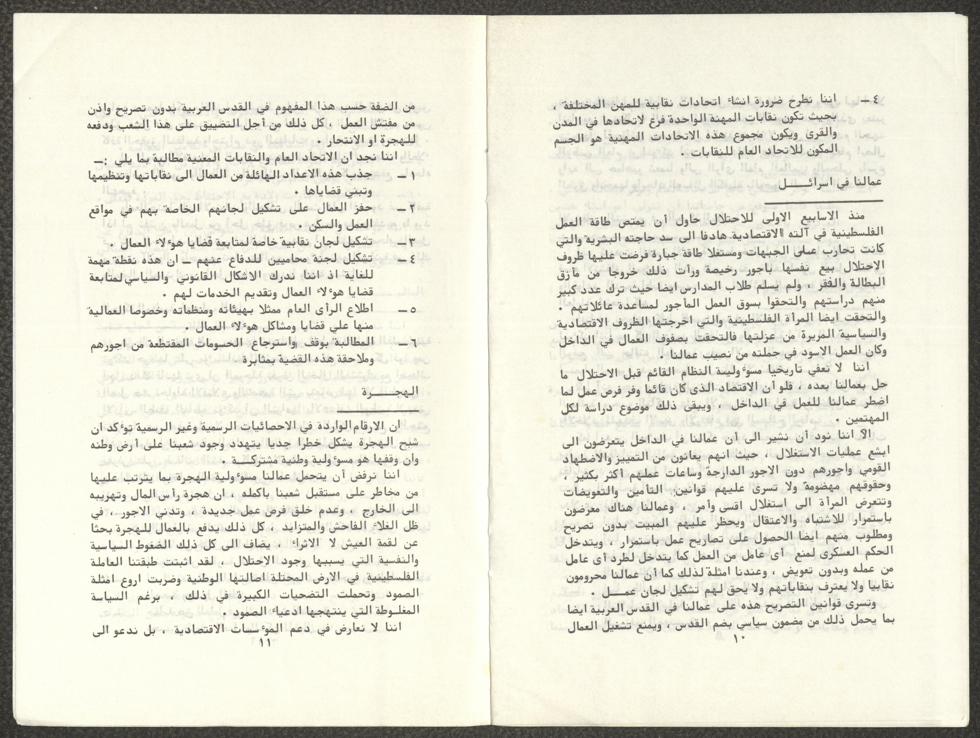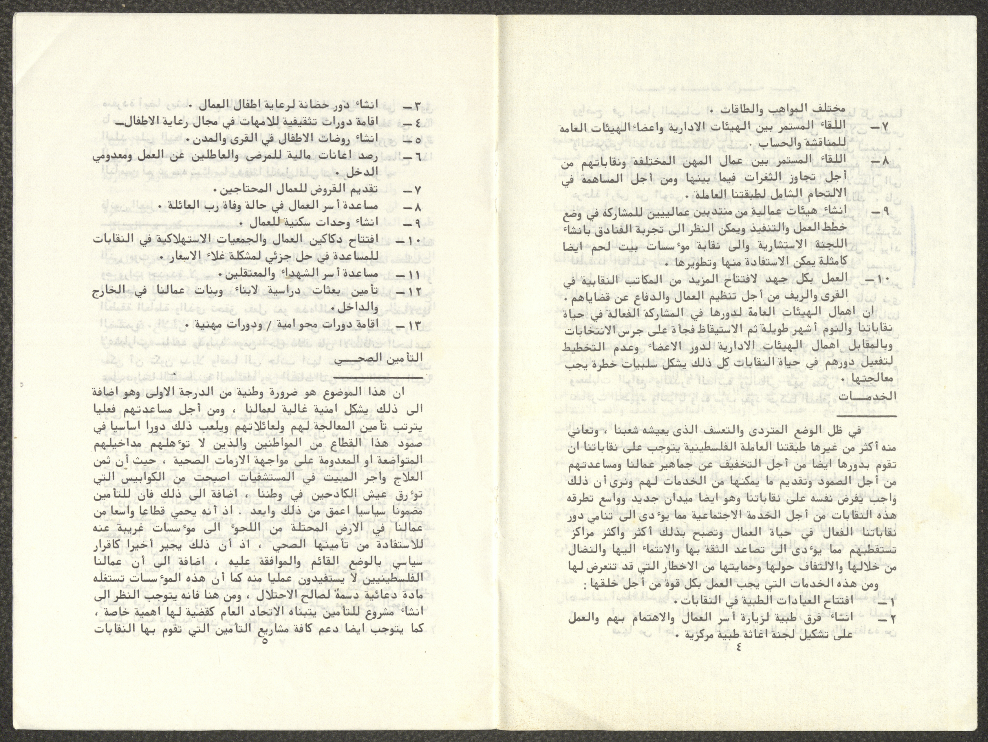 Titled "Towards a Unified Trade Union Movement", this working paper is by the General Carpentry Workers’ Union in Hebron, the Construction Workers’ Syndicate in Jerusalem, the Public Establishments Workers’ Syndicate in Bethlehem, the Construction Workers’ Syndicate in Nablus, the Public Establishments Workers’ Syndicate in Tulkarm, and the Workers’ Syndicate for Workers and Employees of Public Establishments and Free Professions in Jerusalem. The paper was presented to the Conference of the General Federation of Trade Unions in the West Bank and Gaza Strip, which was held in Jerusalem in 1982.