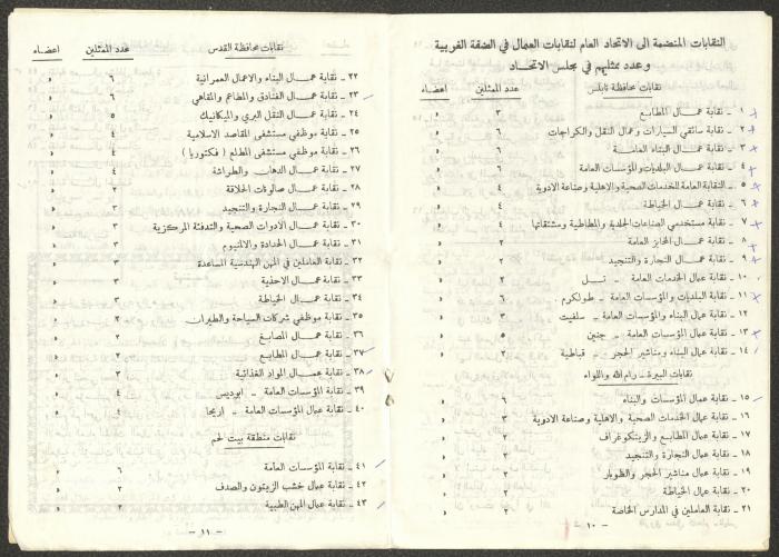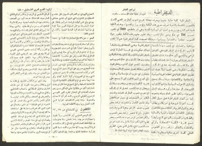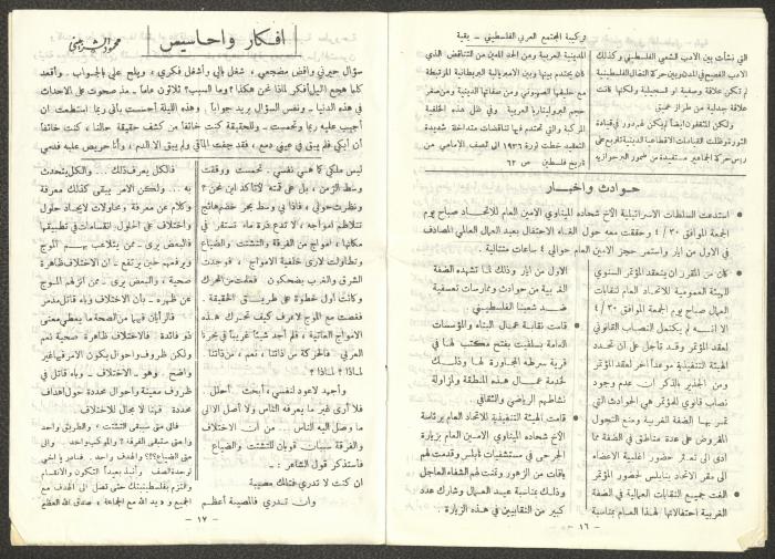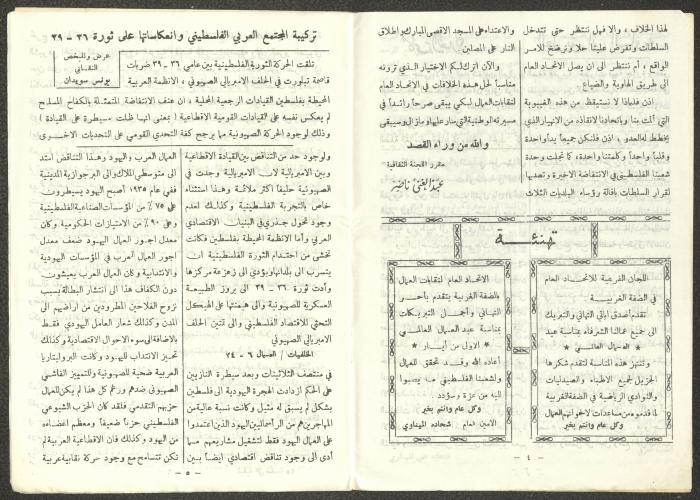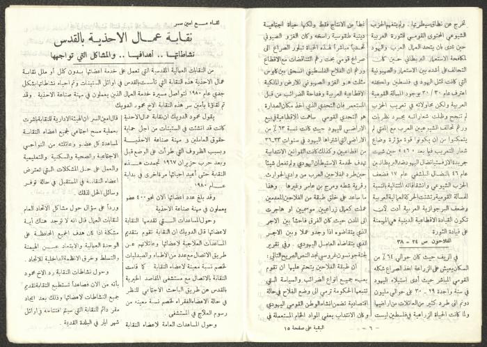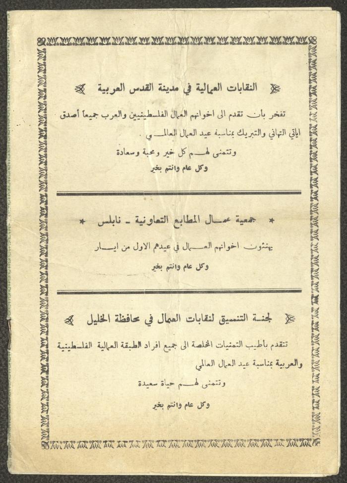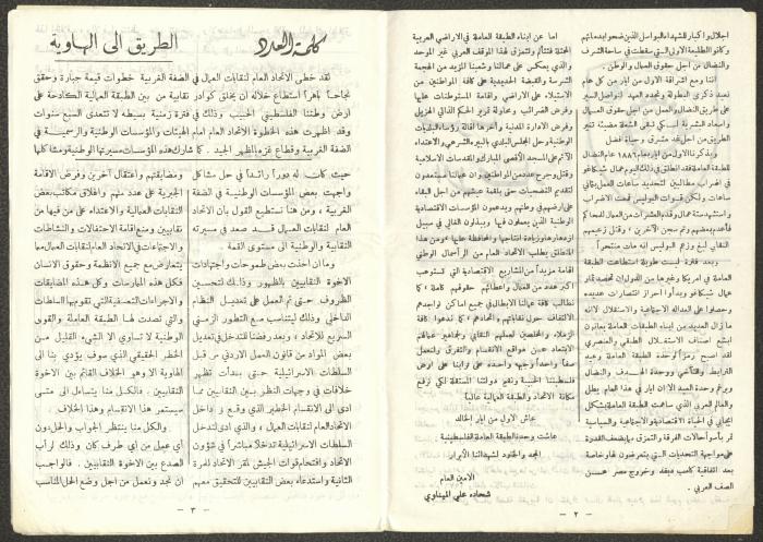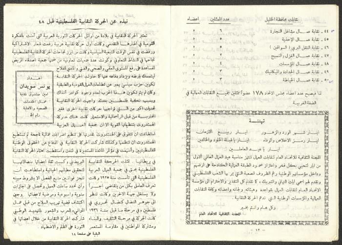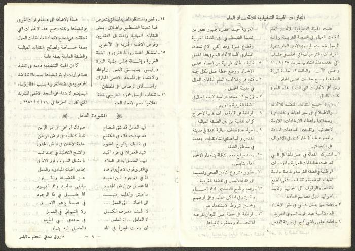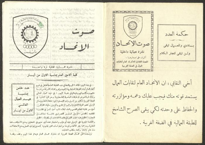 Issued by the General Federation of Trade Unions in Nablus under the supervision of the Cultural Committee of the General Federation of Trade Unions in the West Bank and Gaza, this one-time pamphlet is titled "The Voice of the Union" and it was issued to celebrate International Workers' Day and contained the following: 1. The speech of the Secretary-General of the Federation, Shehada al-Minawi, on the first of May. 2. The issue's speech titled "The Path to the Abyss" by Abdel-Ghani Nasser. 3. A study titled “The Structure of the Palestinian Arab Society and Its Reflections on the 36-39 Revolution” by the trade unionist Yousef Sweidan. 4. A meeting with the Secretary of the Shoe Workers Union in Jerusalem. 5. A summary of the most important achievements of the executive body of the General Federation of Trade Unions in the West Bank. 6. "The Worker's Song", a poem by Farouk Sidqi al-Lahham. 7. A list of the unions affiliated with the General Federation in the West Bank and several union representatives in the Federation Council. 8. A study titled "About the Palestinian Labour Movement Before 48" by Yousef Sweidan. 9. News about the Israeli Occupation Forces (IOF) harassment of union and union workers.