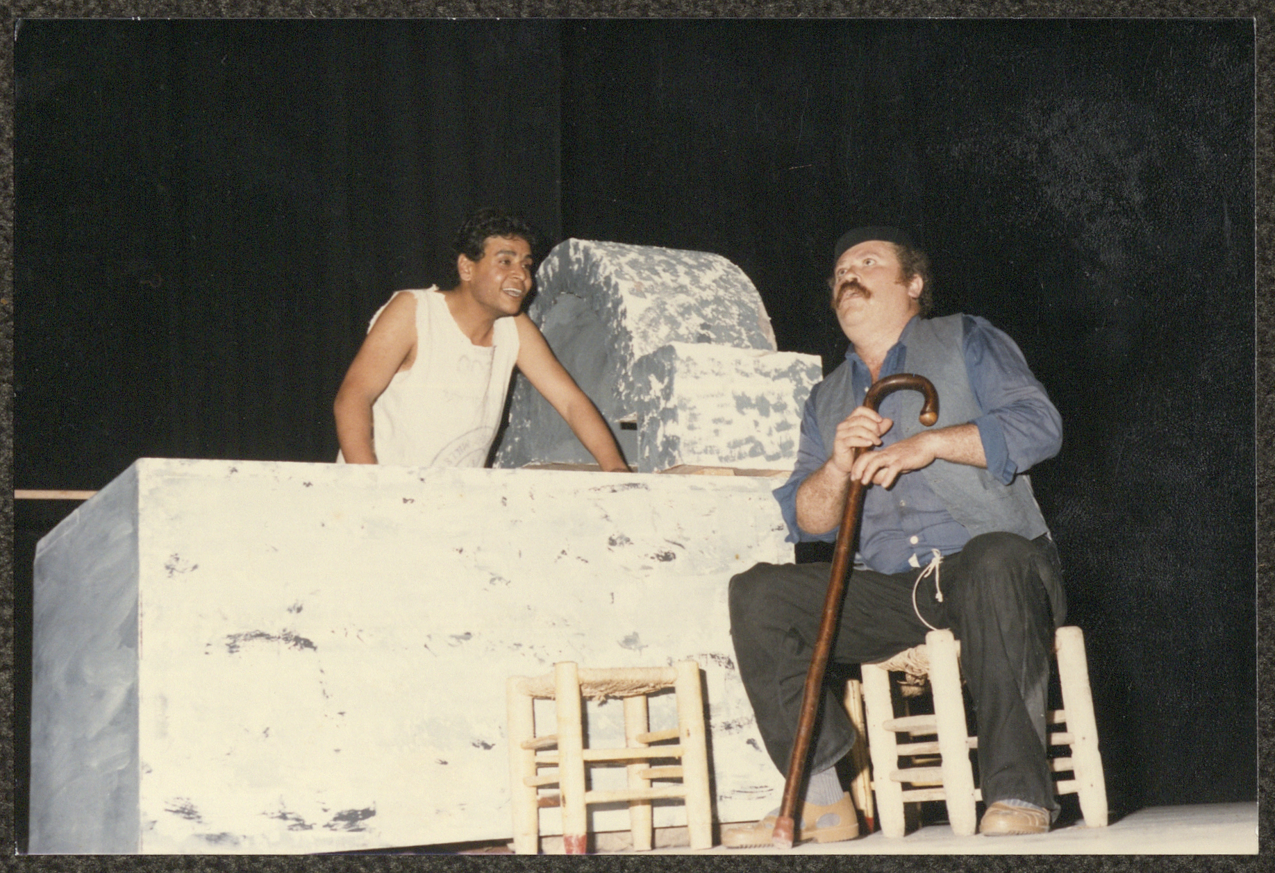 Undated, this photograph shows a scene from the "al-Ama Wal-Atrash (The Blind and the Deaf)" play including Adel Tartir as the blind man and in front of them is Darwish abu ar-Rish as the baker, originally derived from a novel by Ghassan Kanafani by the Wonder Box Theatre troupe and Balaleen (Balloons) troupe and directed by Akram al-Malki. Its first performance was on 30 May 1986 in al-Hakawati Theatre in Jerusalem after the text was edited and performed by several actors.
