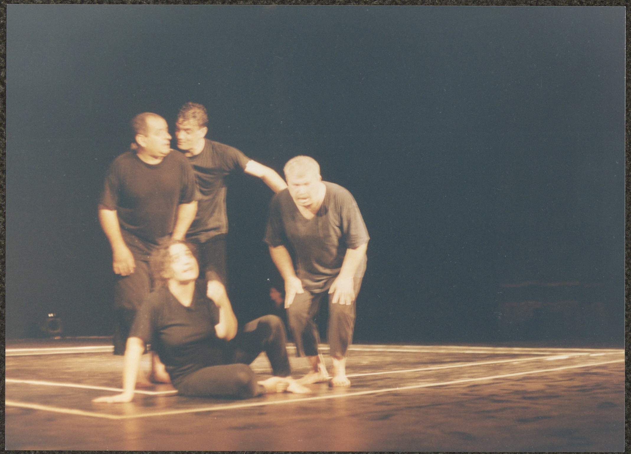 Taken on the Palestinian National Theatre- el-Hakawati stage in Jerusalem in 1999, this photograph shows a scene from the "Al-Shay' (The Thing)" play, directed by Yaqoub Ismail, derived from the "Al-Shayʼ al-Akhar (The Other Thing)" novel by Ghassan Kanafani, produced in cooperation with the el-Hakawati Theatre in Jerusalem and included Adel Tartir as a cast member.