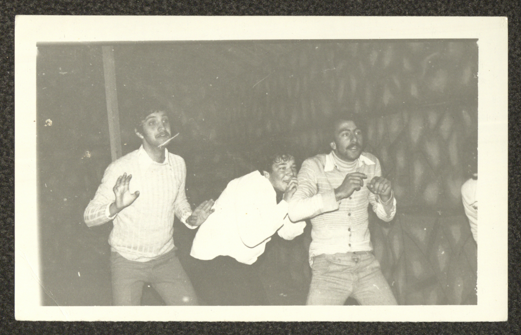 صورة غير مؤرخة التقطت من تدريبات مسرحية "تغريبة سعيد ابن فضل الله" في سرية رام الله الأولى، ويذكر أن هذه المسرحية هي ذات تأليف وإخراج جماعي من تنفيذ "فرقة صندوق العجب" في عام 1979.
