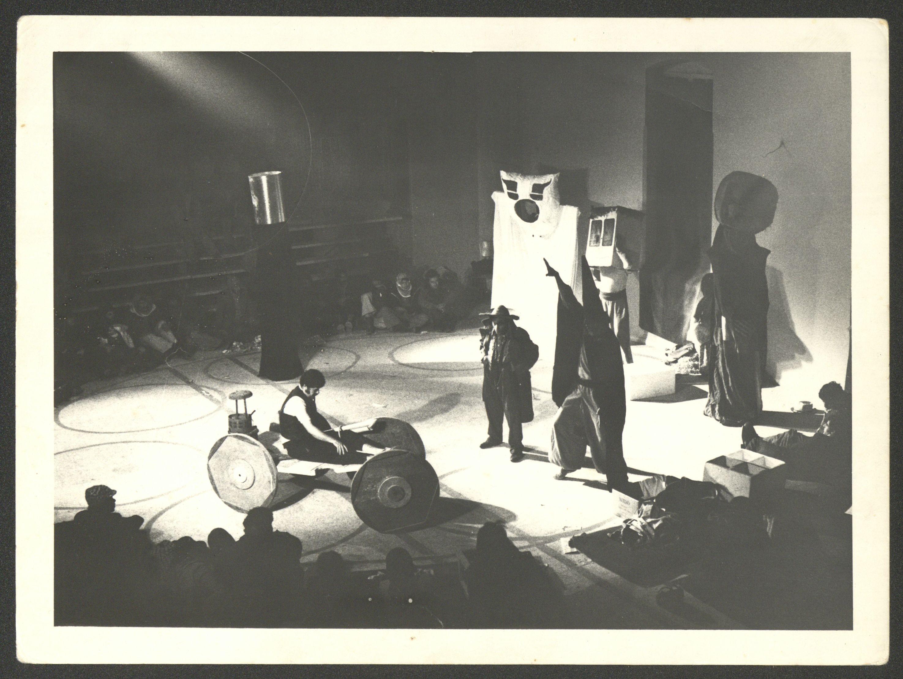 This photograph shows a scene from the "Lamma Enjanena (When We Went Mad)" play, which was produced by the "Wonder Box Theatre" in 1976 and performed at the Omariyah School hall in Jerusalem from 22 to 25 1976.