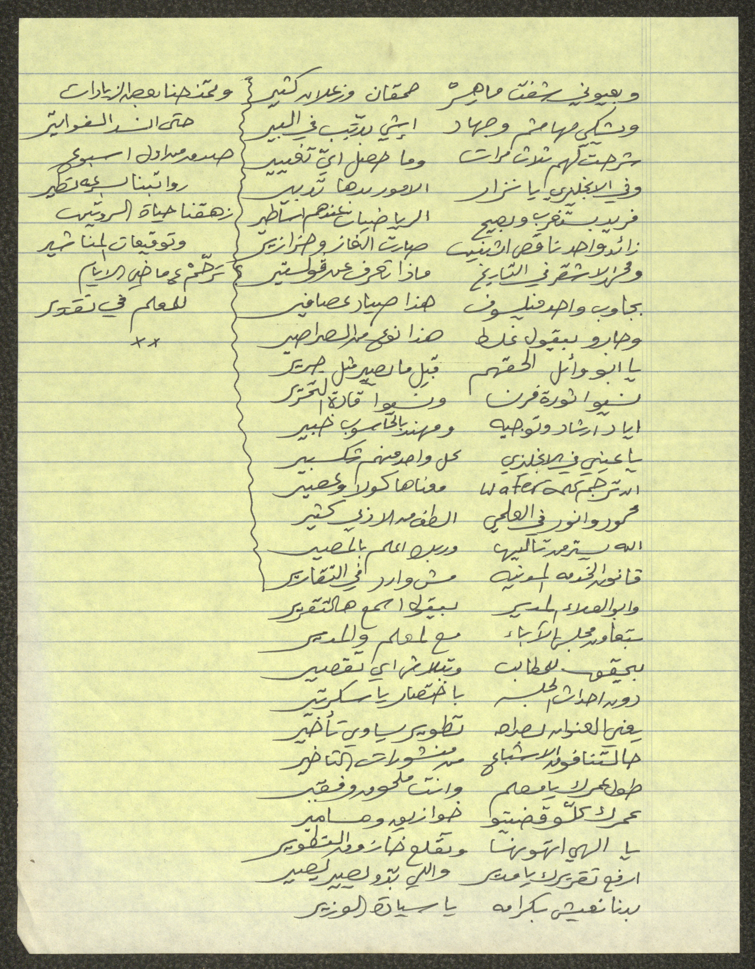 Handwritten by Njaeeb Sabri Yaaqba, this archival item documents the biography of the traditional poet Ahmad Naji Abdullah "Abu an-Naji", born at Kafr Ra'i village in Jenin on 5 February 1940. The document includes traditional poetry verses he used to perform at social and national events. It is worth mentioning that Yaaqba wrote down traditional poetry and the path and experiences of Zajjals from different Palestinian villages, refugee camps and cities to collect the legacy of the land's Zajal and Hida and to inform people of the notables of Palestinian traditional poetry.
