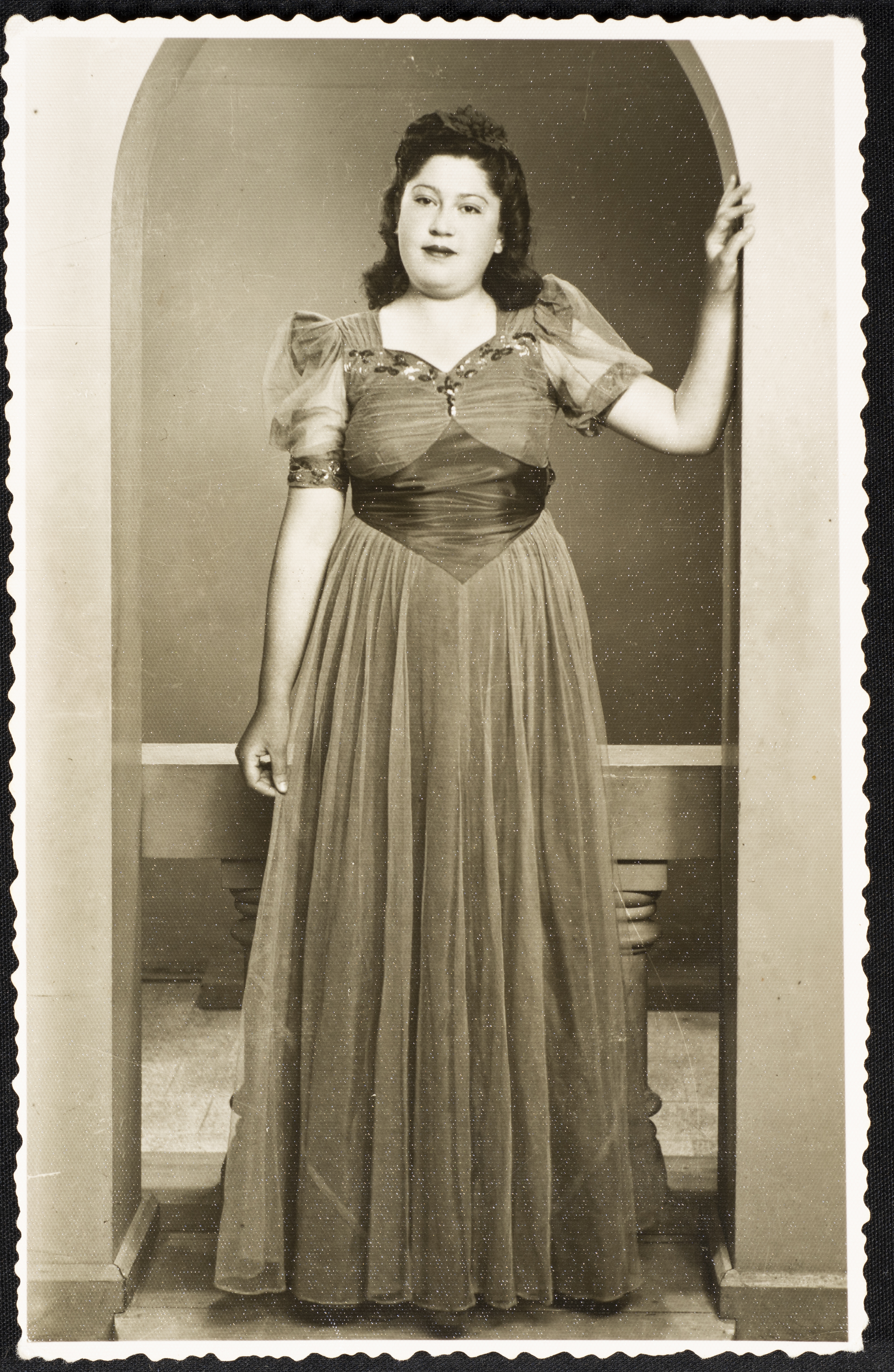 صورة التقطت في أوائل أربعينيات القرن العشرين للواحظ الجماعي الكناني الخطيب في فستان خطوبتها في استديو.