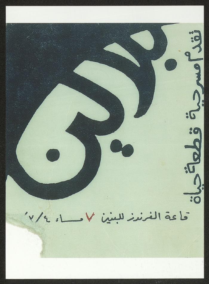 Found in the Adel Tartir Collection, this document shows an announcement by the Balaleen (Balloons) Troupe regarding "Qet’et Haya (A Shred of Life)" Play, performed at the auditorium of the Ramallah Friends Boys School on 4 March 1972, at 7:00 pm.