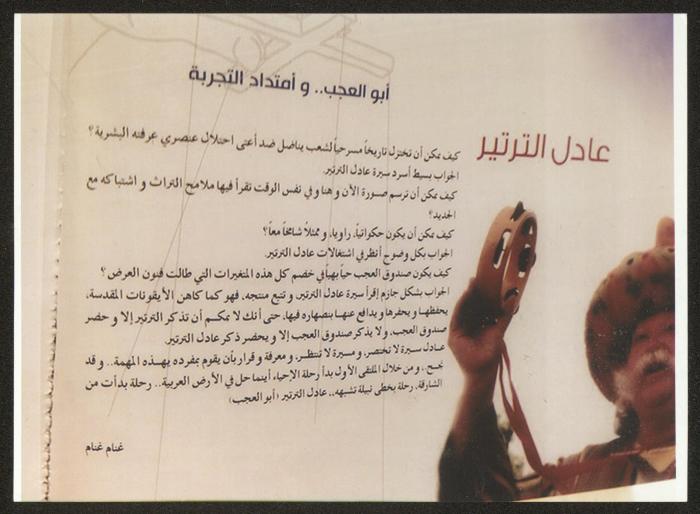 Taken between 29 October and 4 November 2015, this photograph shows one of the pages of the pamphlet for the third session of the Arab Forum for the Arts of Puppetry and Shadow, which includes an introduction about Adel Tartir, written by Ghannam Ghannam, while Tartir was a participant in the activities of this Forum and was honoured at the time in Egypt
