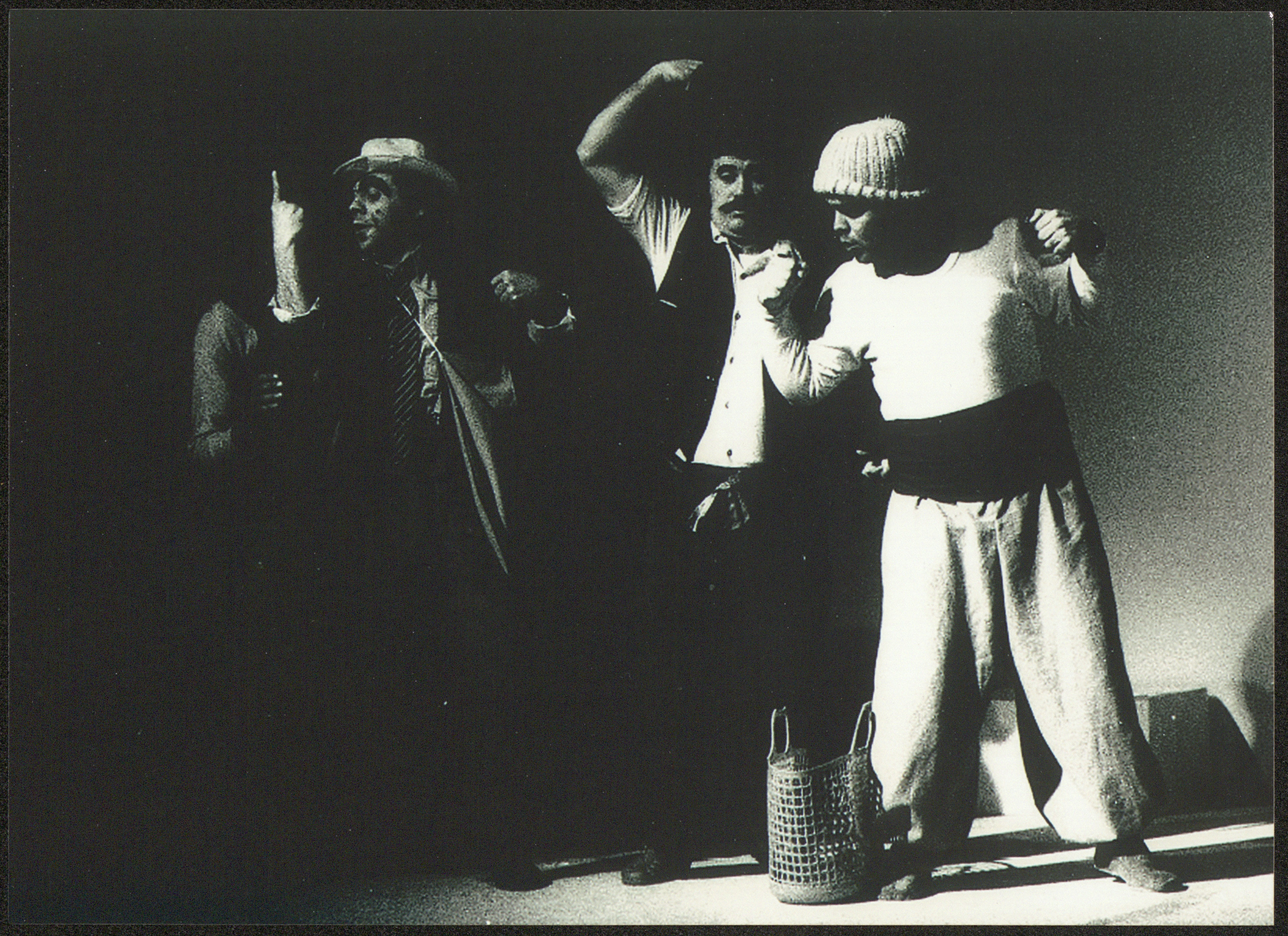 This photograph shows a scene from the "Lamma Enjanena (When We Went Mad)" Play including, from the right, Hussein Jum'a, Adel Tartir and Mustafa al-Kurd, where this play was produced by the Wonder Box Troupe.