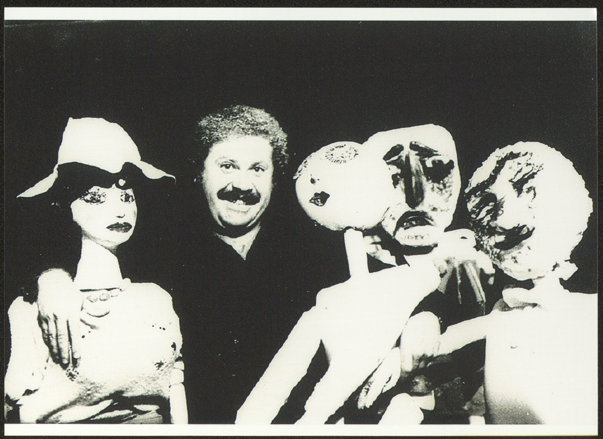 Undated, this photograph shows Adel Tartir with characters from the "Ras Roos (Head of Heads)" play, which is the first "monodrama" in the history of the Palestinian theatre movement, made by "The the Wonder Box Theatre" and written, acted and directed by Adel Tartir in June 1980.