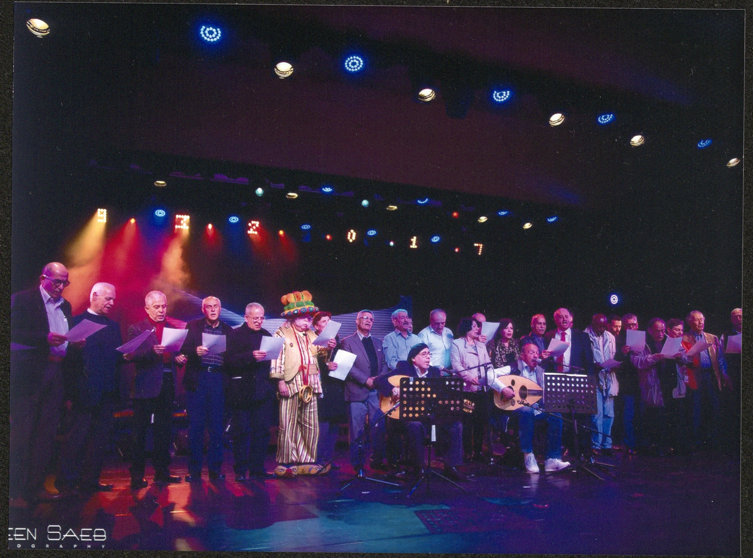 Taken during the Opening of the Municipal Theatre, a facility of the Ramallah Municipality, on 9 March 2017, this photograph shows a group of people performing the national anthem led by Jamal al-Sayeh, on the chair in the front row, and Mustafa al-Kurd, playing the oud, while Adel Tartir (aka Abu al-Ajab) is in their midst, who performed a show for the Balaleen Troupe and the Wonder Box Theatre.