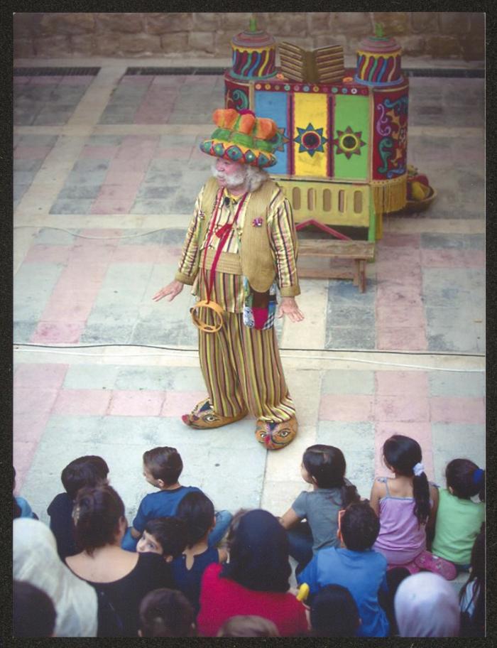 Taken at the Ottoman Court in Ramallah on 21 September 2017, this photograph shows Adel Tartir (aka Abu al-Ajab) performing one of his shows from "Hikayat Abu al-Ajab" for "Sunduq al-Ajab (the Wonder Box)" theatre during the activities of "Yalla Al Hadeeqa" Festival.