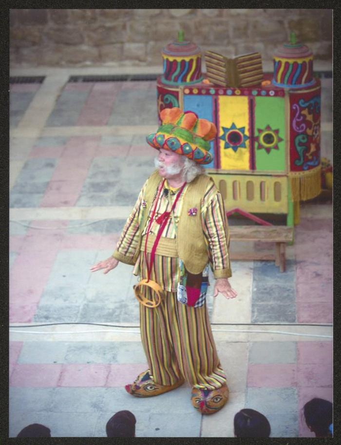 Taken at the Ottoman Court in Ramallah on 21 September 2017, this photograph shows Adel Tartir (aka Abu al-Ajab) performing one of his shows from "Hikayat Abu al-Ajab" for "Sunduq al-Ajab (the Wonder Box)" theatre during the activities of "Yalla Al Hadeeqa" Festival.