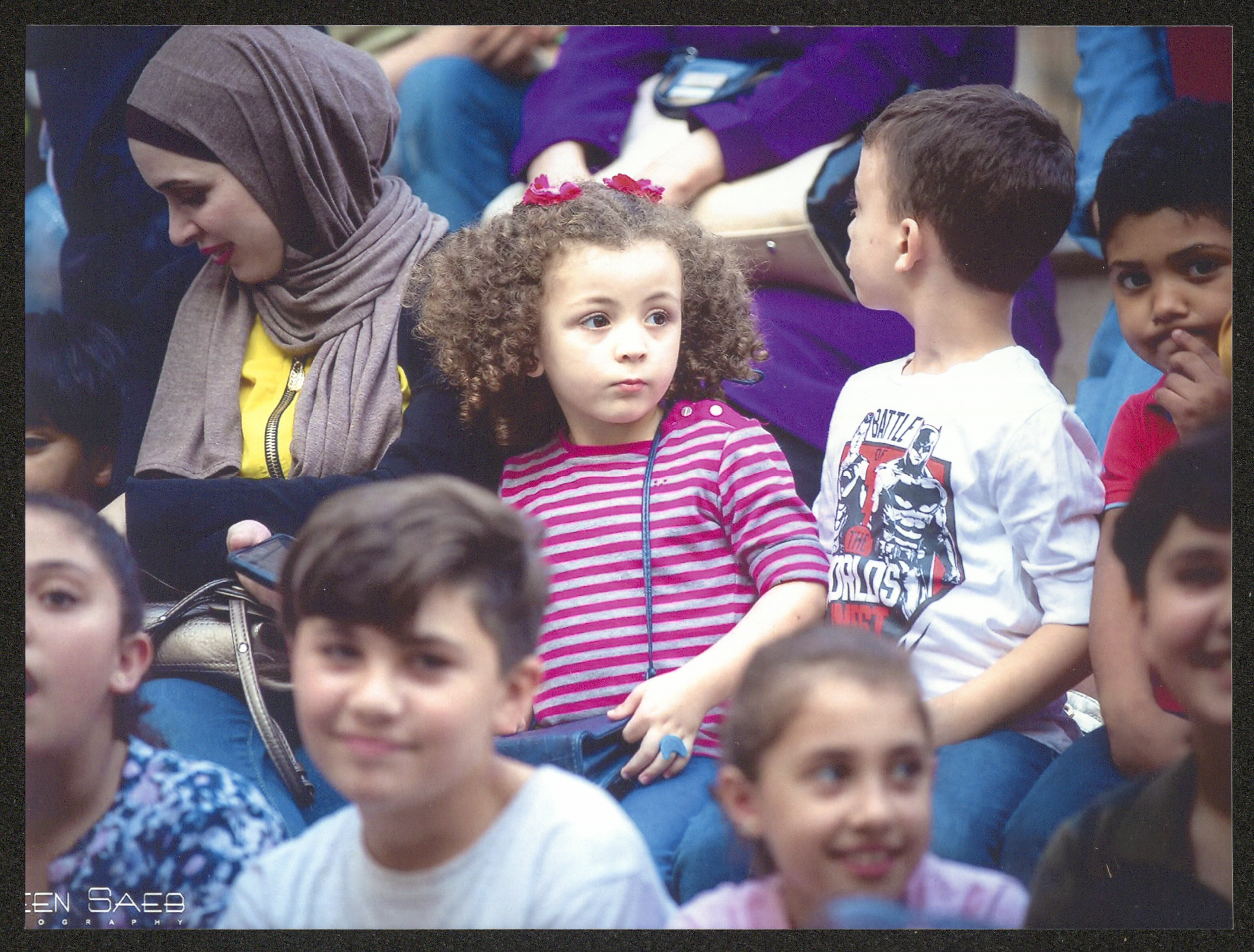 Taken by Amin Sa'eb at the Ottoman Court in Ramallah on 21 September 2017, this photograph shows a girl at the Abu al-Ajab show from "Hikayat Abu al-Ajab" for "Sunduq al-Ajab (the Wonder Box)" theatre during the activities of "Yalla Al Hadeeqa" Festival.