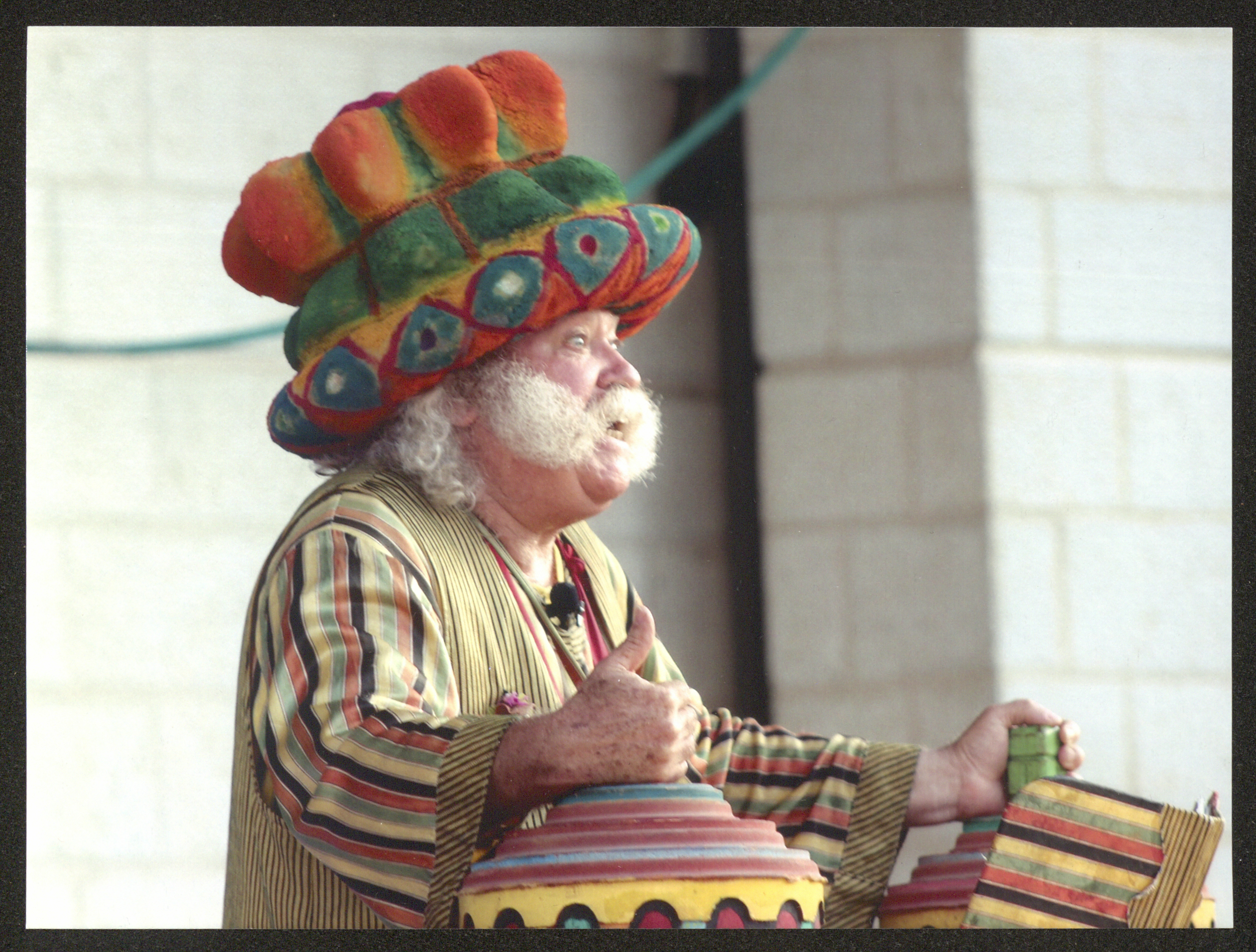 Taken on the municipal stage in Ramallah on 25 August 2017, this photograph shows Adel Tartir (aka Abu al-Ajab) during a performance of the "Hikayat abu al-Ajab Series" Show for the "Sundouq al-Ajab (the Wonder Box)" theatre, as part of his participation in the "Al-Harajeh Market", a popular market organized by the Ramallah Municipality.